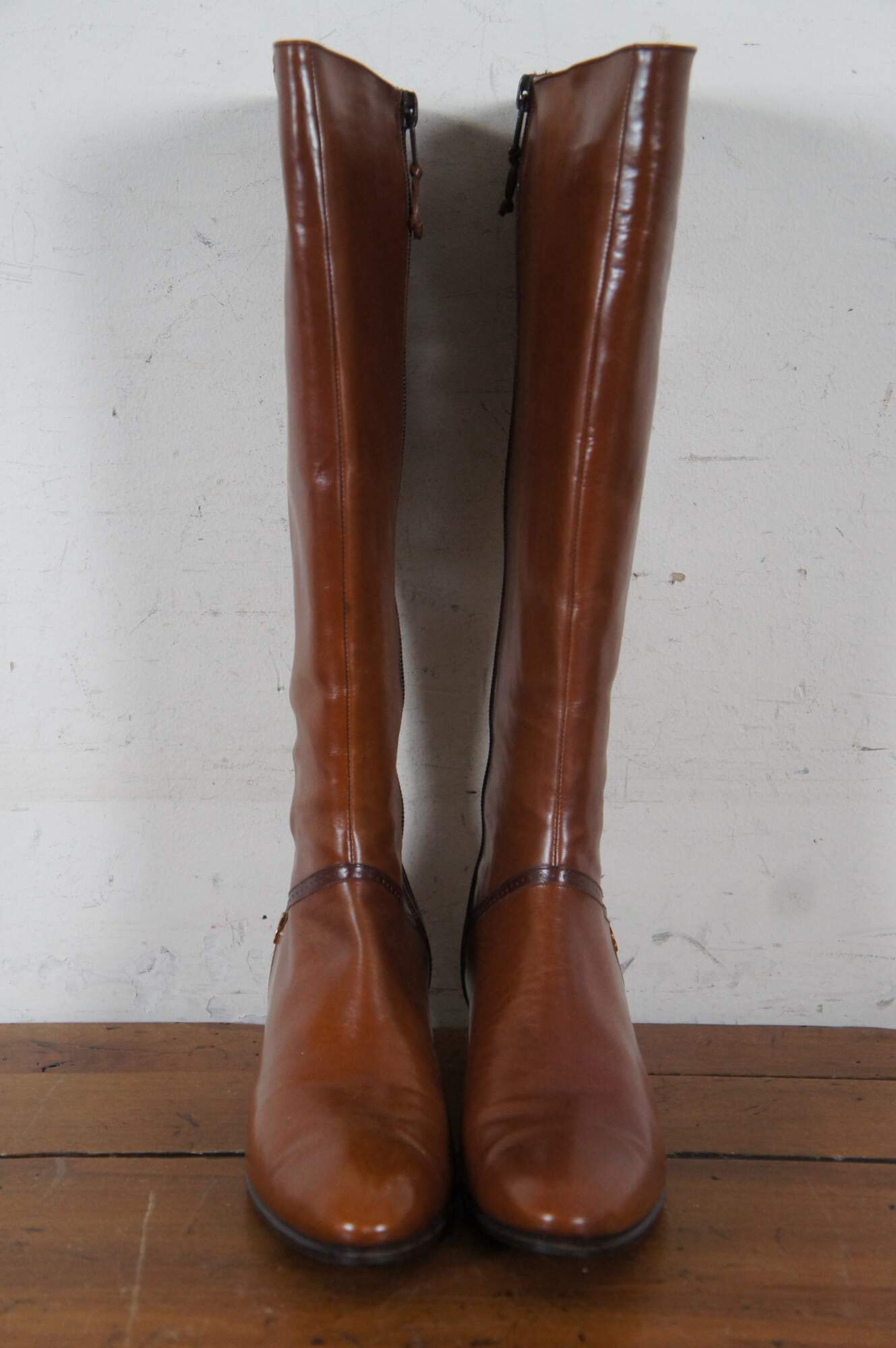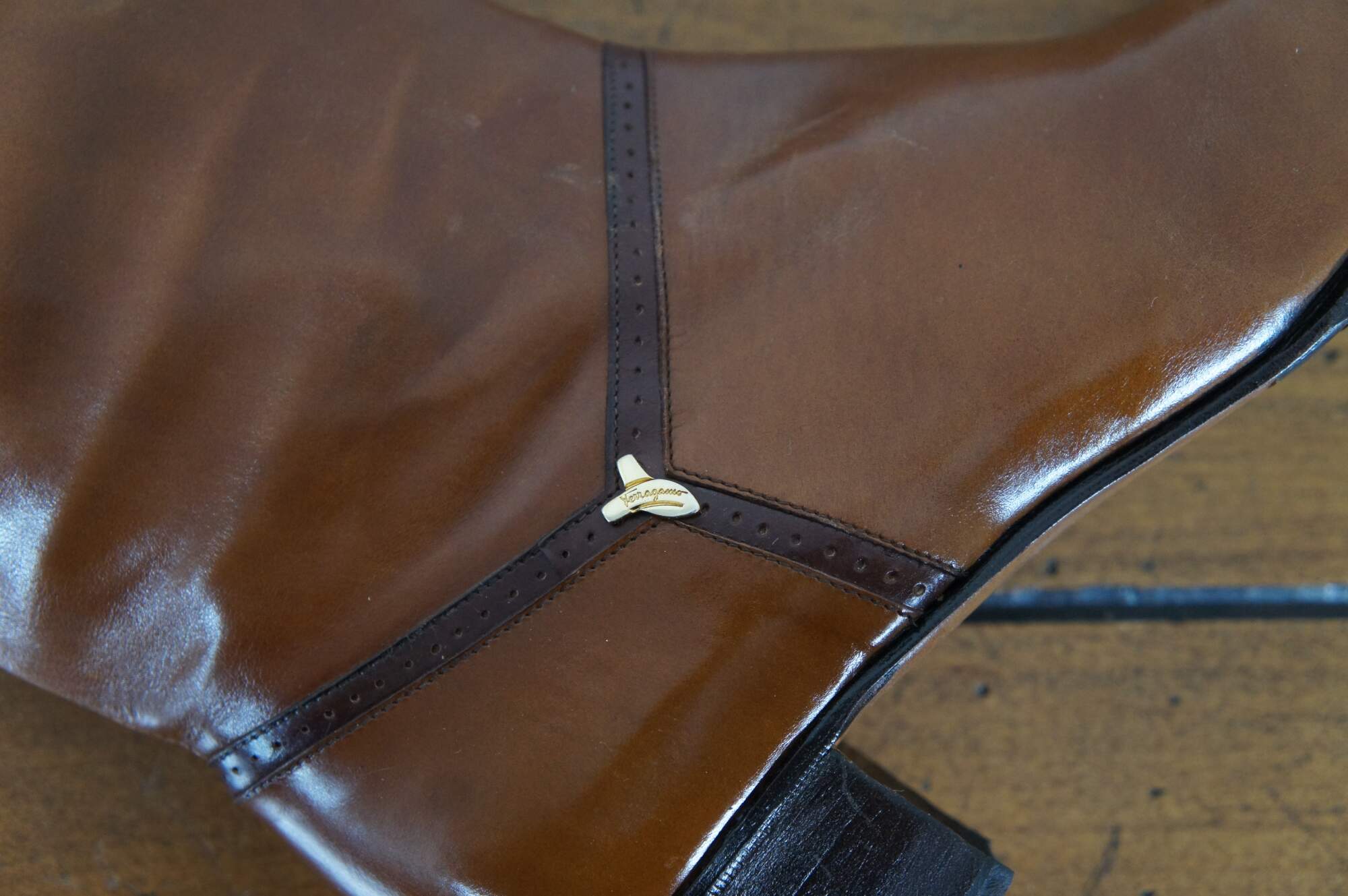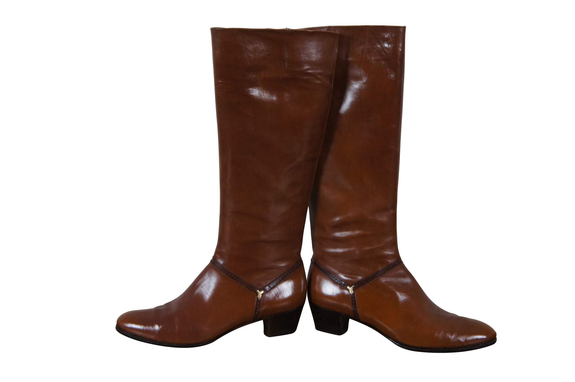 Vintage pair of tall riding boots by Salvatore Ferragamo in Rallina brown calf leather. Made in Italy. Original box included. Size 6.5 AAA. DFU 1544