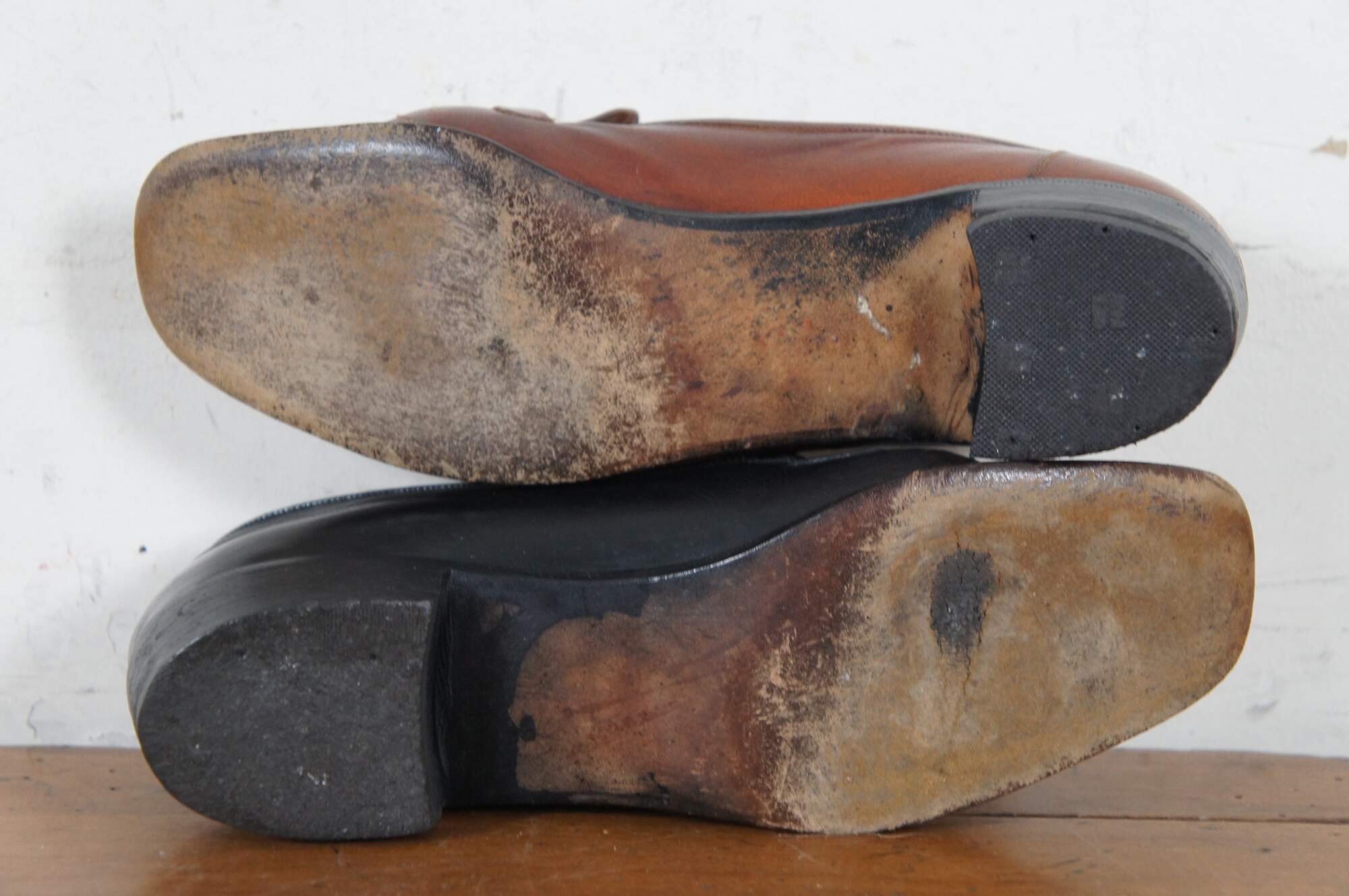 Two pairs of Fenton Last Saks Fifth Avenue loafers in black and brown leather with buckle accents. Made in Switzerland.