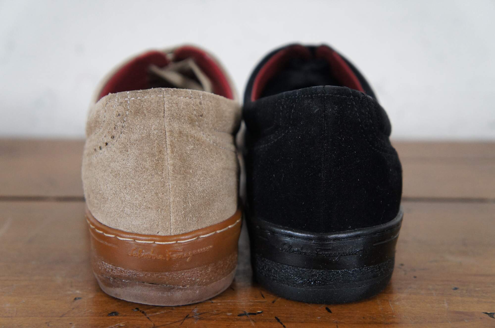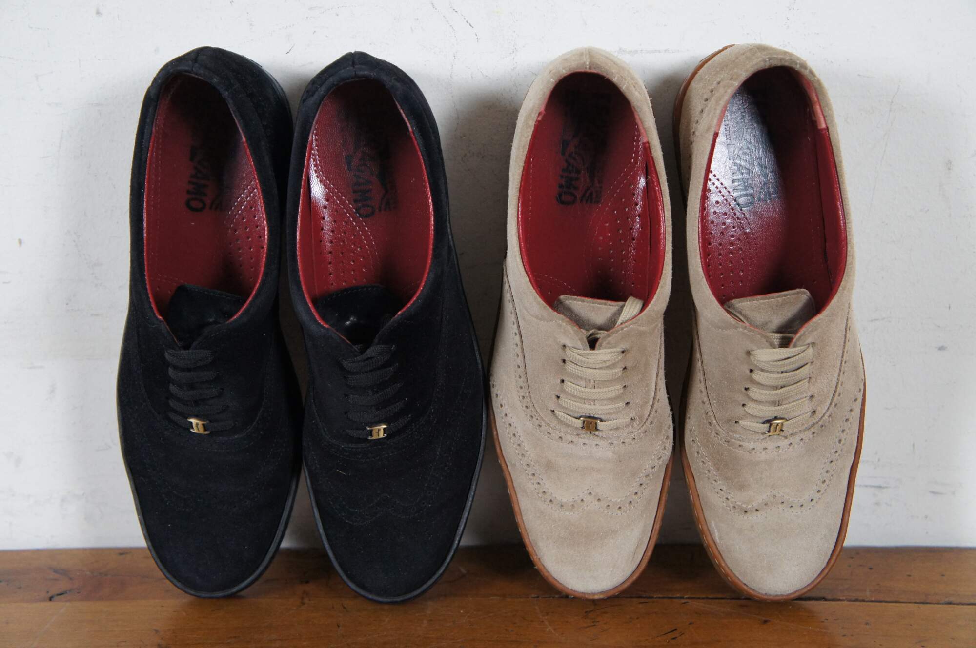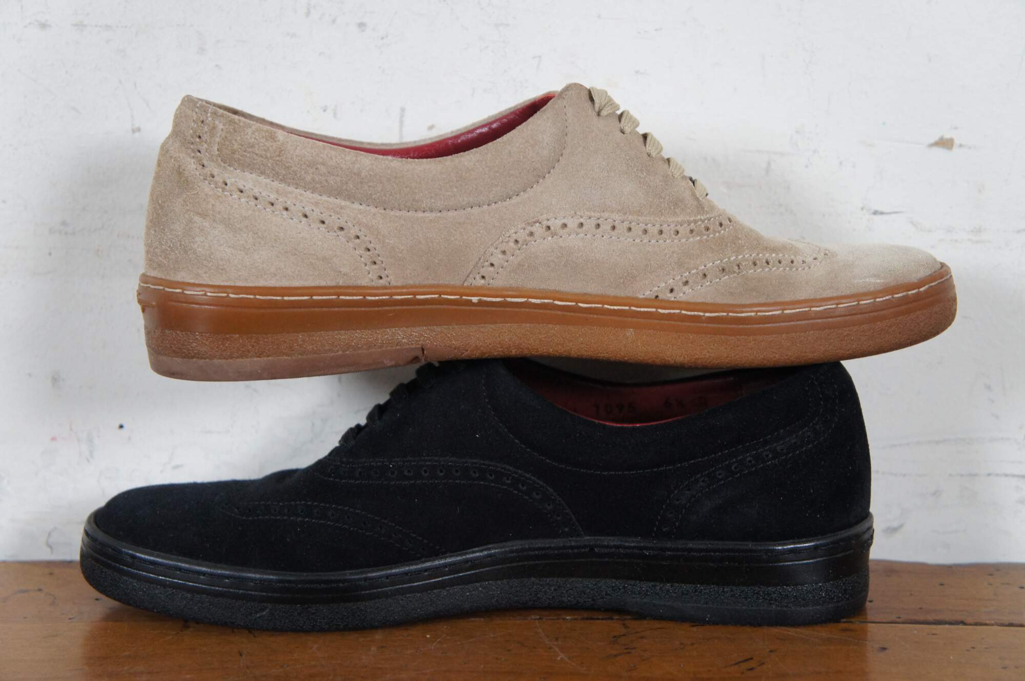 Two vintage pairs of Salvatore Ferragamo Montana tennis shoes in brouge design with suede buc calf leather. In black nero and taupe quartz / tan. Size 6.5 AAAA. Made in Italy. MSRP $225 each. Wingtip, Oxford.
