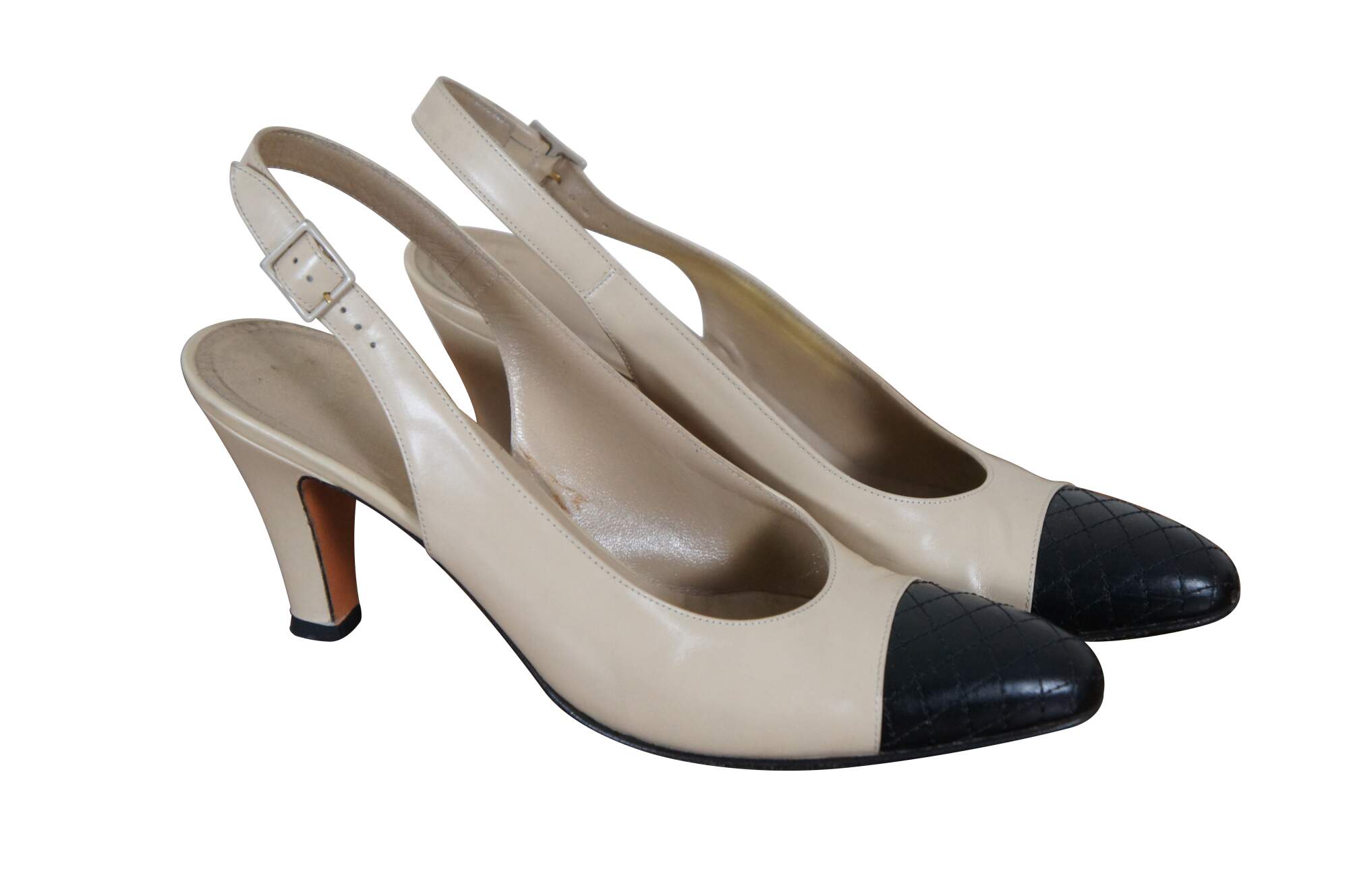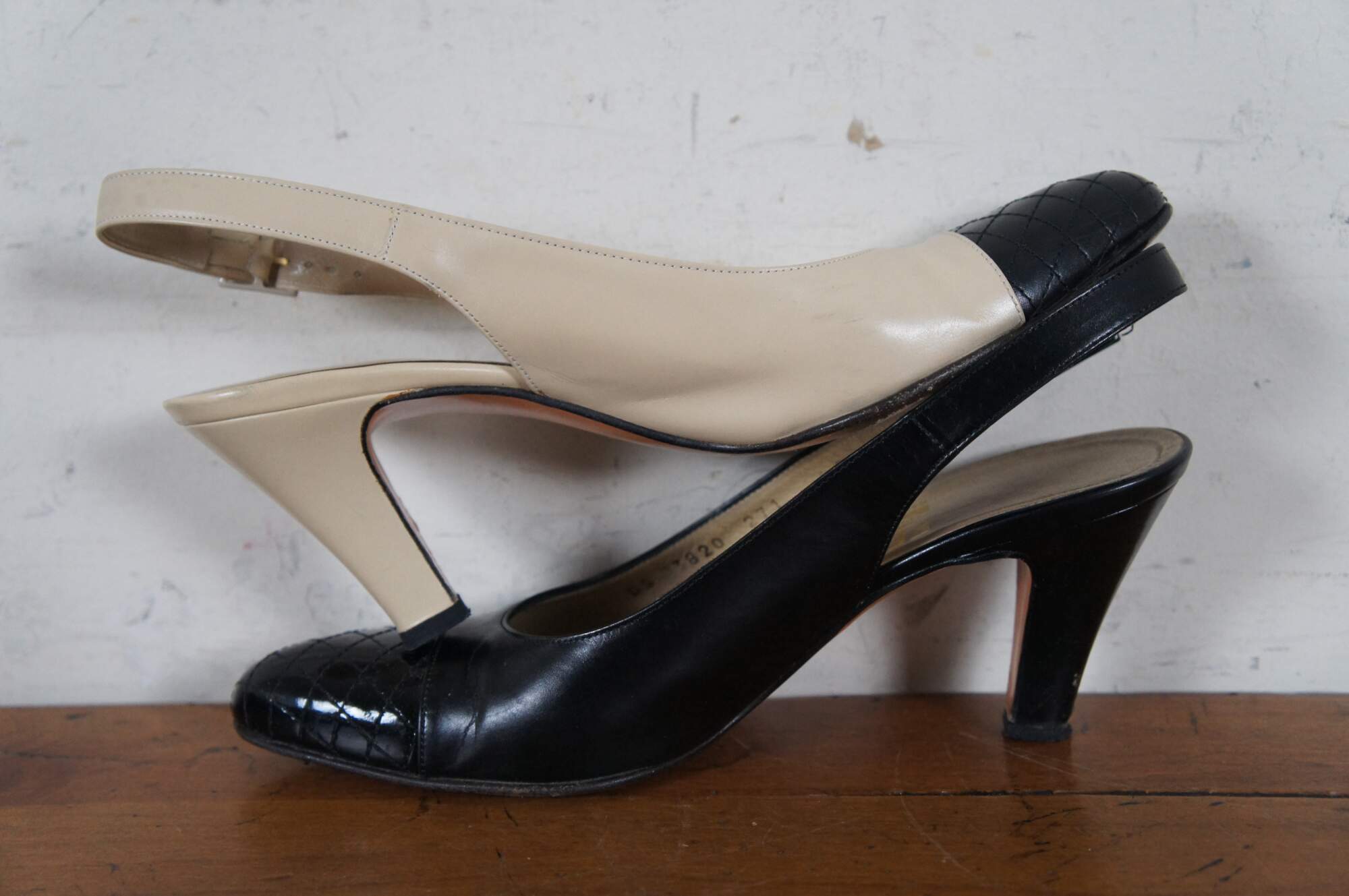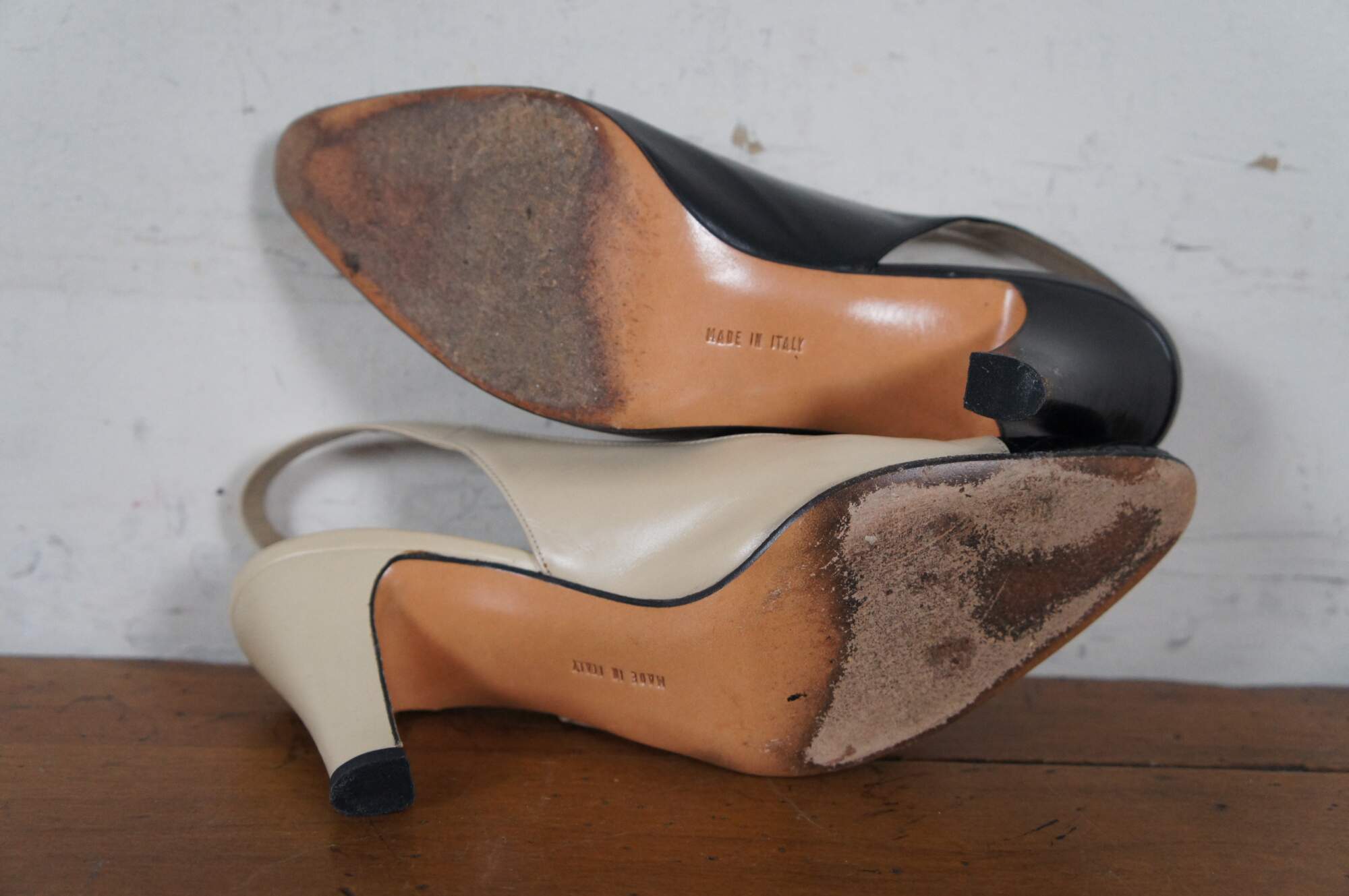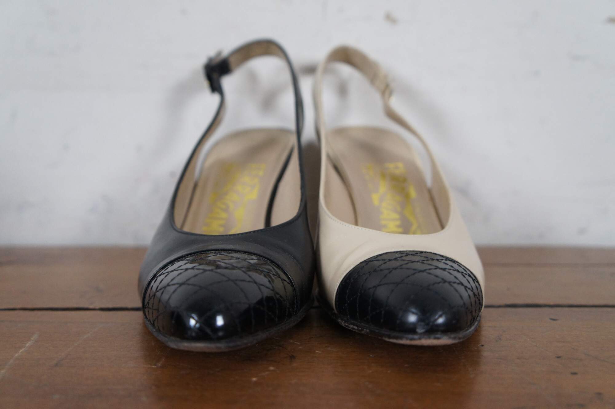 Two vintage pairs of Salvatore Ferragamo Scalena cap toe sling back dress shoes / heels in black and beige patent calf leather. Size 6.5 AAAA. Made in Italy. MSRP $195 each.