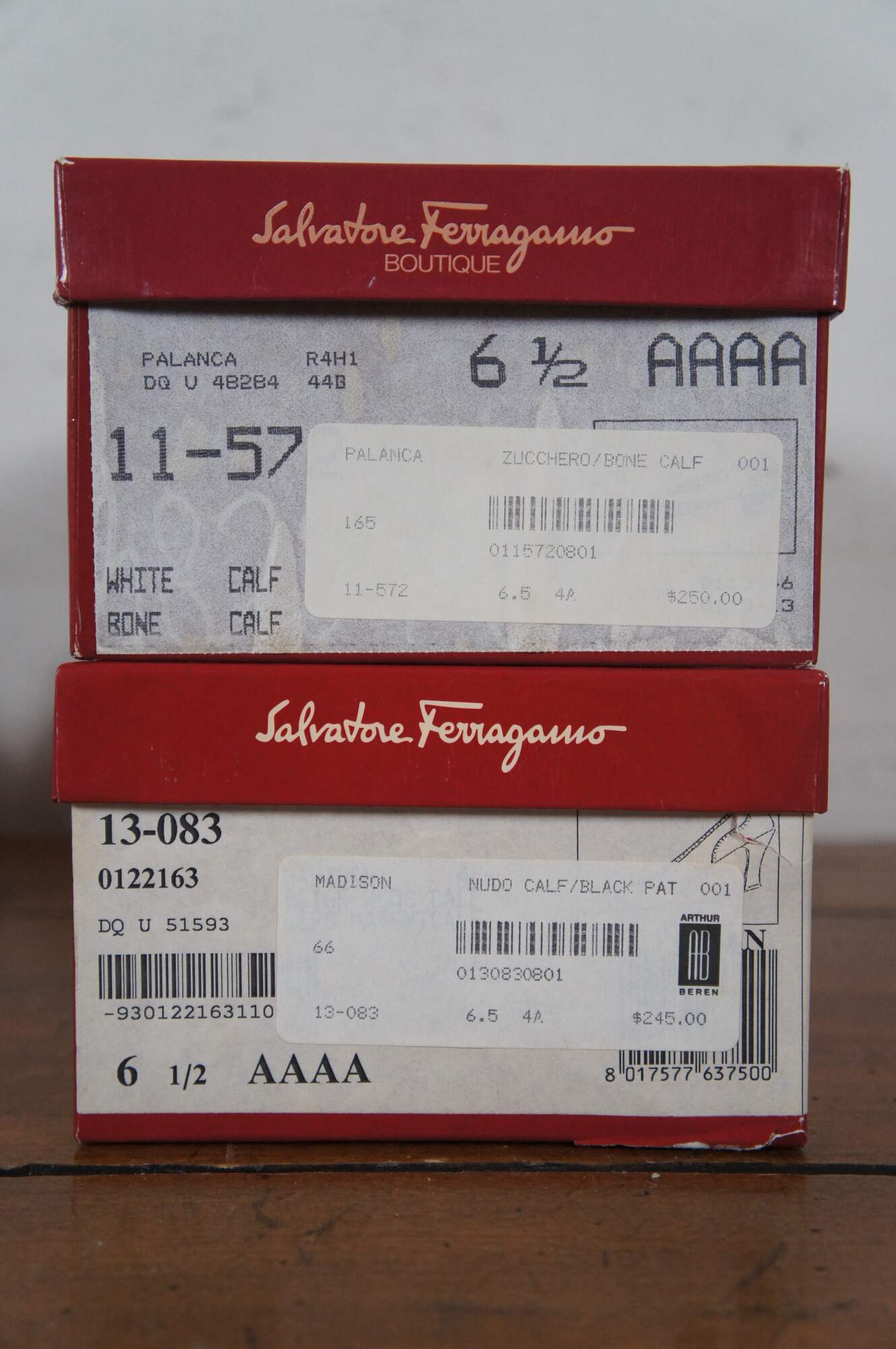 Two vintage pairs of Salvatore Ferragamo shoes / heels in zucchero white / bone and nudo black / beige patent calf leather, one with brouge and one with cap toe. Size 6.5 AAAA. Made in Italy. MSRP $245 each. Palanca, Madison.
