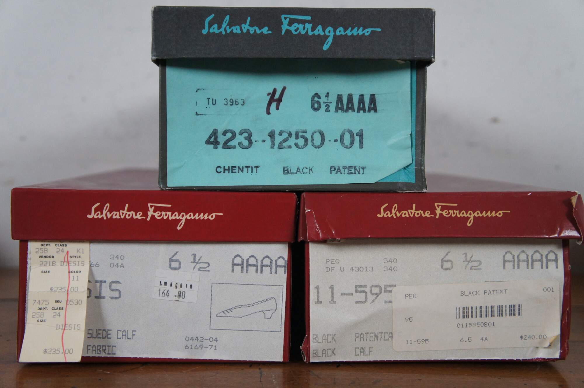 Three vintage pairs of Salvatore Ferragamo black leather / suede heels / low pumps. Size 6.5 AAAA. MSRP $164, $240, $84. Made in Italy. Chentit, calf leather.