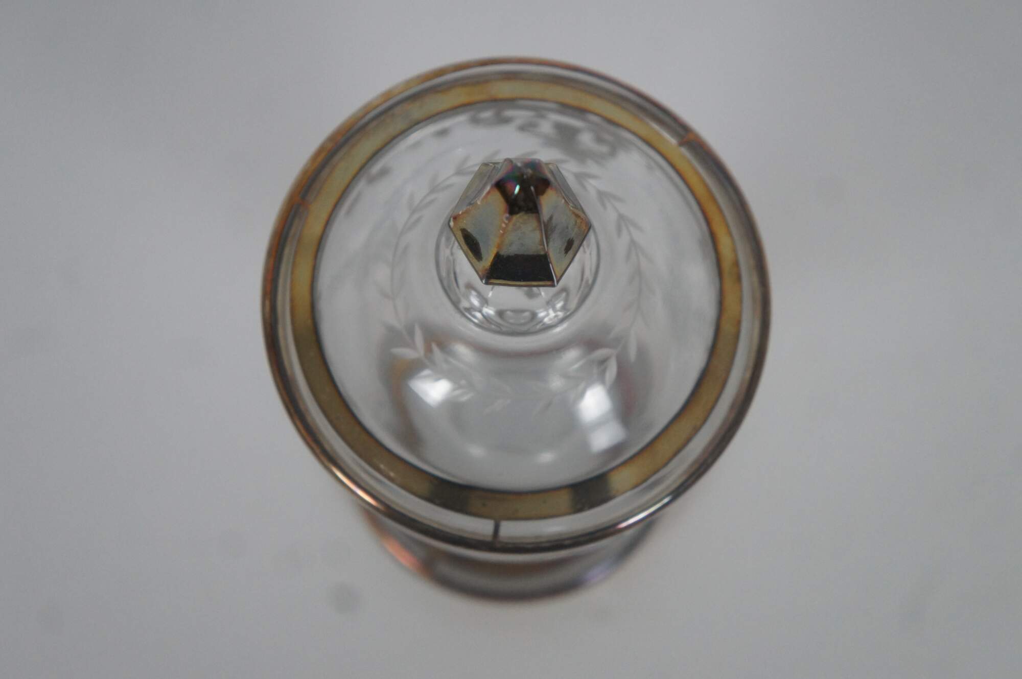 Antique Heisey pressed and etched glass candy jar / compote featuring trophy urn form with footed pedestal base, baroque sterling silver overlay and lidded top with finial.