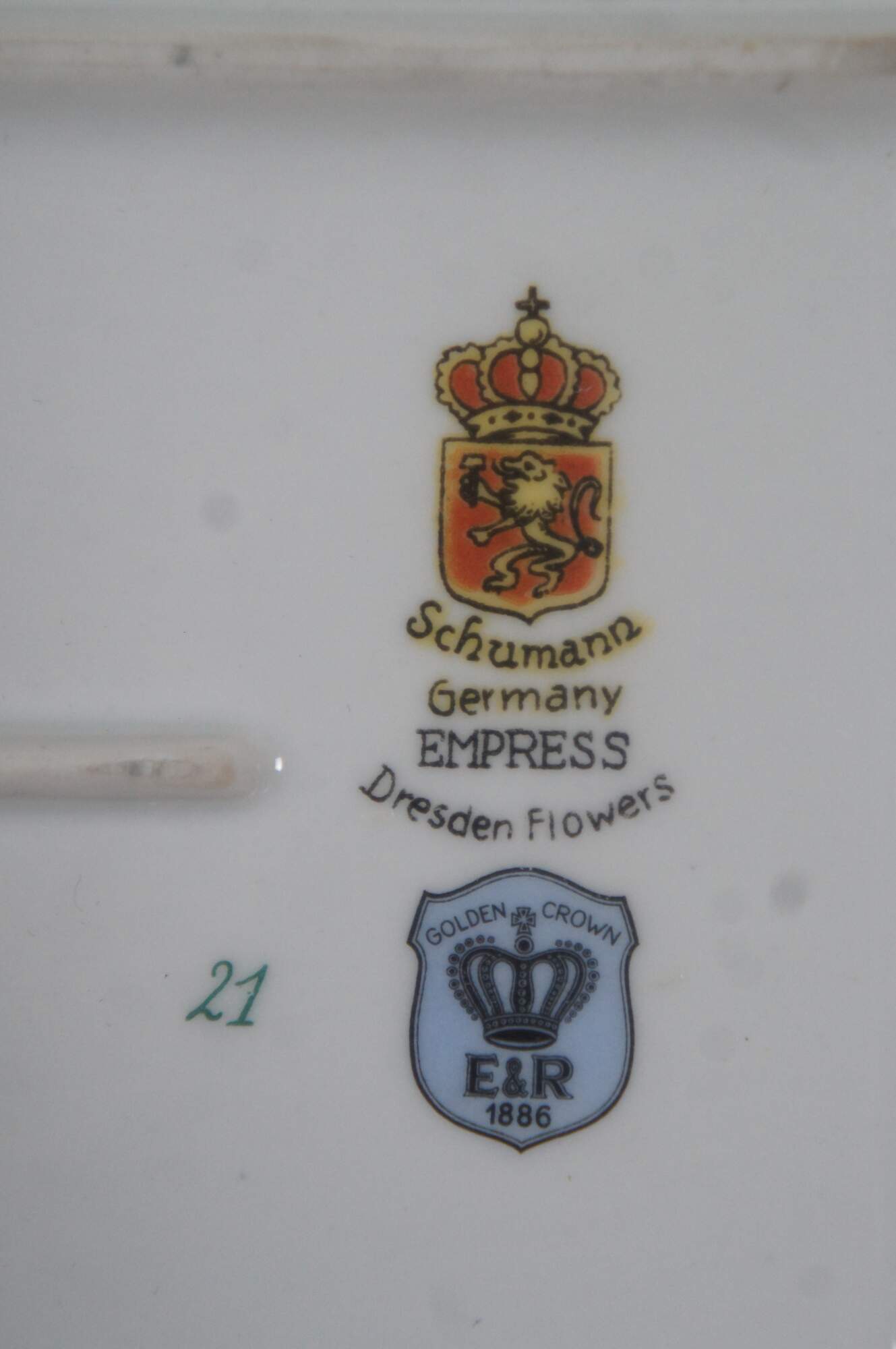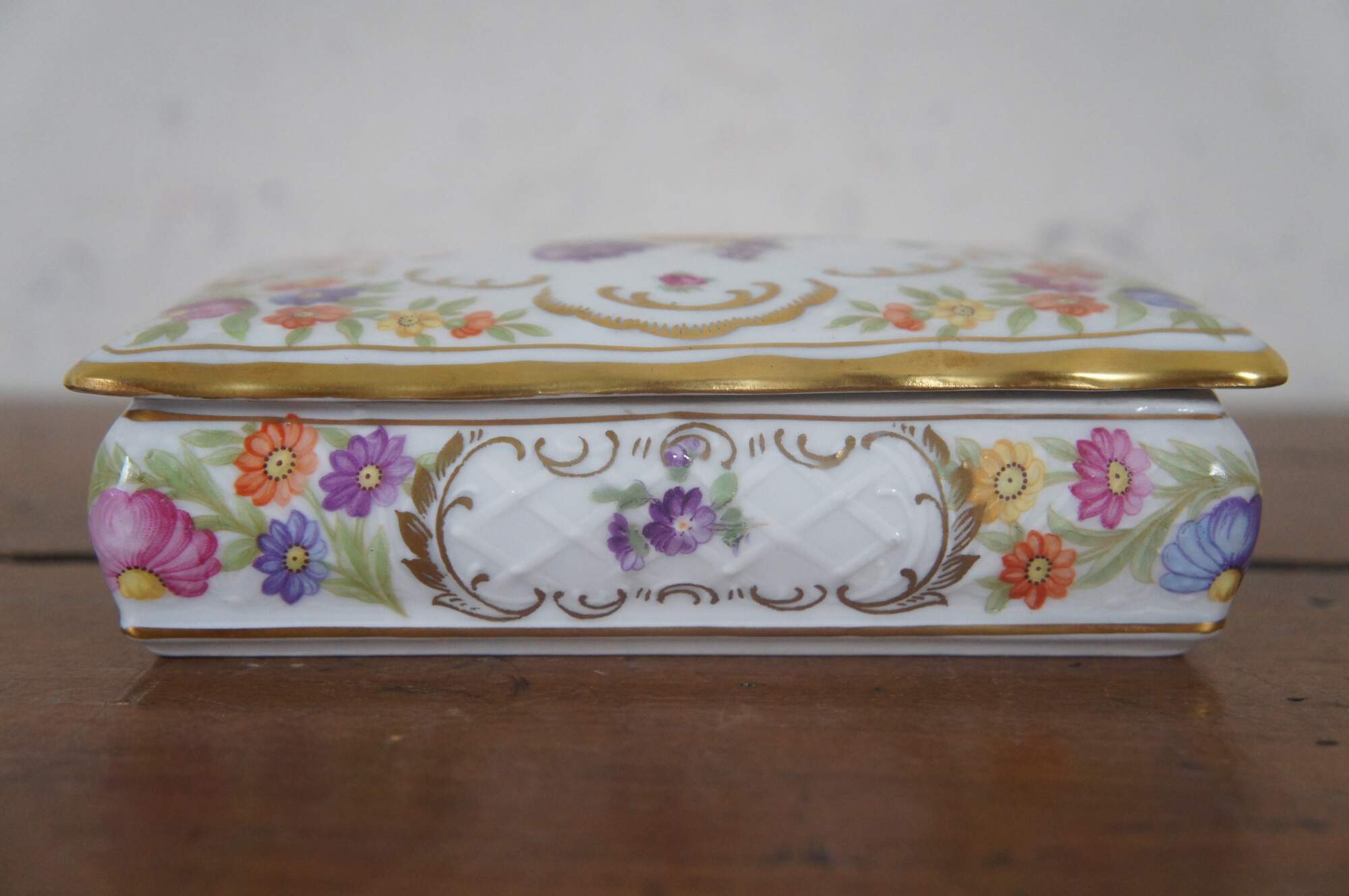 Vintage German Schumann Empress Dresden lidded trinket box or dish featuring a floral motif with gold trim. Golden Crown E&R 1886.