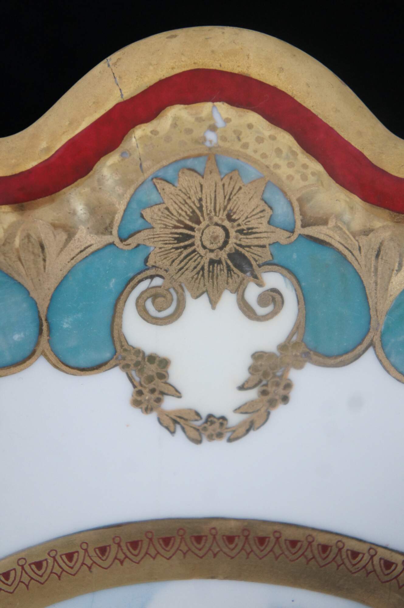 Antique Austrian scalloped porcelain bowl featuring a gold, turquoise and red Neoclassical theme with a Cherub riding in chariot led by three flower girls.