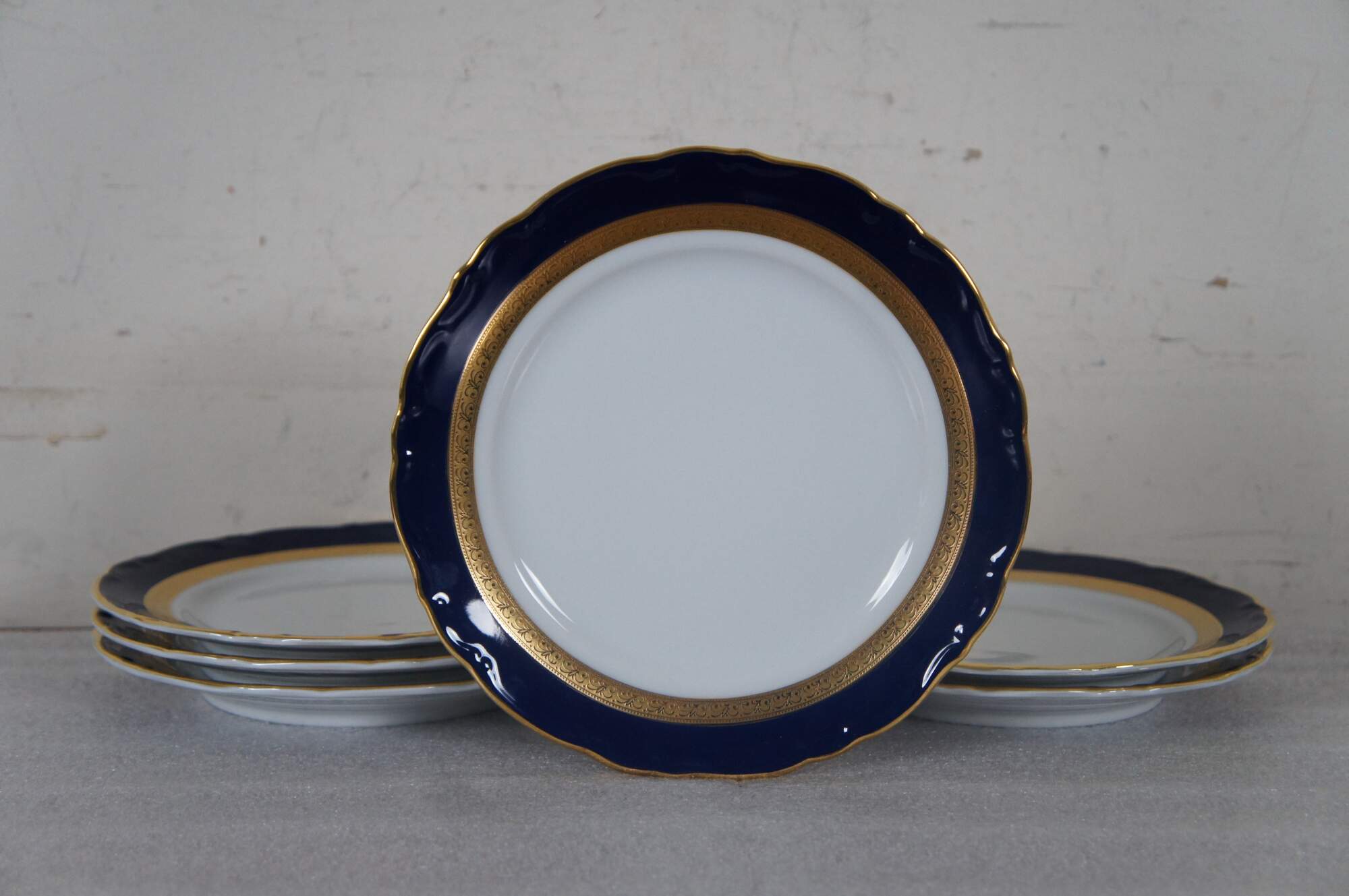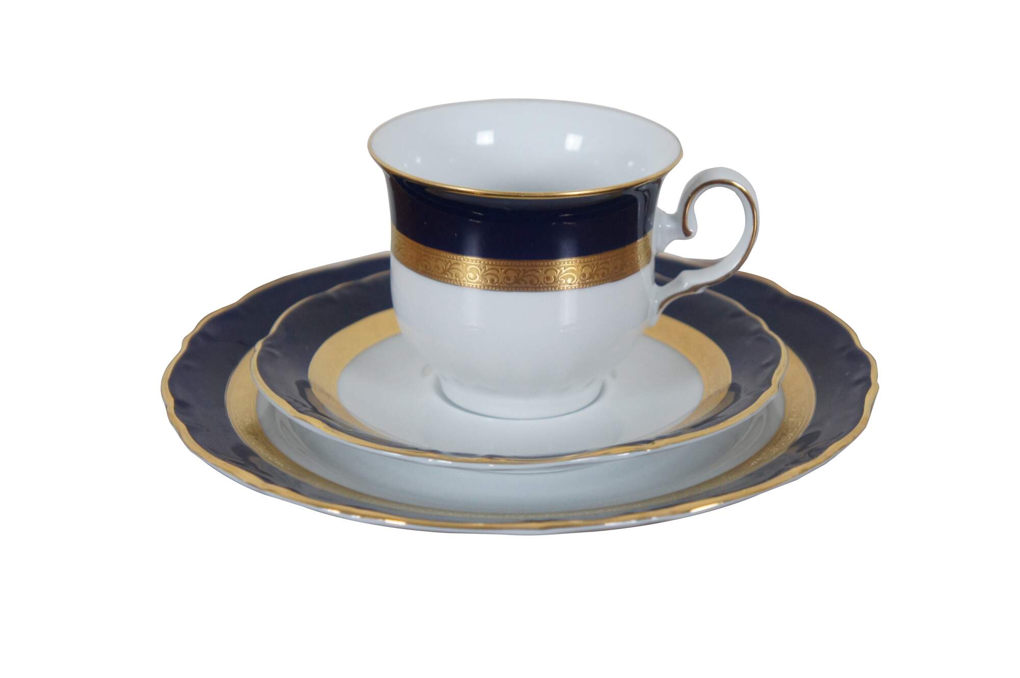 Vintage German Bavarian Wiuterliug Kirchenlomitz Echt Kobalt Scharffeuer china demitasse tea coffee set featuring teapot, creamer, sugar, cups, saucers and desert plates.