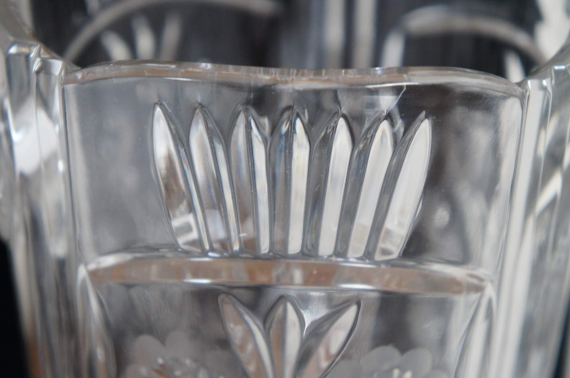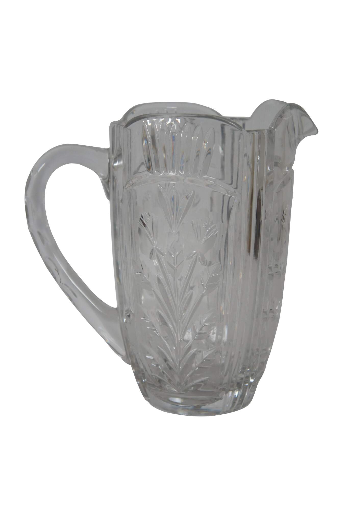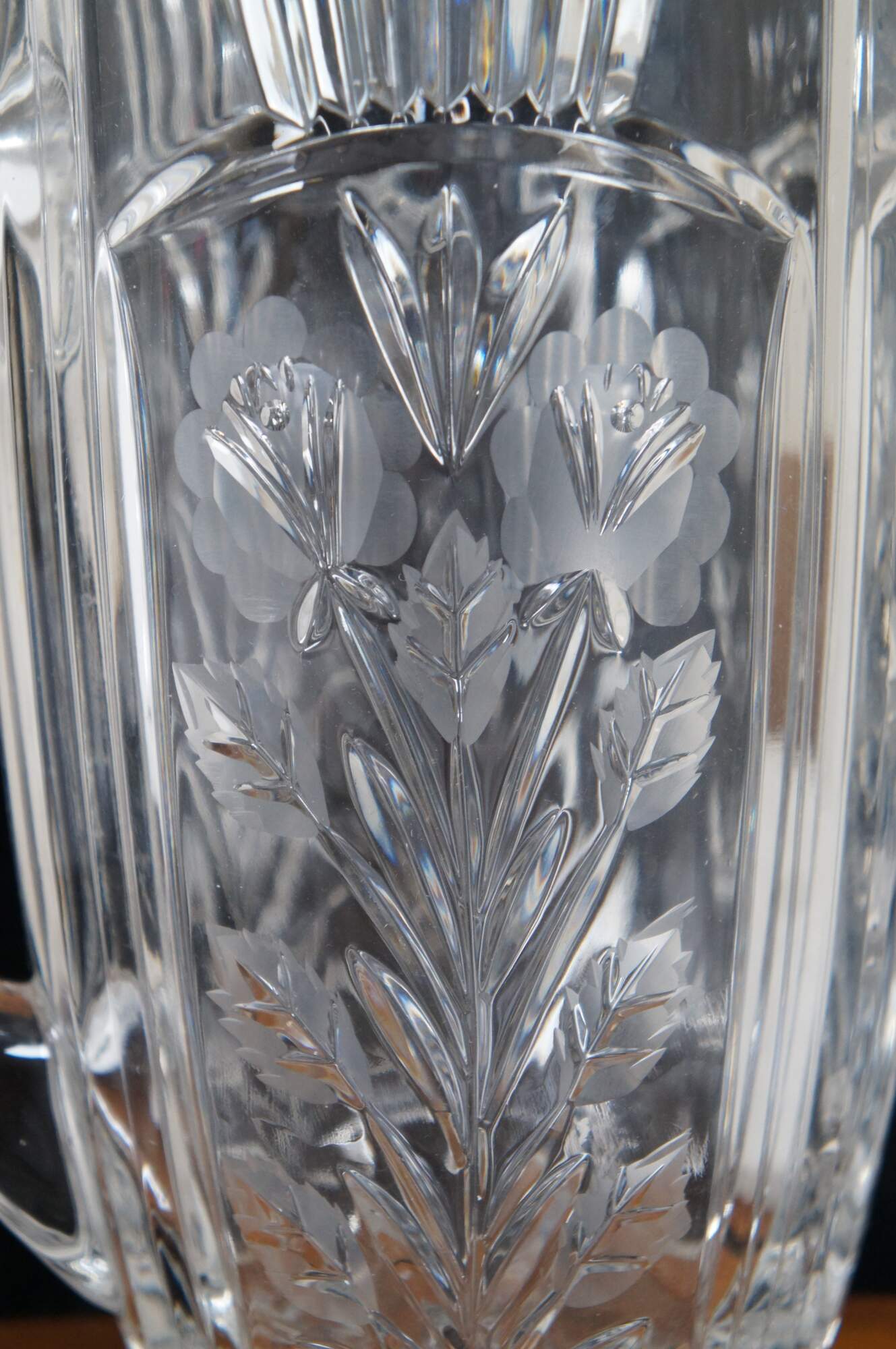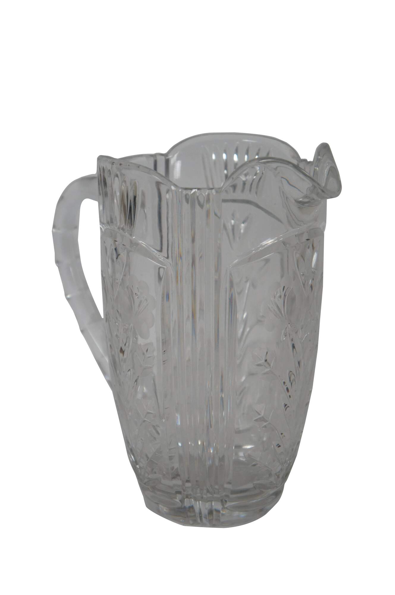 Vintage cut glass water pitcher featuring floral etched design and notched handle.