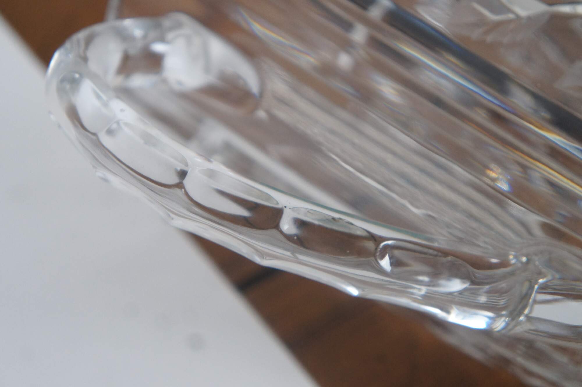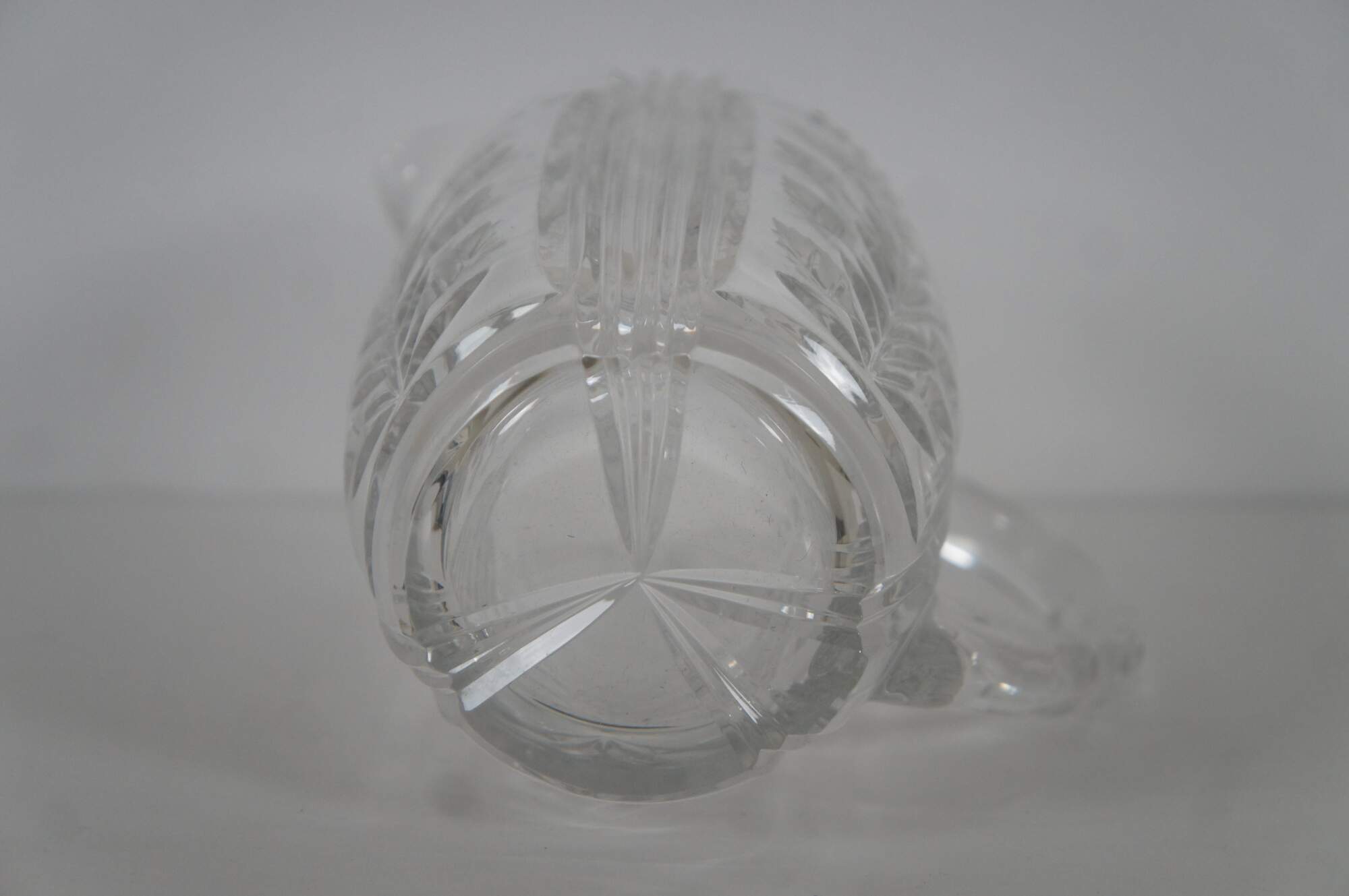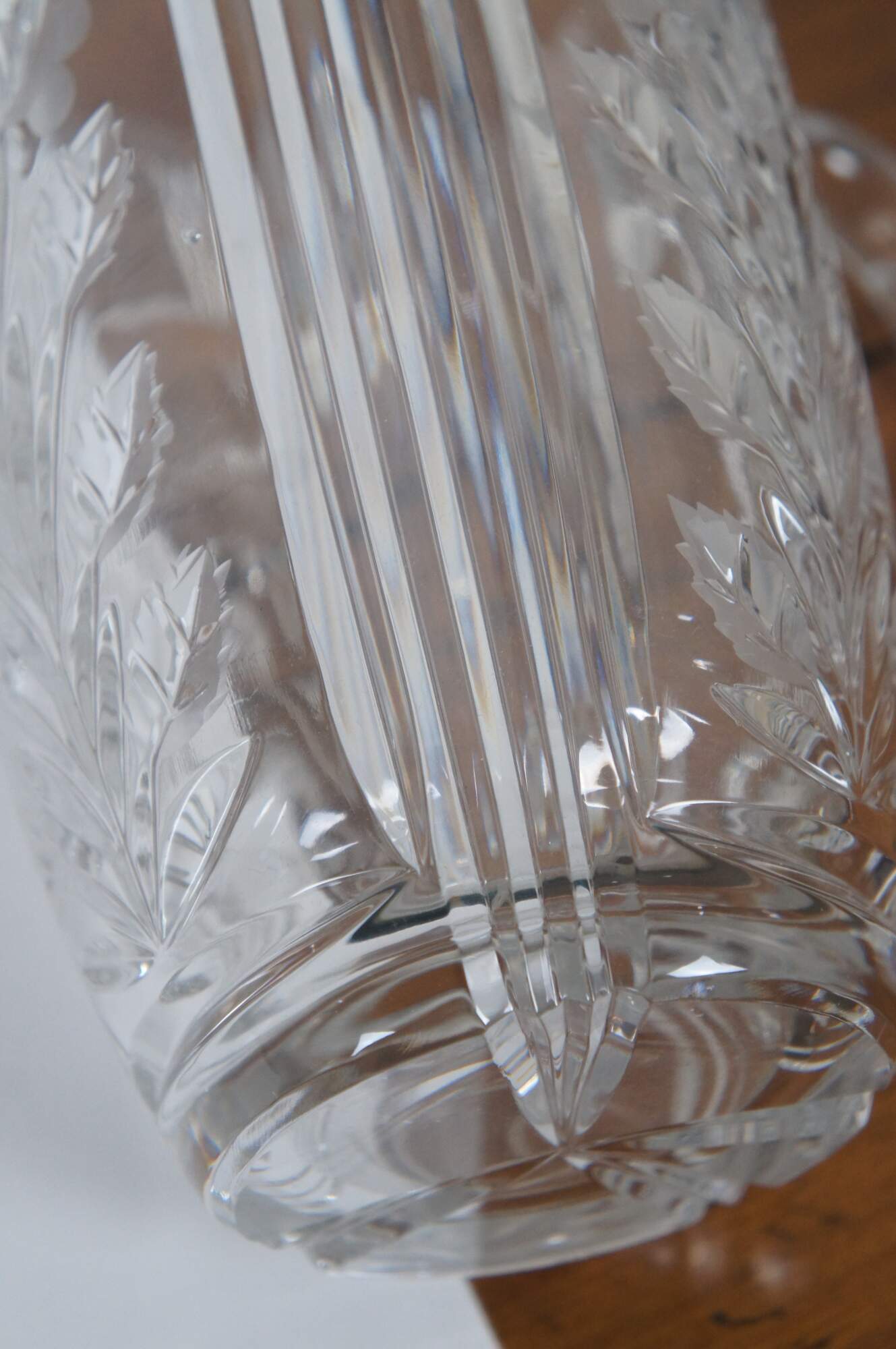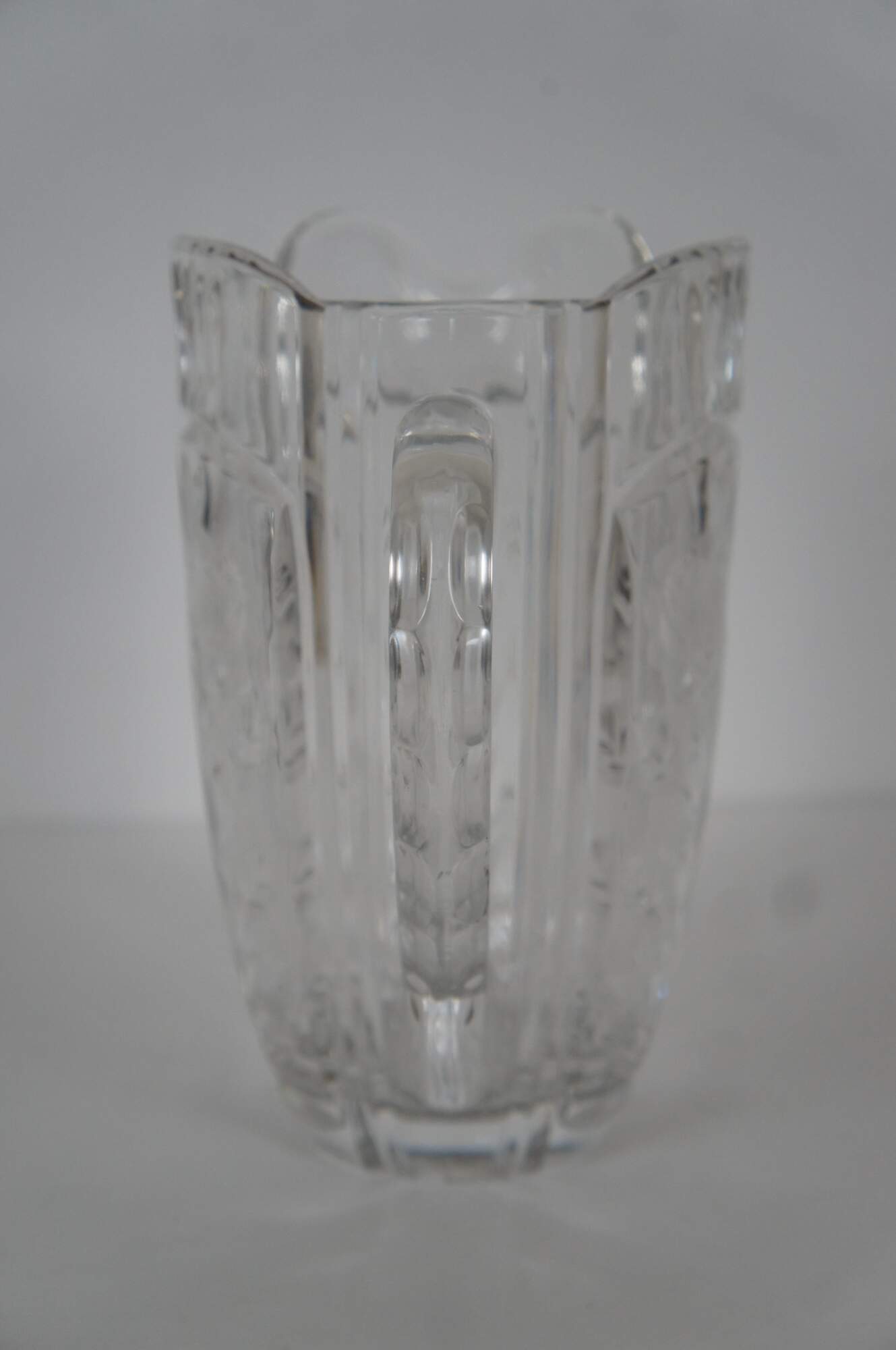 Vintage cut glass water pitcher featuring floral etched design and notched handle.