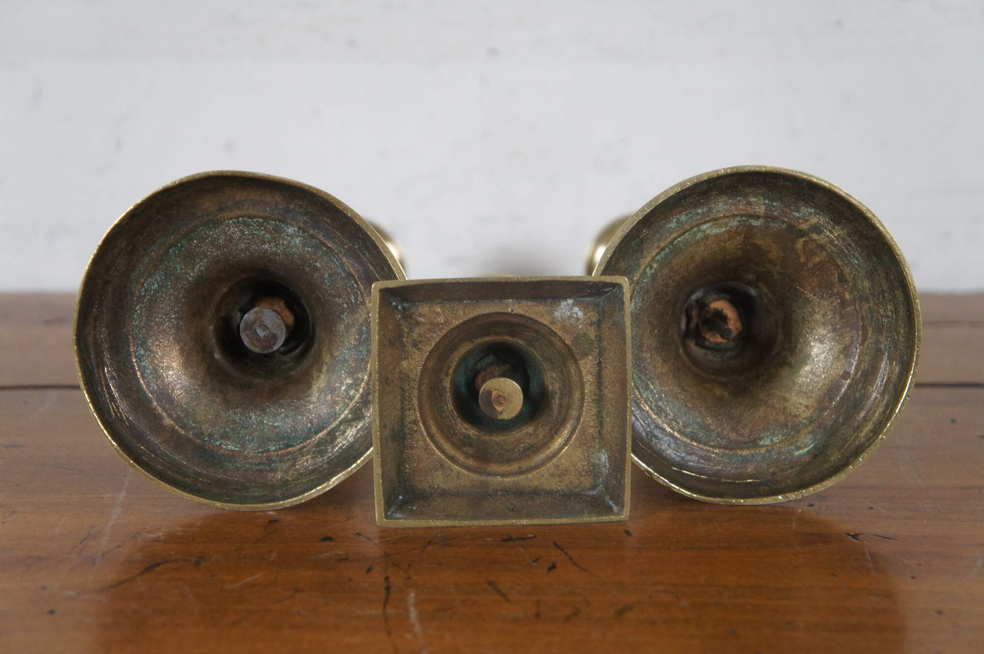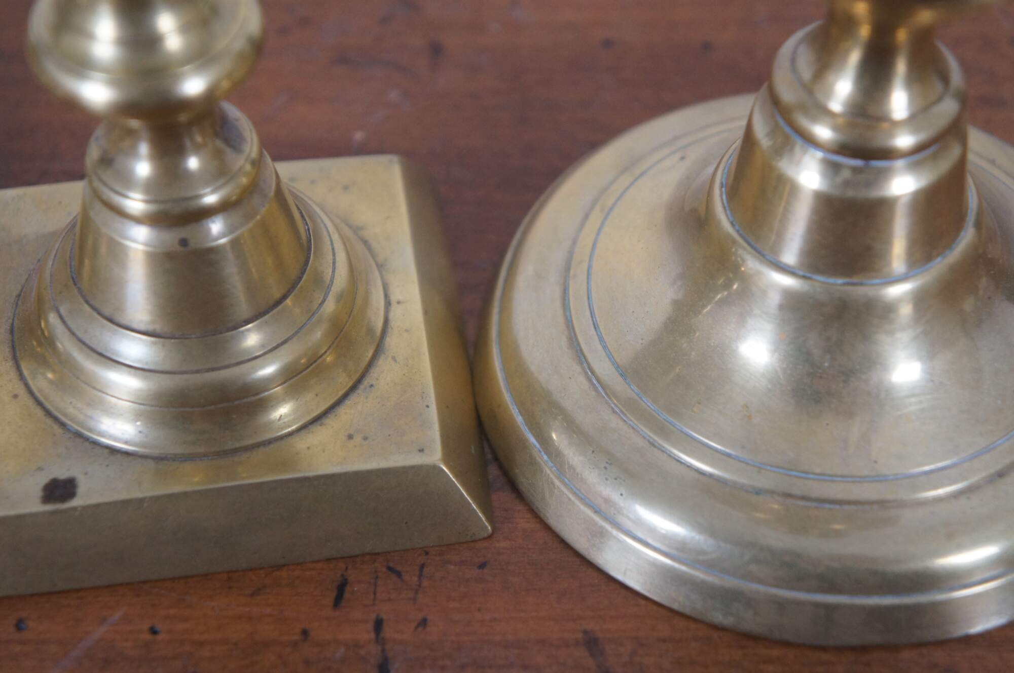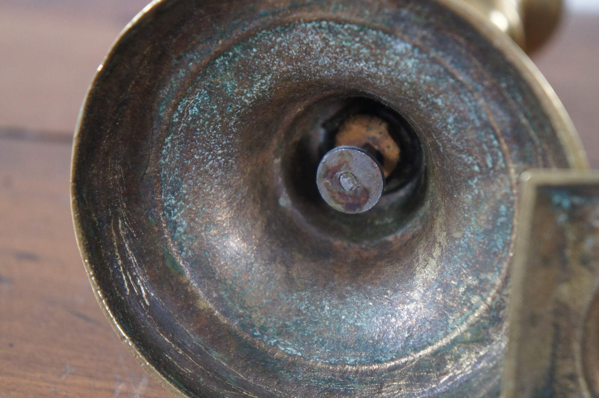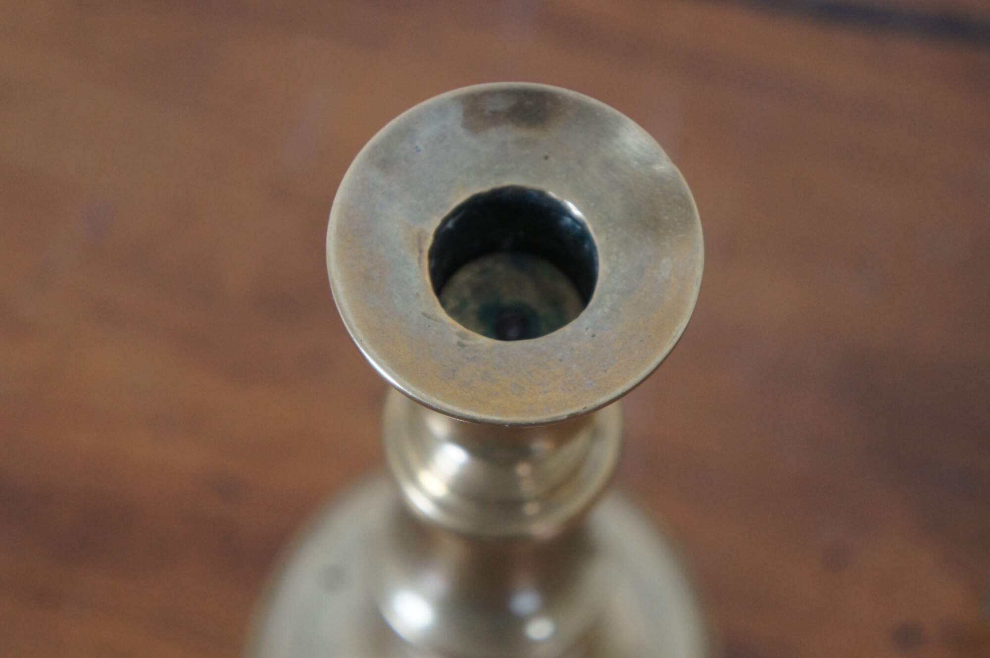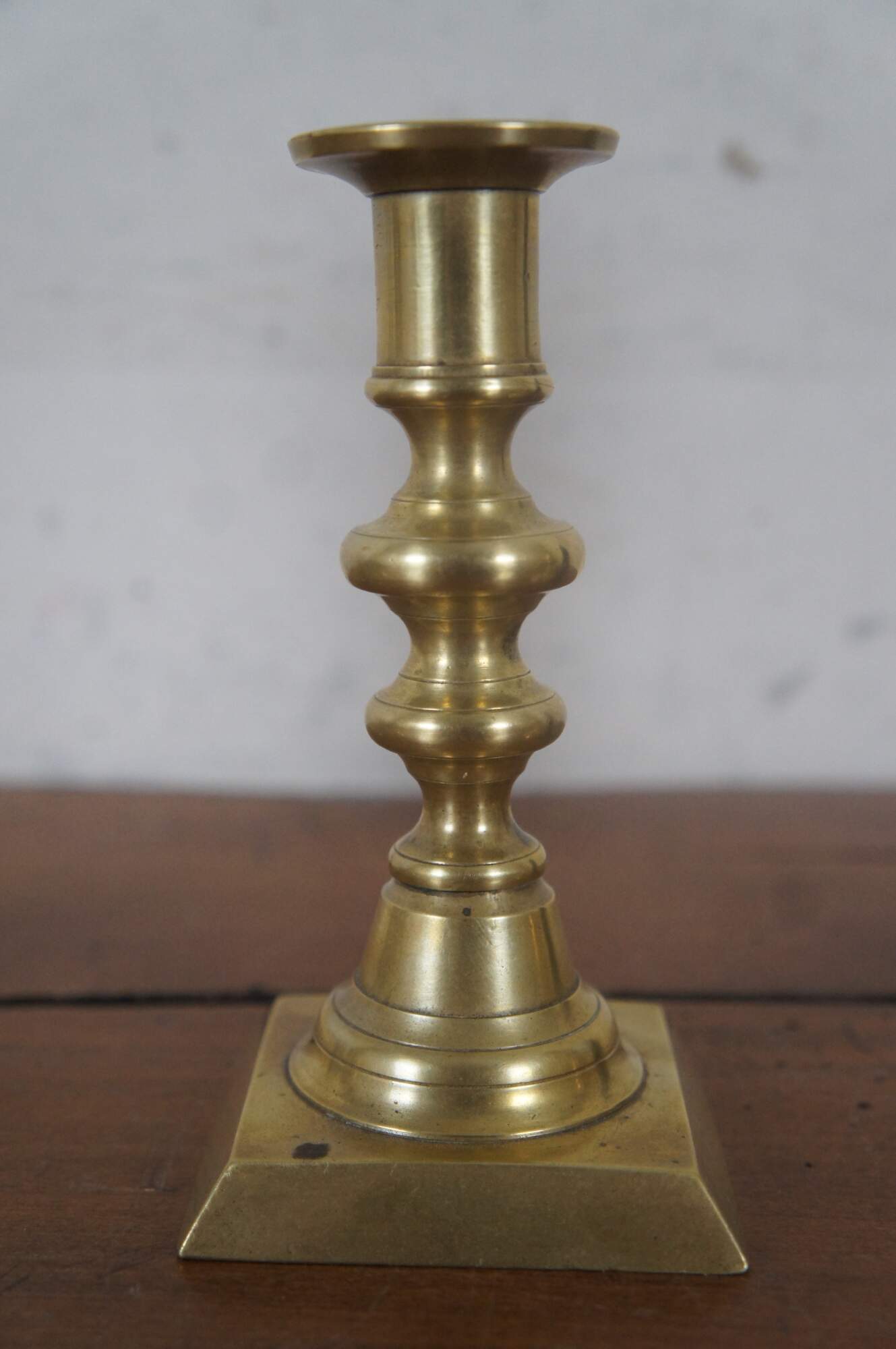 Three antique English brass candlesticks or candle holders featuring Queen Anne styling with push up rods.