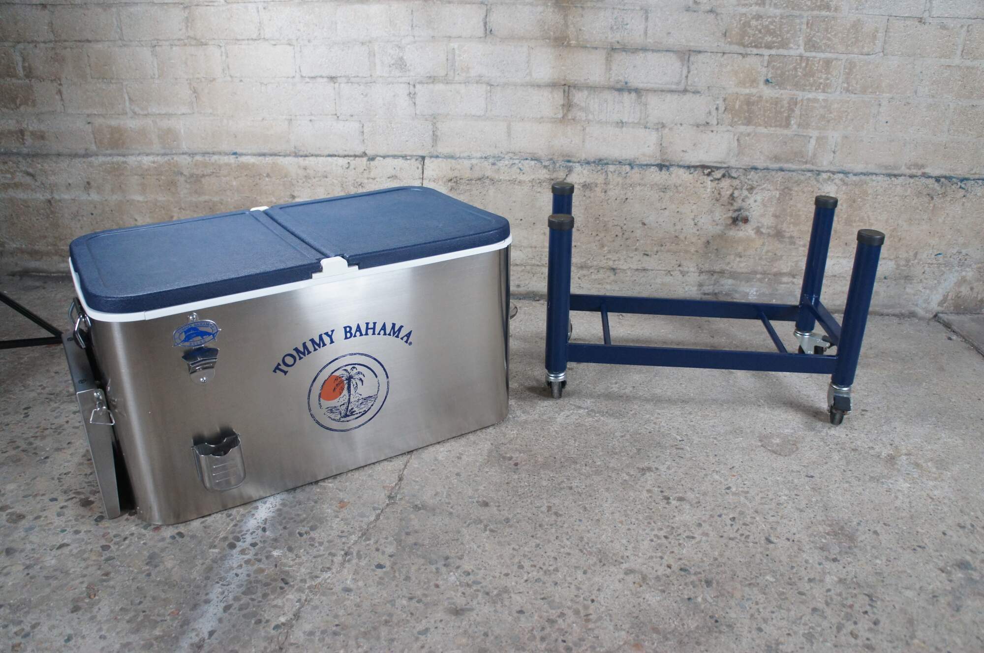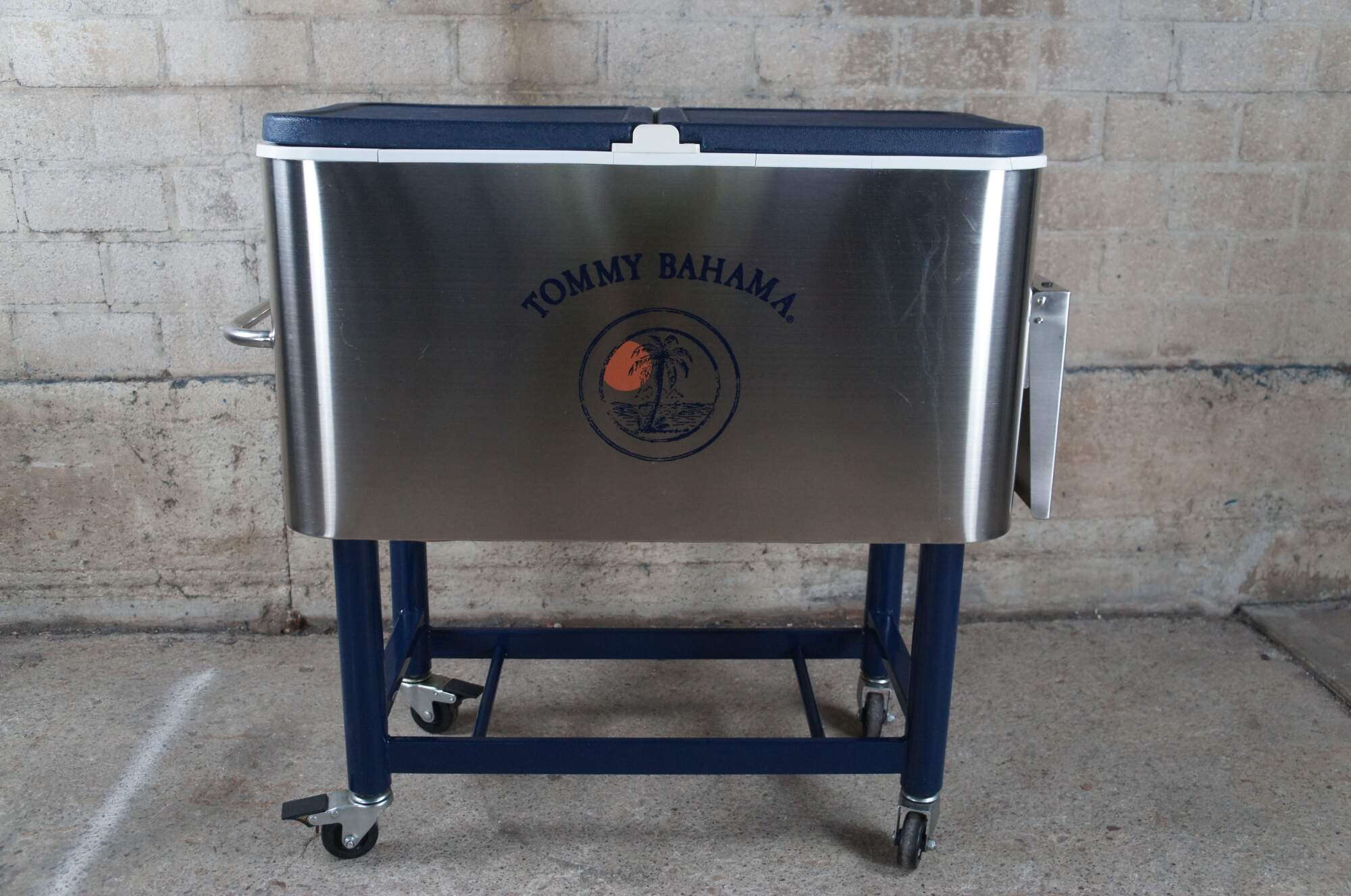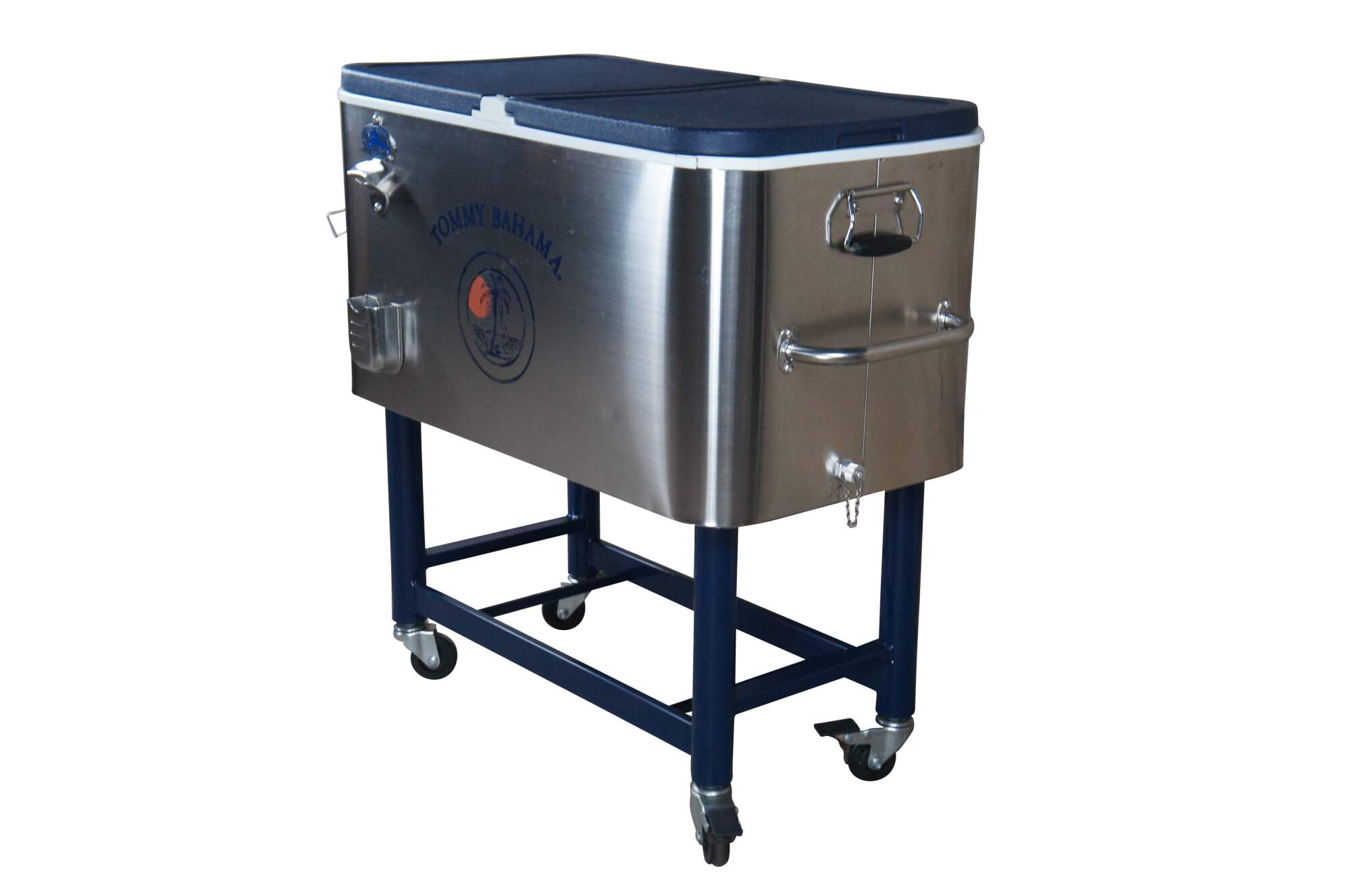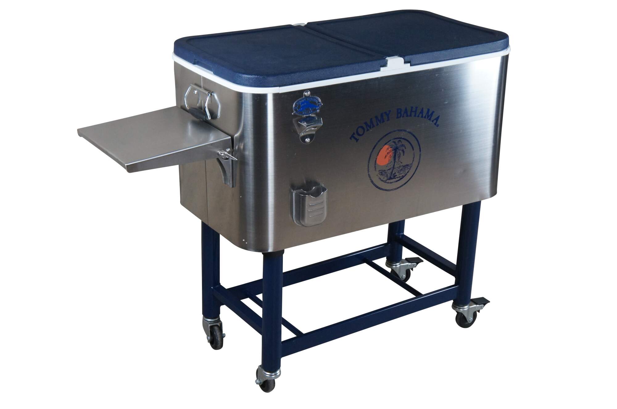 Escape to your own backyard with this Tommy Bahama beverage / beer cooler / ice chest. This tough 100-qt. stainless steel patio cooler holds 130 cans. It's a great addition to all your summer activities, from weeknight cookouts to 4th of July festivities. The cooler features a dual-opening insulated lid that gives you easy access to beverages. The rolling cart features the Tommy Bahama logo, a bottle opener with cap catcher and a storage shelf to hold cups or other supplies.