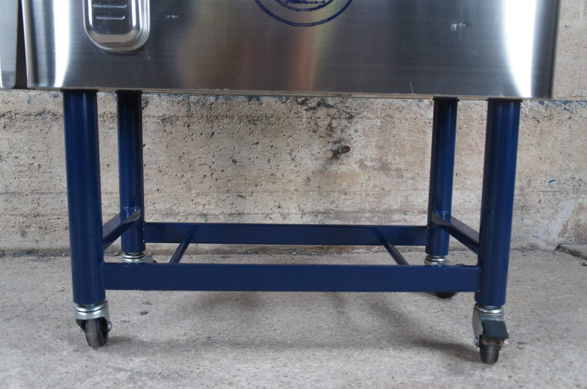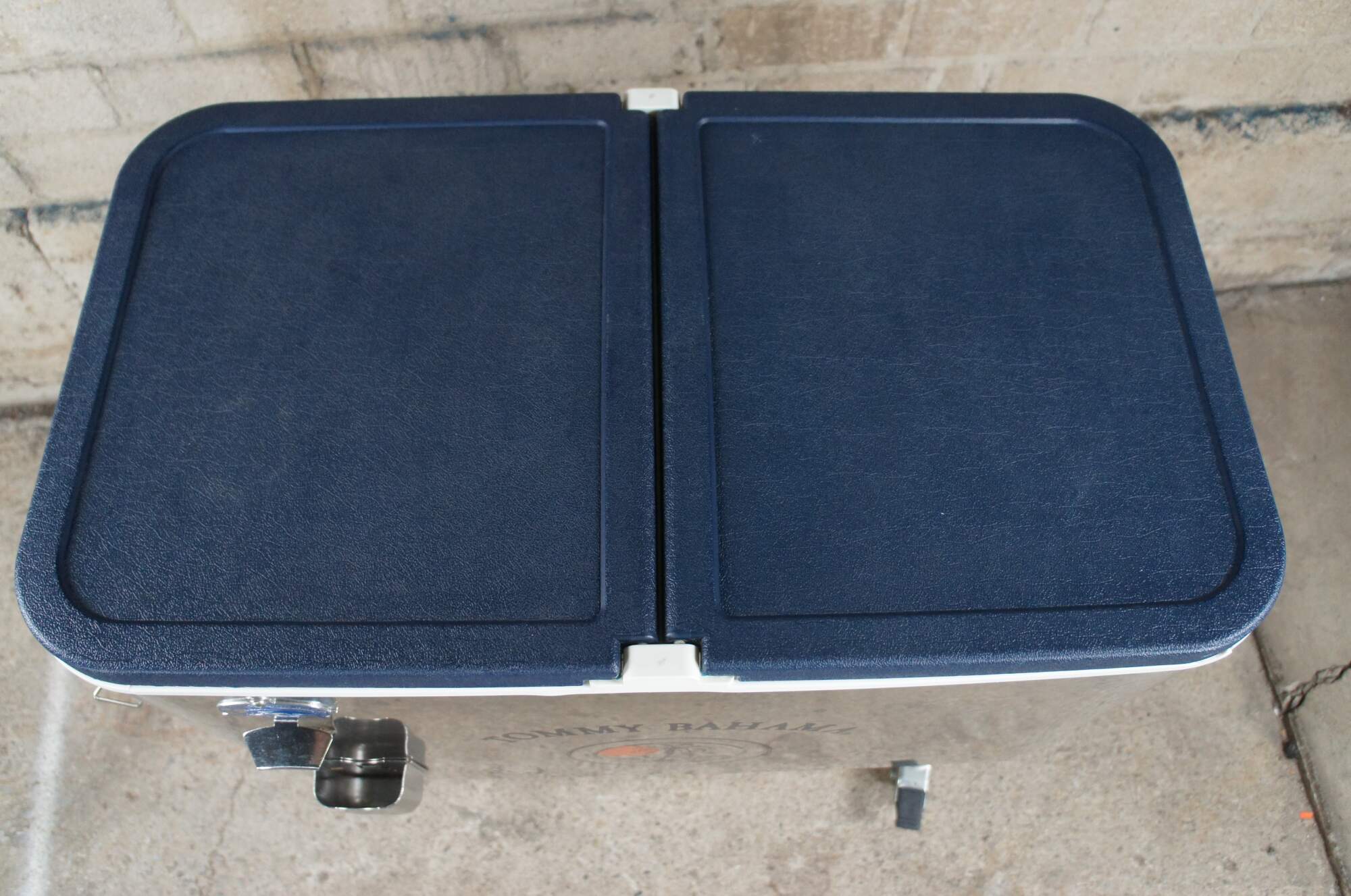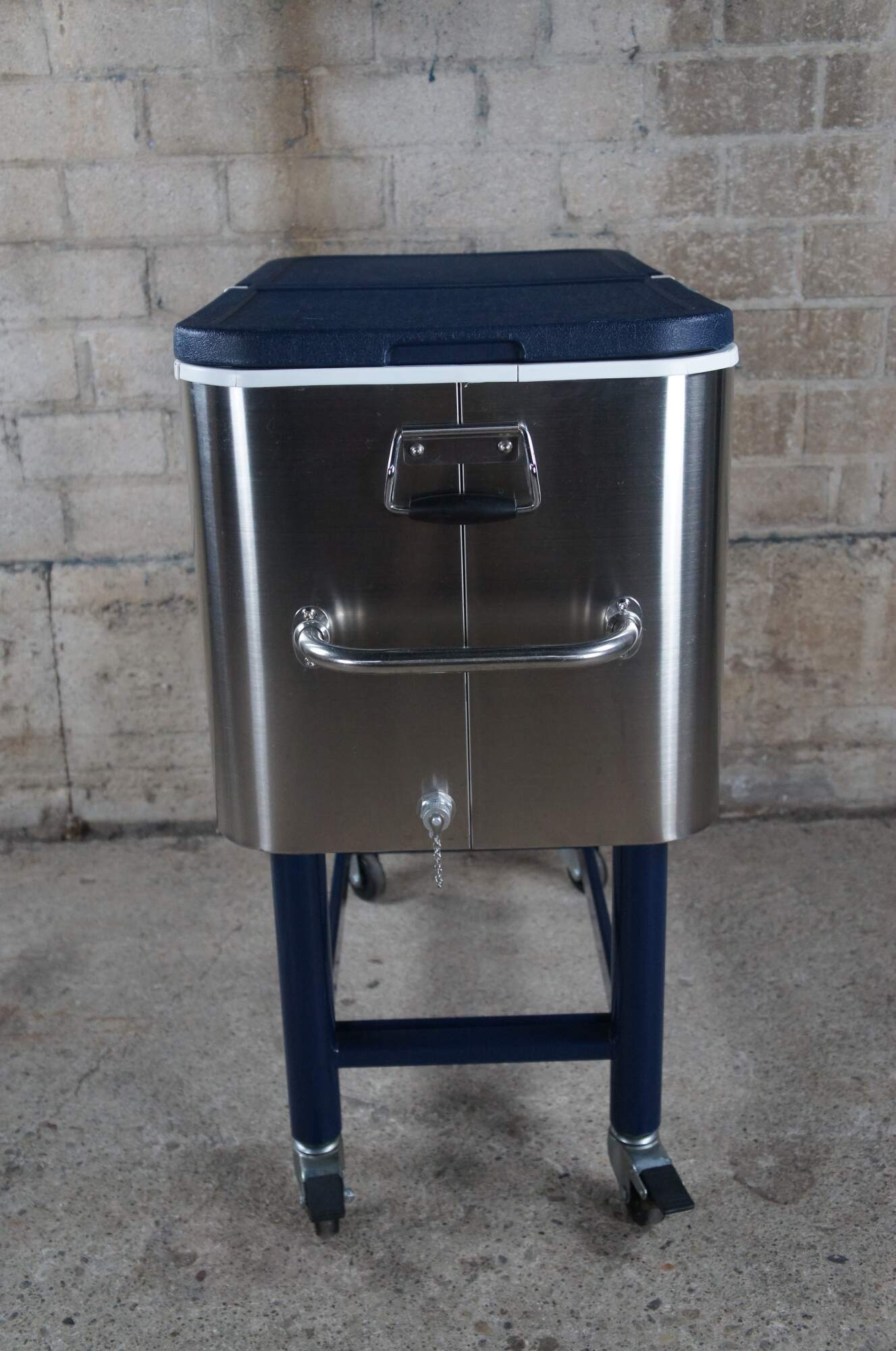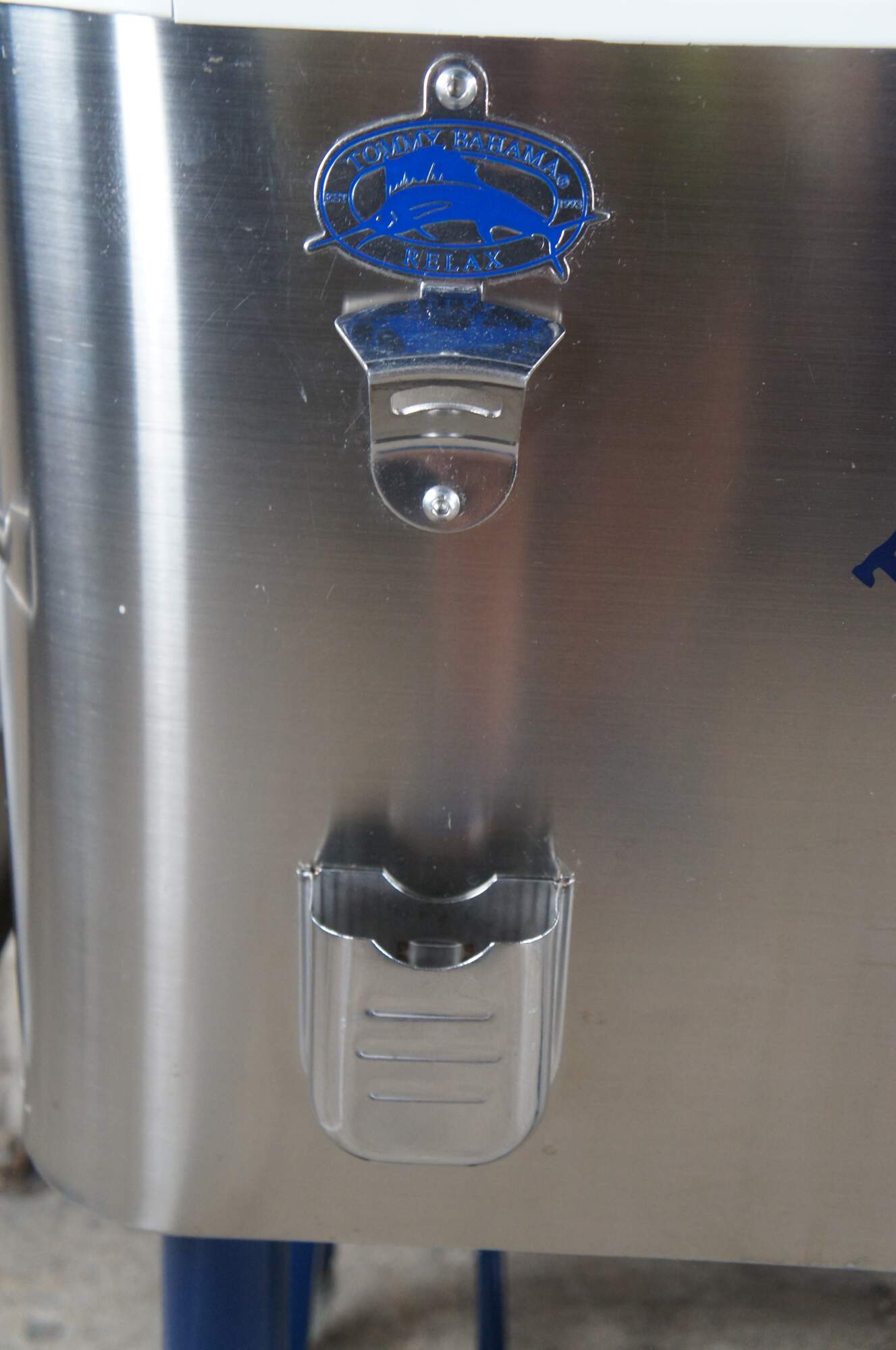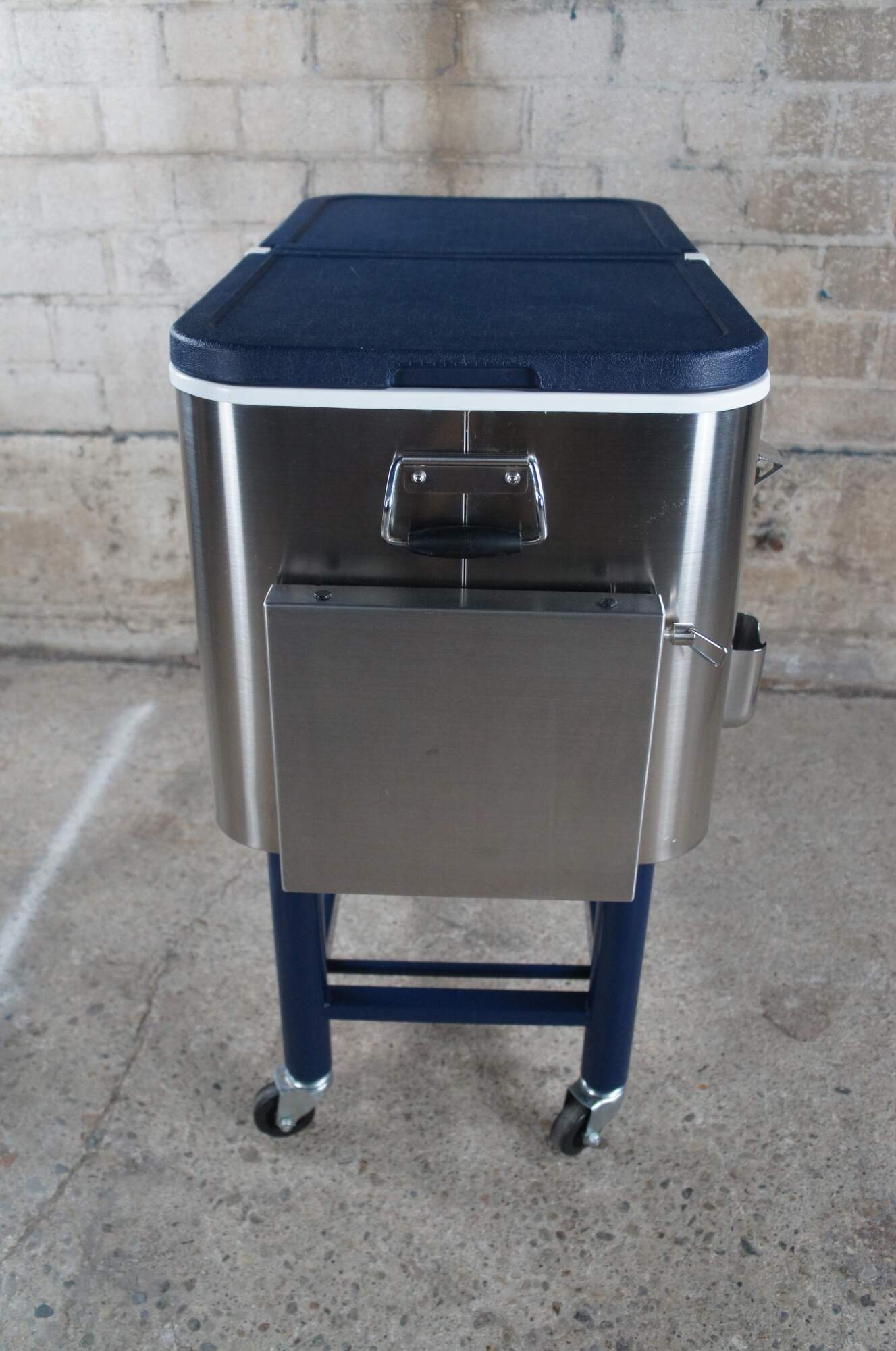 Escape to your own backyard with this Tommy Bahama beverage / beer cooler / ice chest. This tough 100-qt. stainless steel patio cooler holds 130 cans. It's a great addition to all your summer activities, from weeknight cookouts to 4th of July festivities. The cooler features a dual-opening insulated lid that gives you easy access to beverages. The rolling cart features the Tommy Bahama logo, a bottle opener with cap catcher and a storage shelf to hold cups or other supplies.