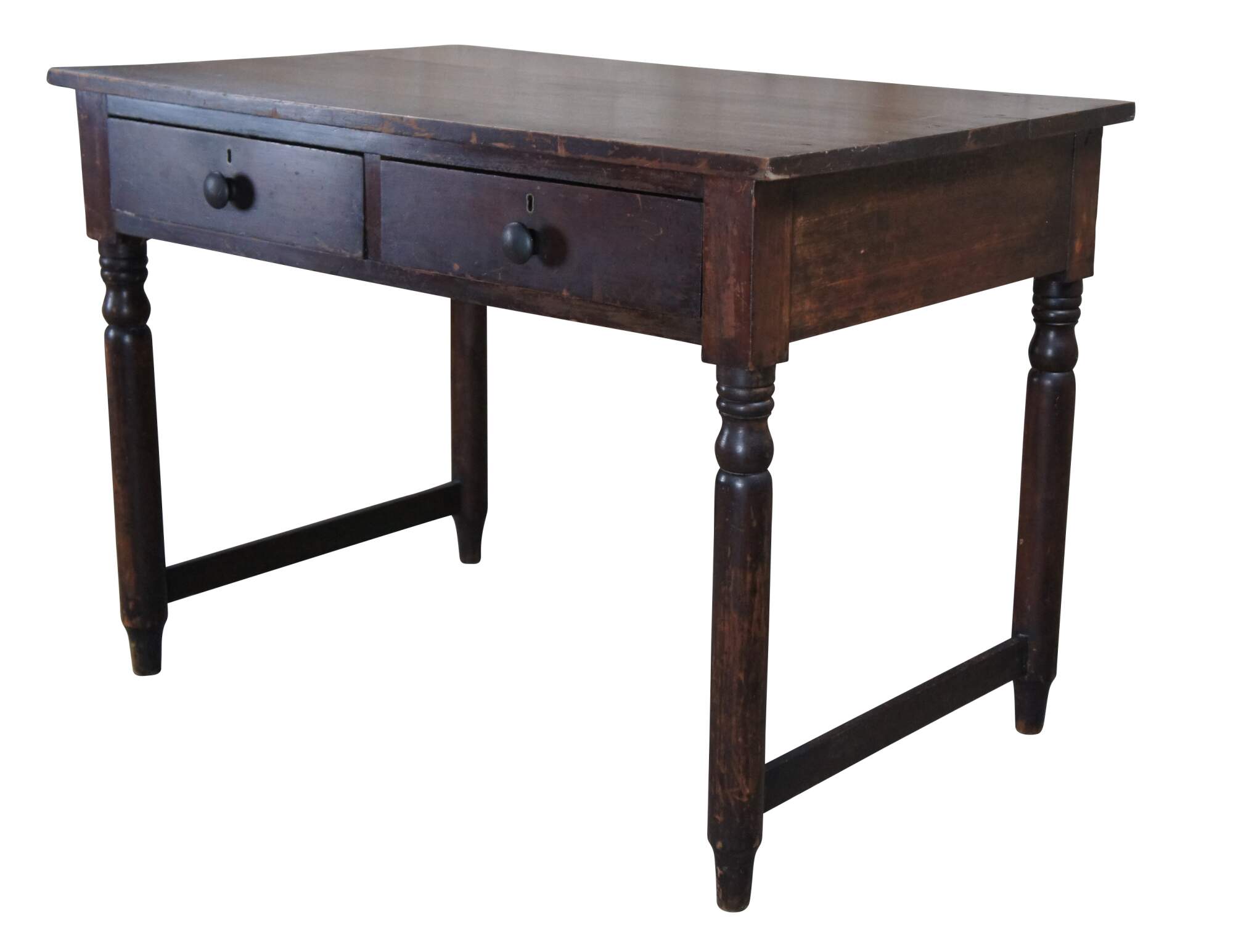 Antique primitive 19th century early American library writing desk. Made of pine featuring rectangular form with two drawers featuring hand dovetailing, hand cut nails, and turned posts connected by stretcher.