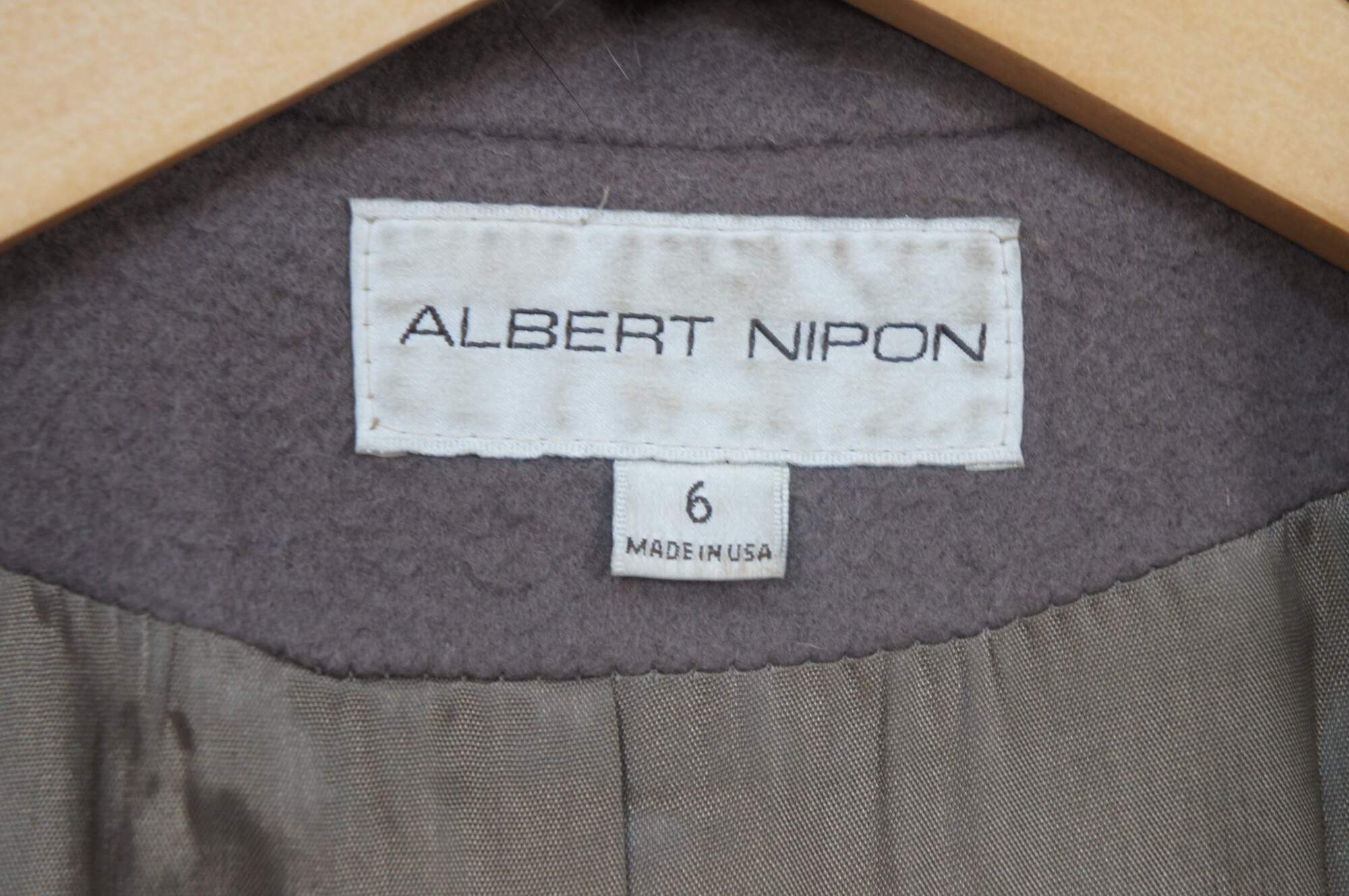 Vintage Albert Nipon grey wool and fox fur trench coat featuring single breasted design with button closure and fox fur cuff and collar. Fox from Finland, made in USA.