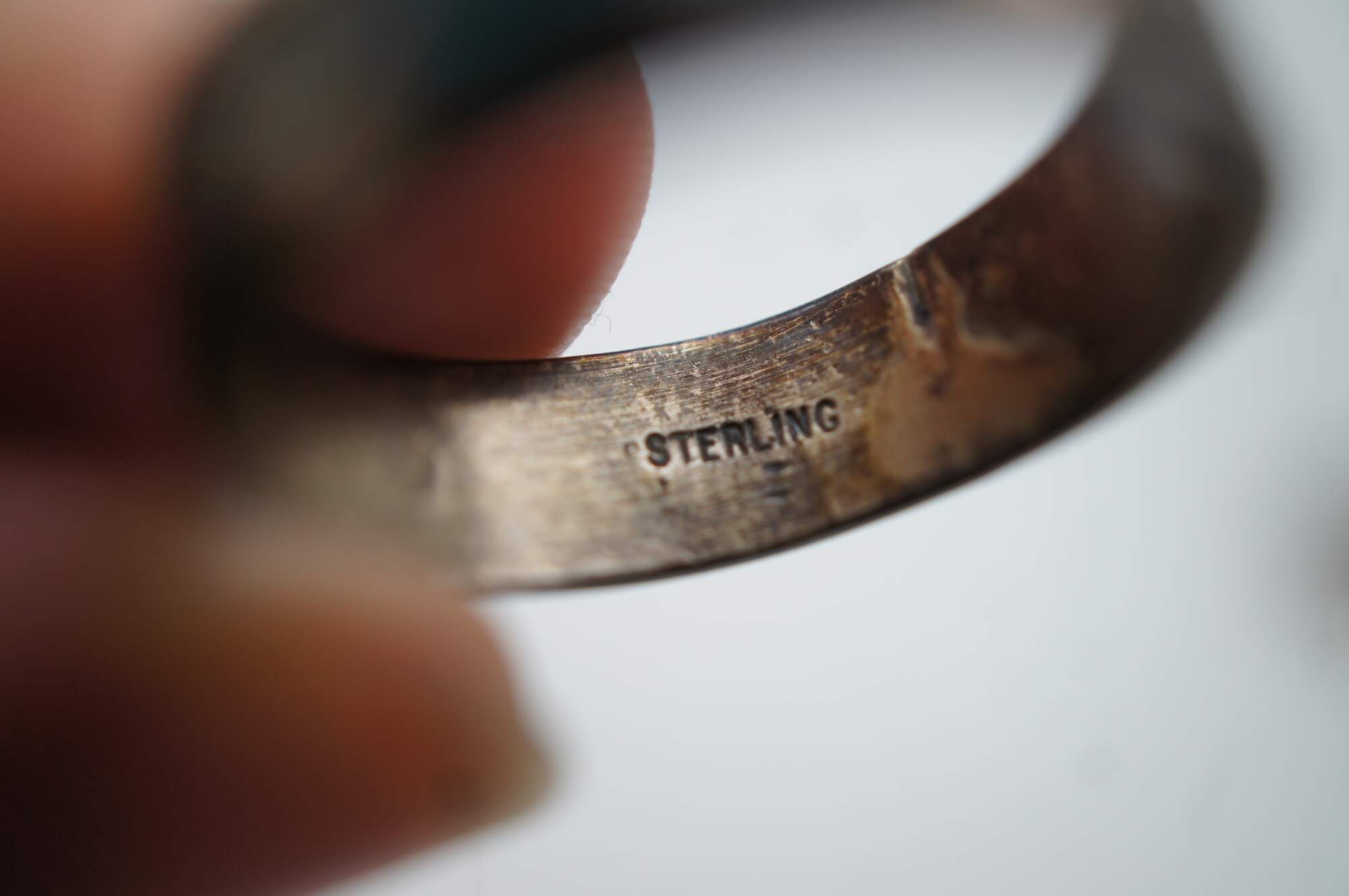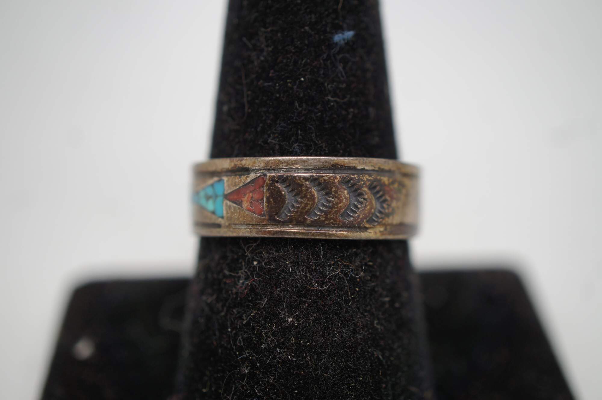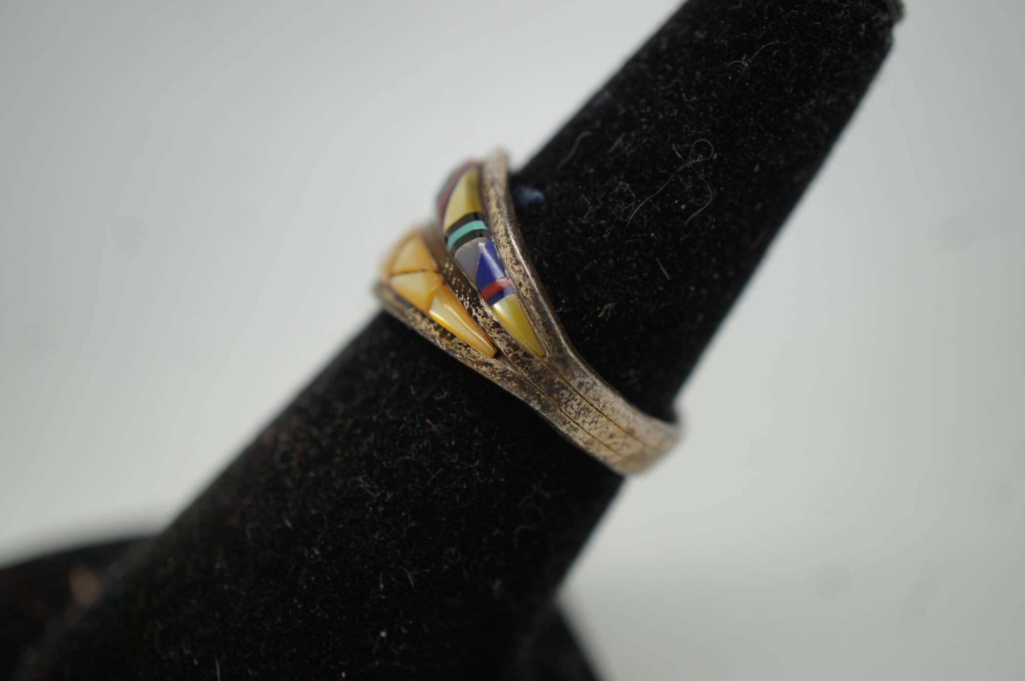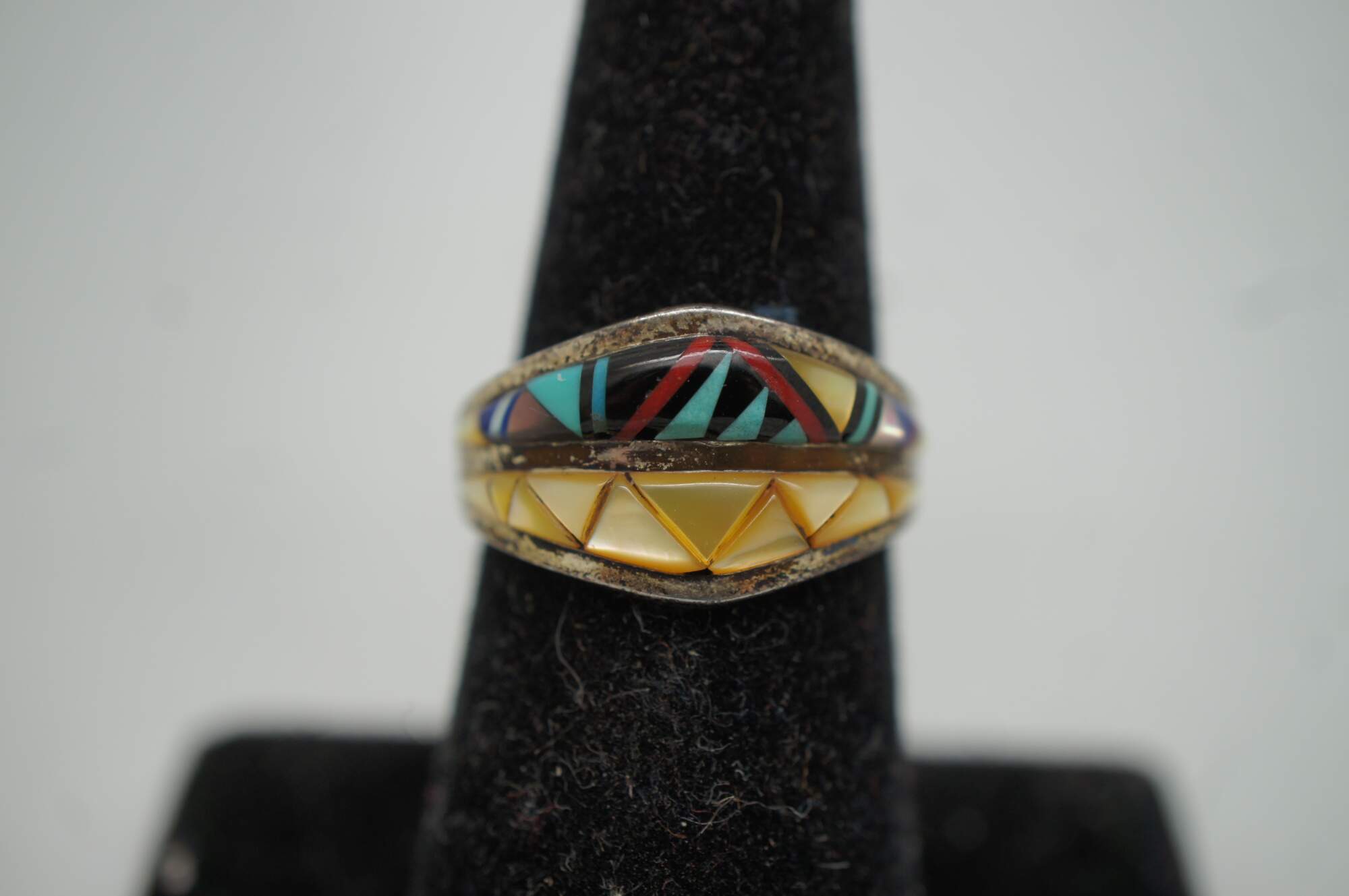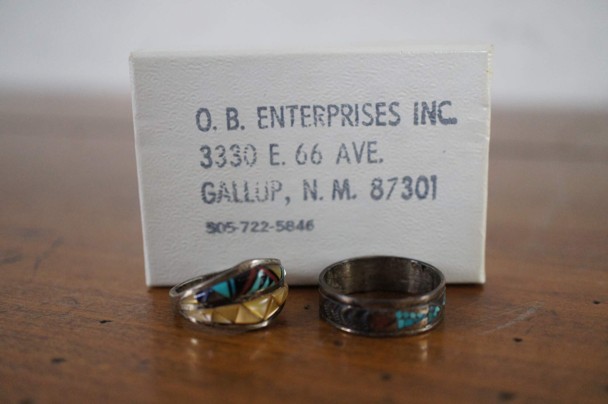 Vintage Native / Southwestern statement rings / bands featuring sterling silver with inlaid mosaic designs. Purchased from OB's Indian American Shop in Gallup New Mexico, circa 1960s-1970s, signed Esalio.