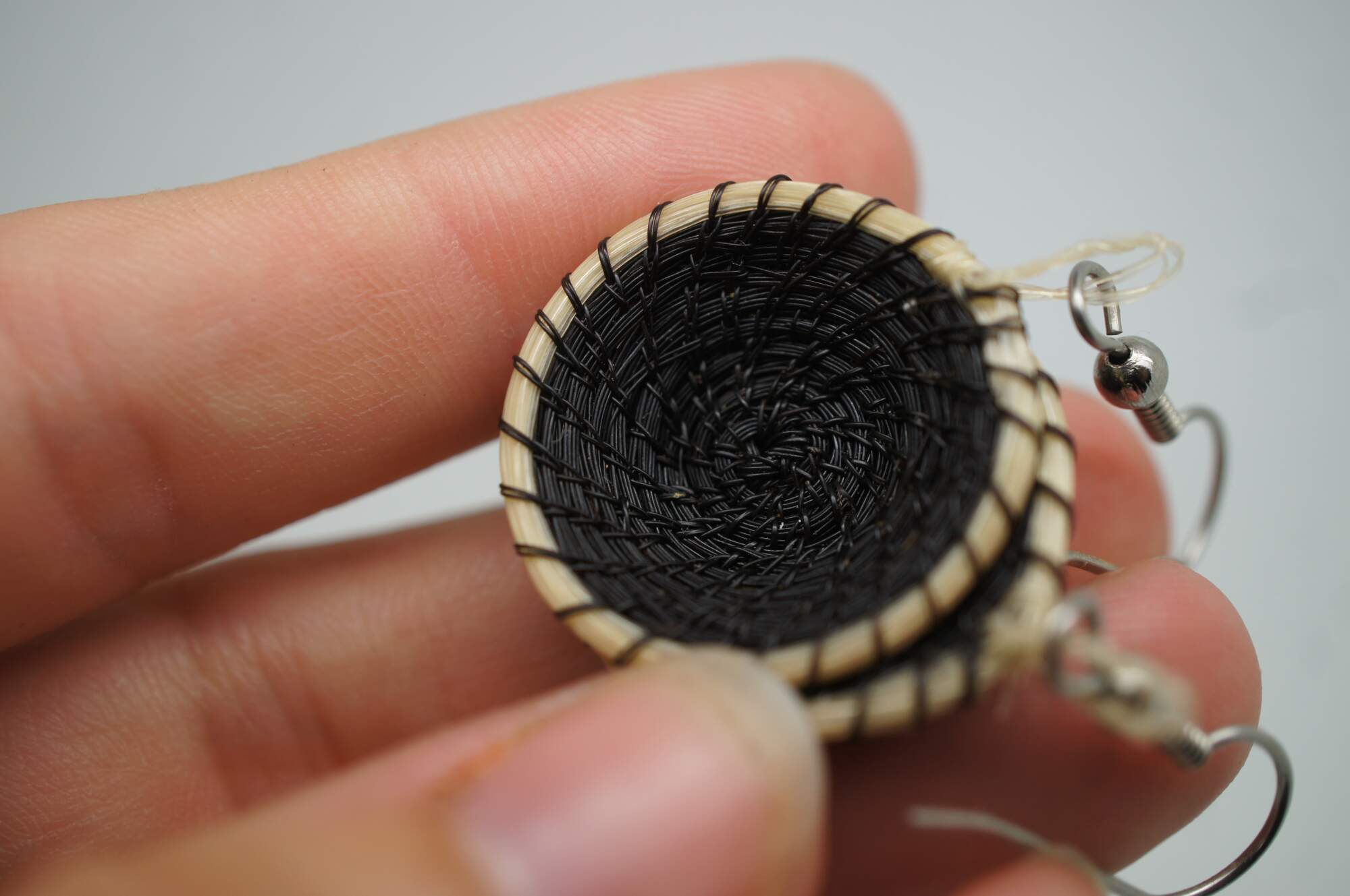 Two pairs of vintage Native American / Southwestern statement earrings. One woven round basket style and the other three strand beaded dangle. Purchased from OB's Indian American Shop in Gallup New Mexico, circa 1960s-1970s, signed Esalio.