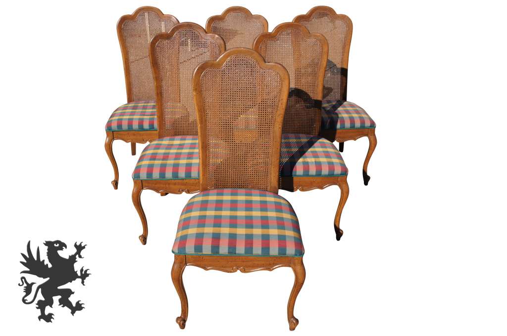 6 French Country Dining Chairs. Feature a cane back, carved accents and cabriole legs.