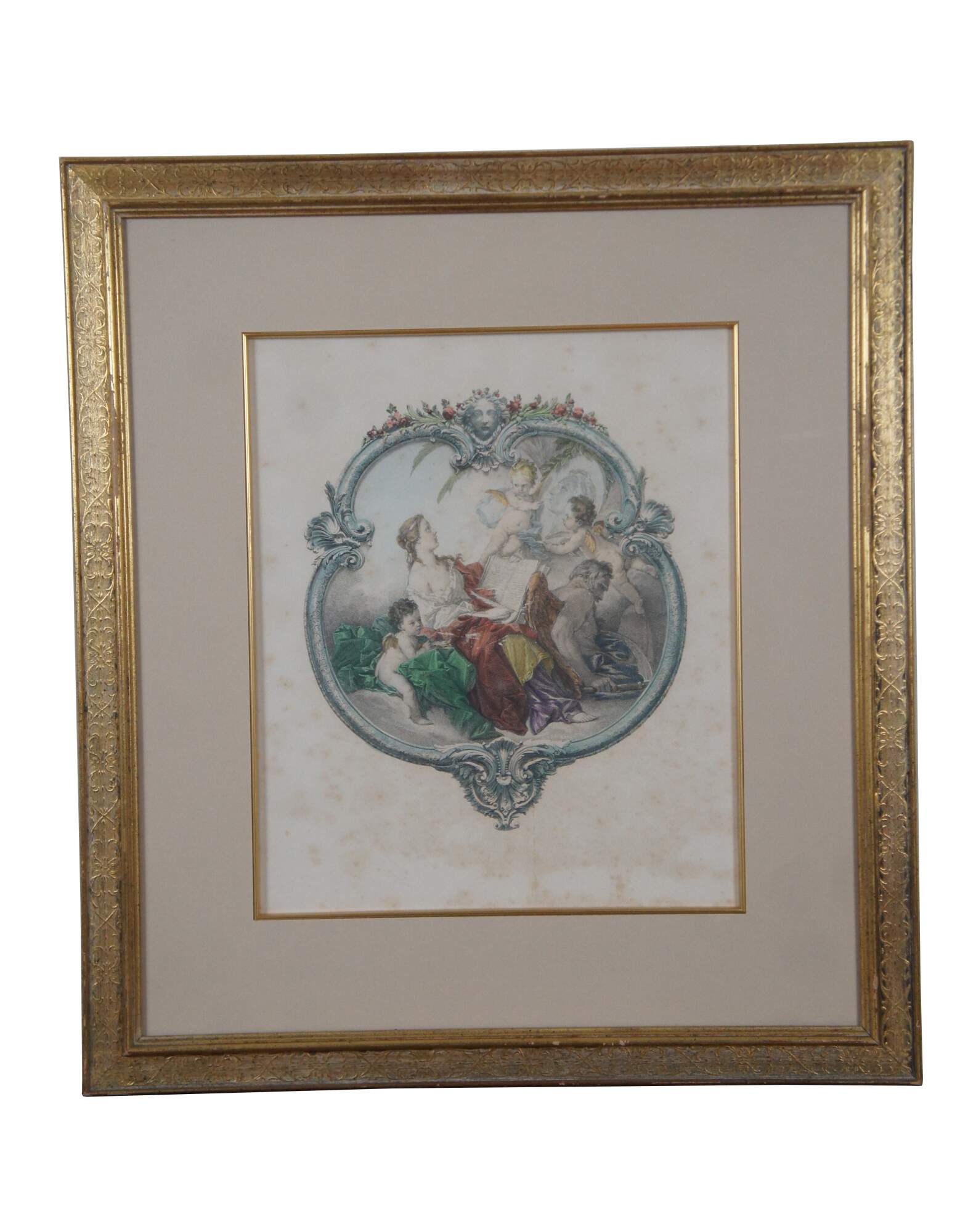 Pair of Fancois Boucher Mezzotint Engravings from the first half of the 20th century The colored engravingss have a classical design with a Poetry theme. Matted and framed in gold.