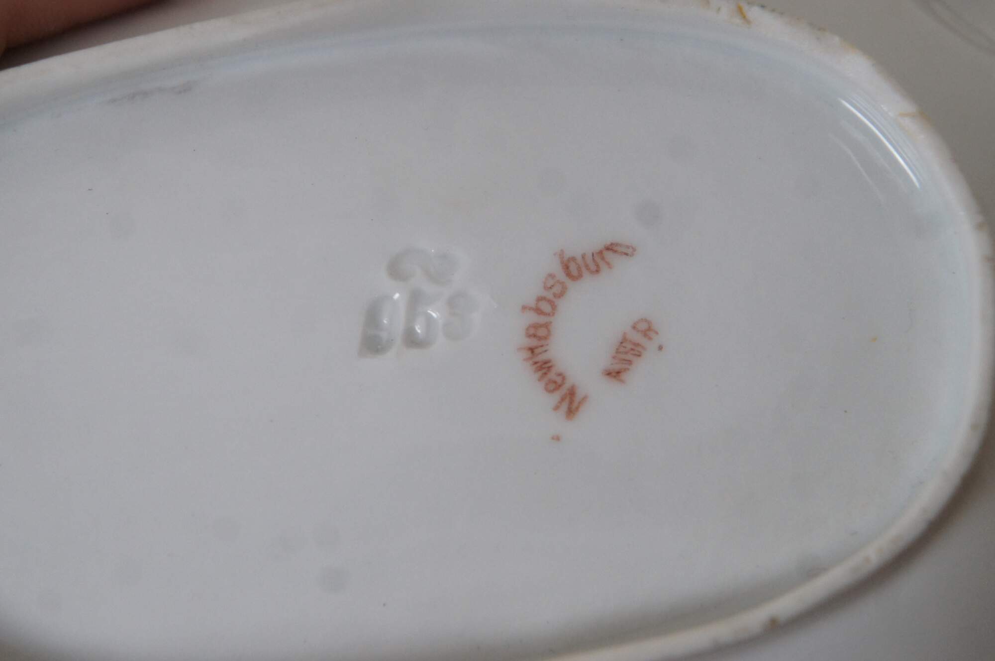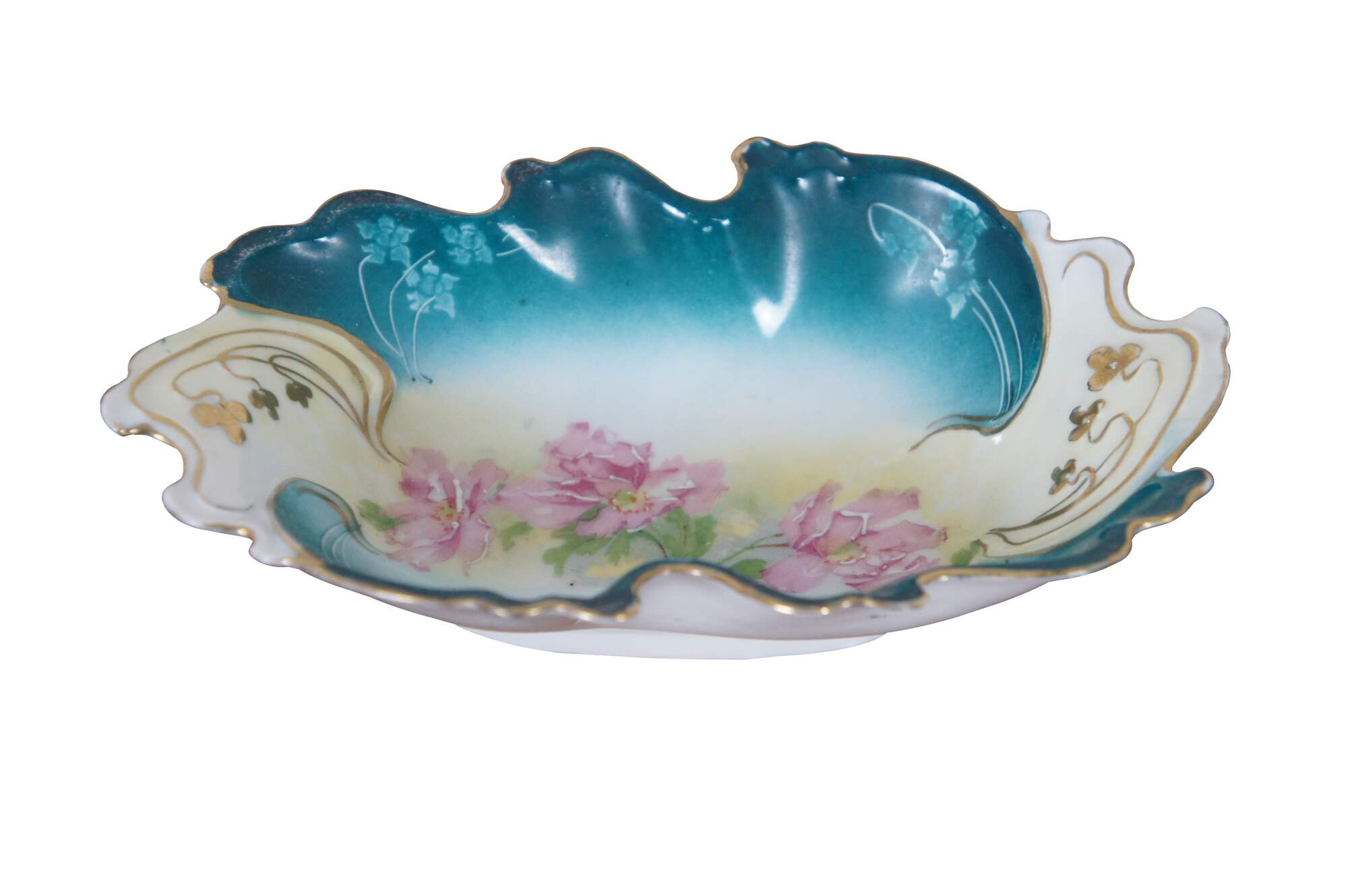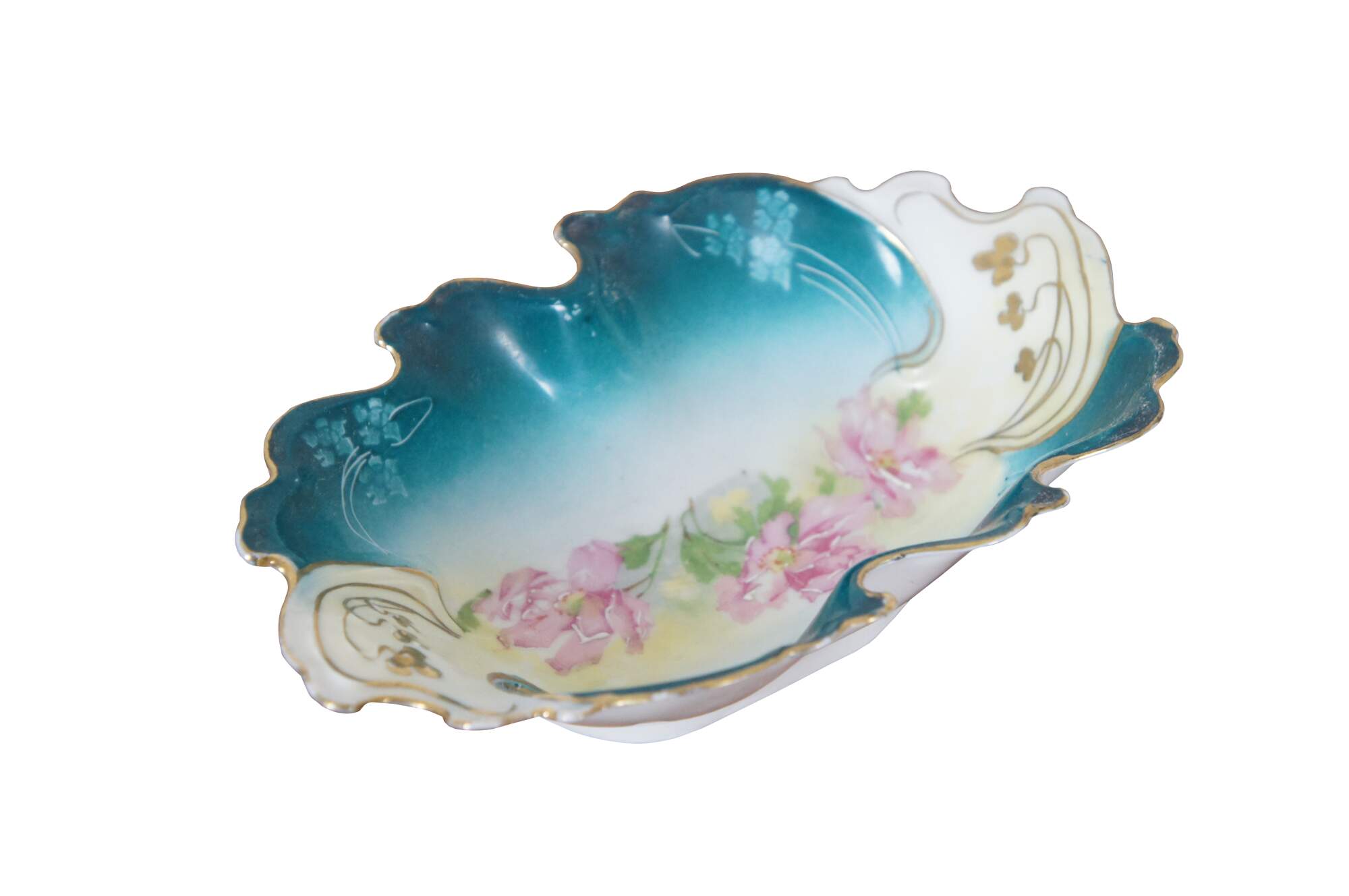 Antique New Habsburg floral centerpiece. Handpainted with pink flowers over a green background with gold trimming.