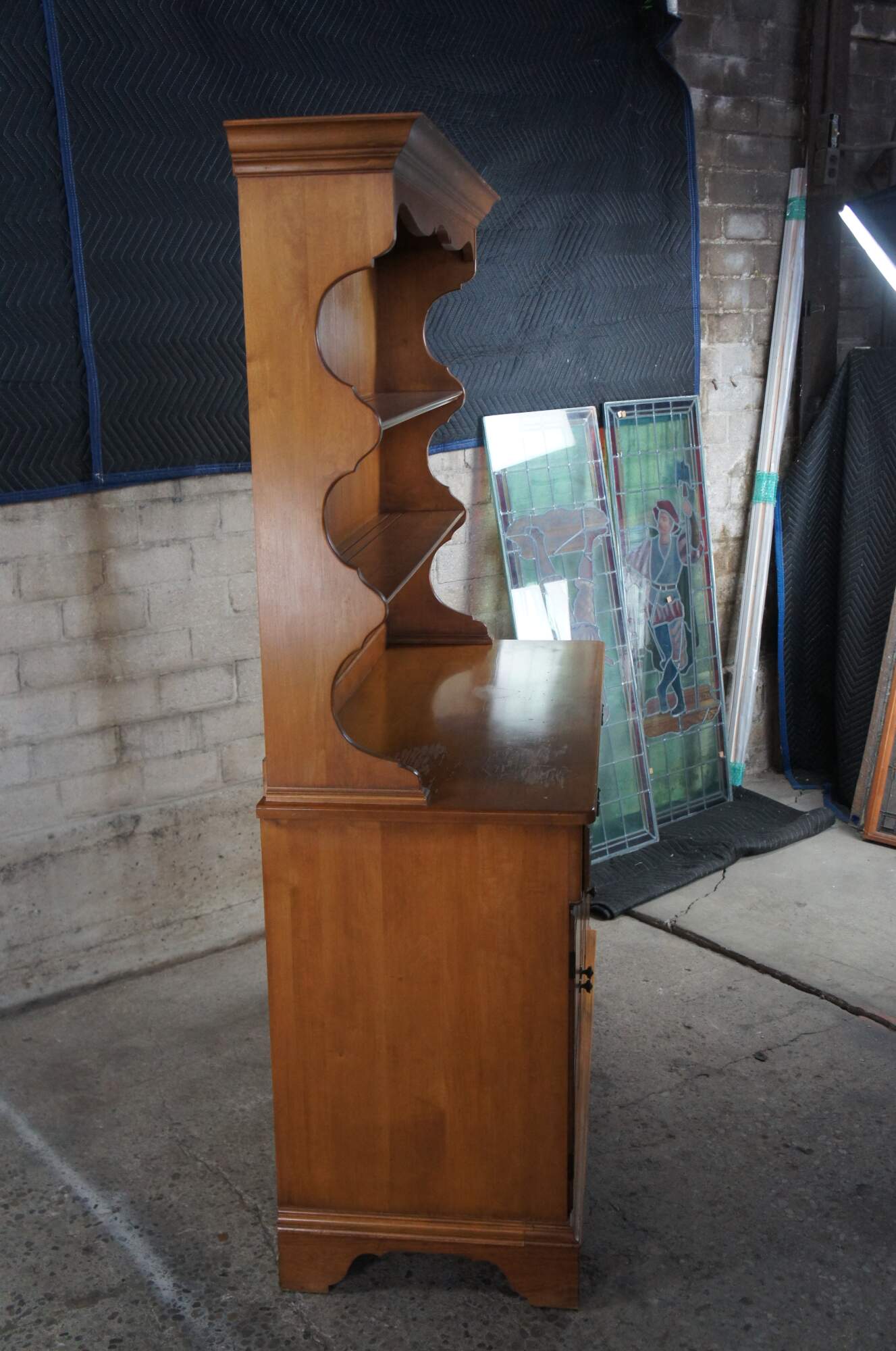 An Early American Colonial style cupboard by Pennsylvannia House, circa 1970s. Made from maple with a serpentine hutch featuring a panelled back and two shelves with plate grooves. Buffet portions has two upper drawers for flatware storage and a lower cabinet with shelf. The case is supported by bracket feet. No-9646, Porestone finish.