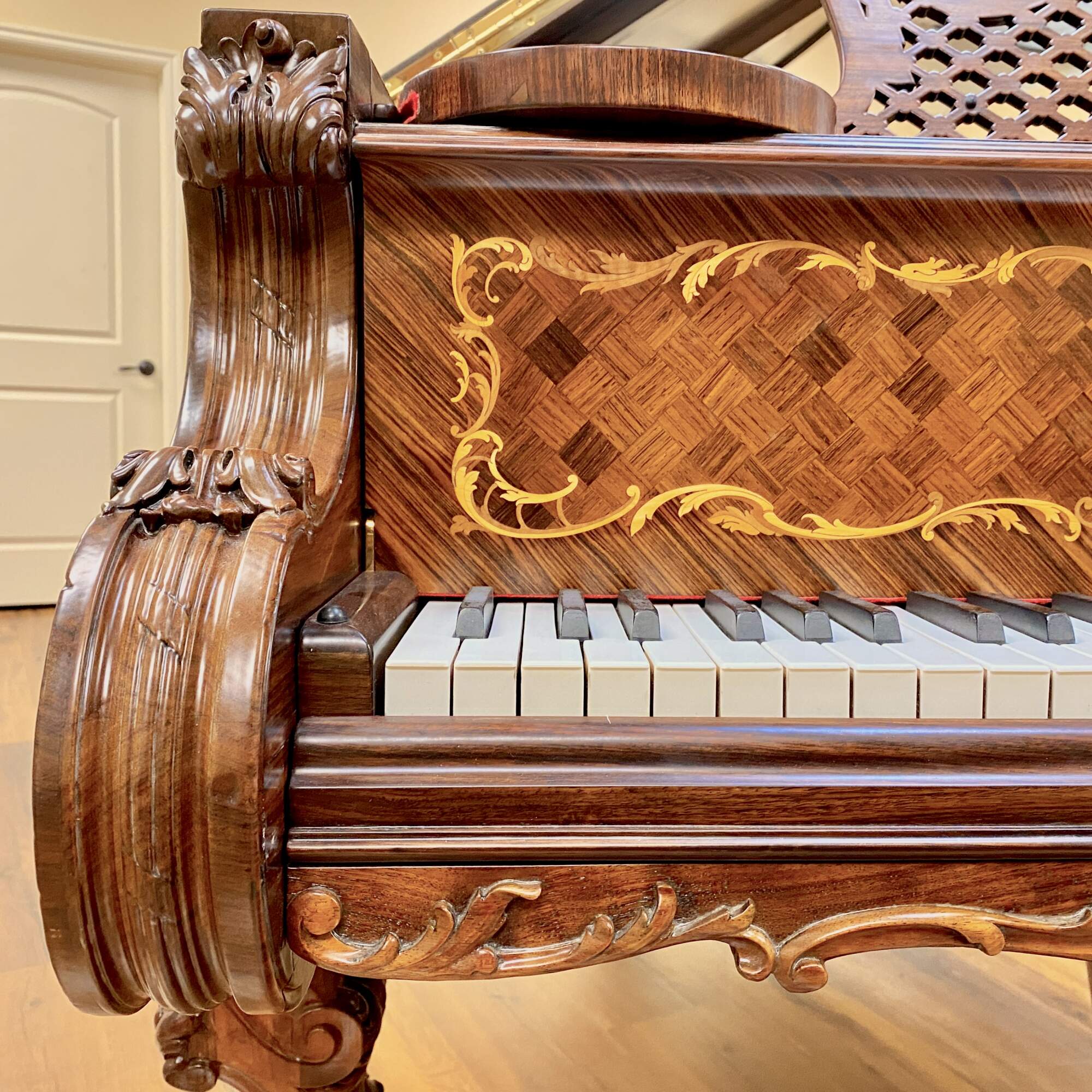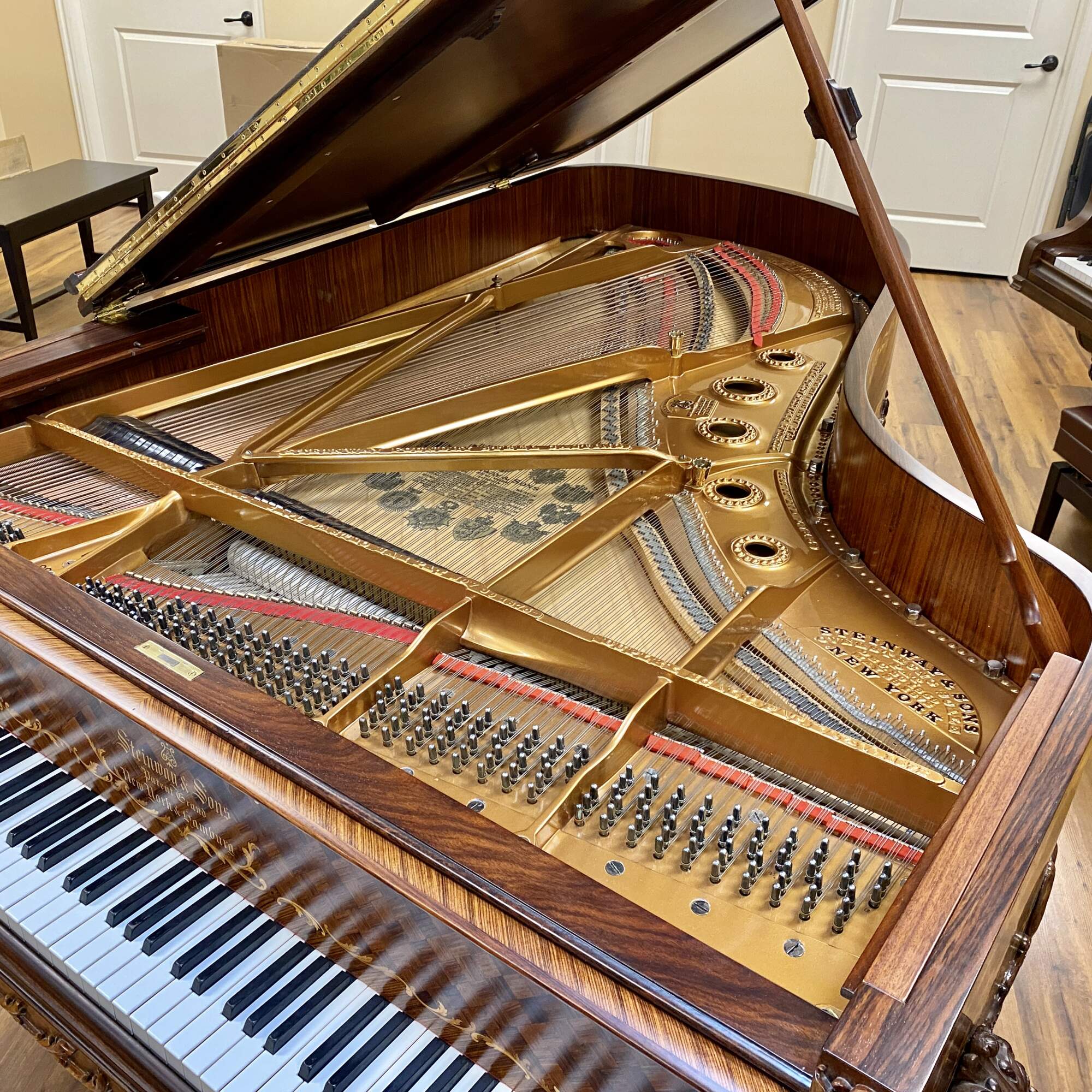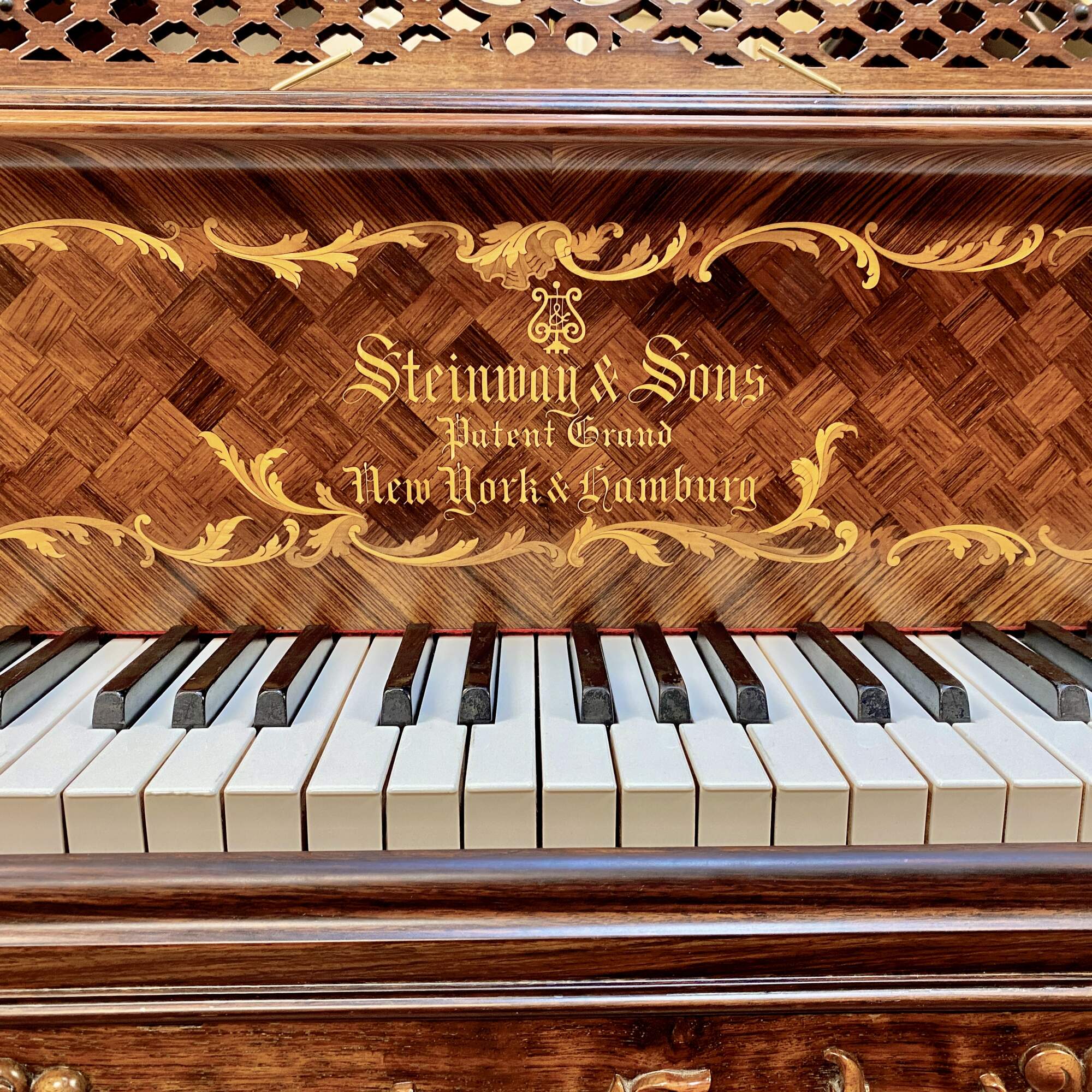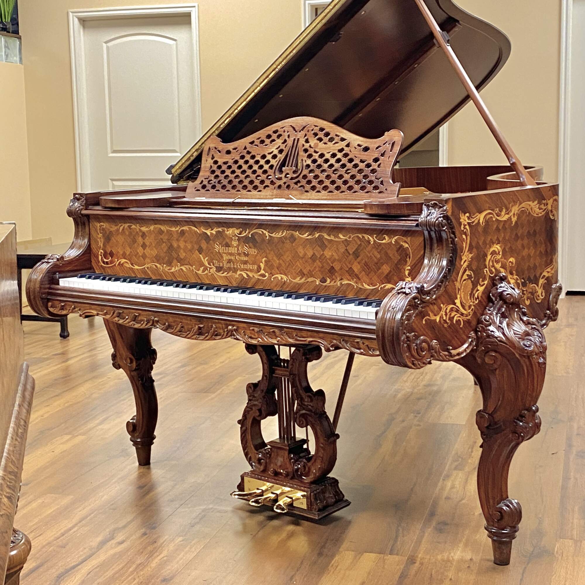 The most exquisitely detailed example of a turn of the century Model B available today, this 122 year old Steinway grand piano has been completely restored to its original splendor. The Rosewood case is clad in panels of book matched veneer, each containing intricate golden scrolled foliate of inlaid fruitwood, surrounding a diamond shaped parquetry checkerboard pattern. This design is repeated on the fall board, as well as the top and face of the folding section of the lid. The fall board also features fully inlaid banding. The fruitwood foliate motif is echoed in the expertly carved trim and sturdy legs, which also feature deeply carved scallop shell knees and scrolled feet. The music desk features an oxbow shaped back support carved with a lyre trimmed in curtain swags on a backdrop of pierced lattice. It folds down and slides back and forth easily and features two swiveling brass sheet music holders at the front edge. The kick board has a lyre carved form with dentil molding and three brass pedals.