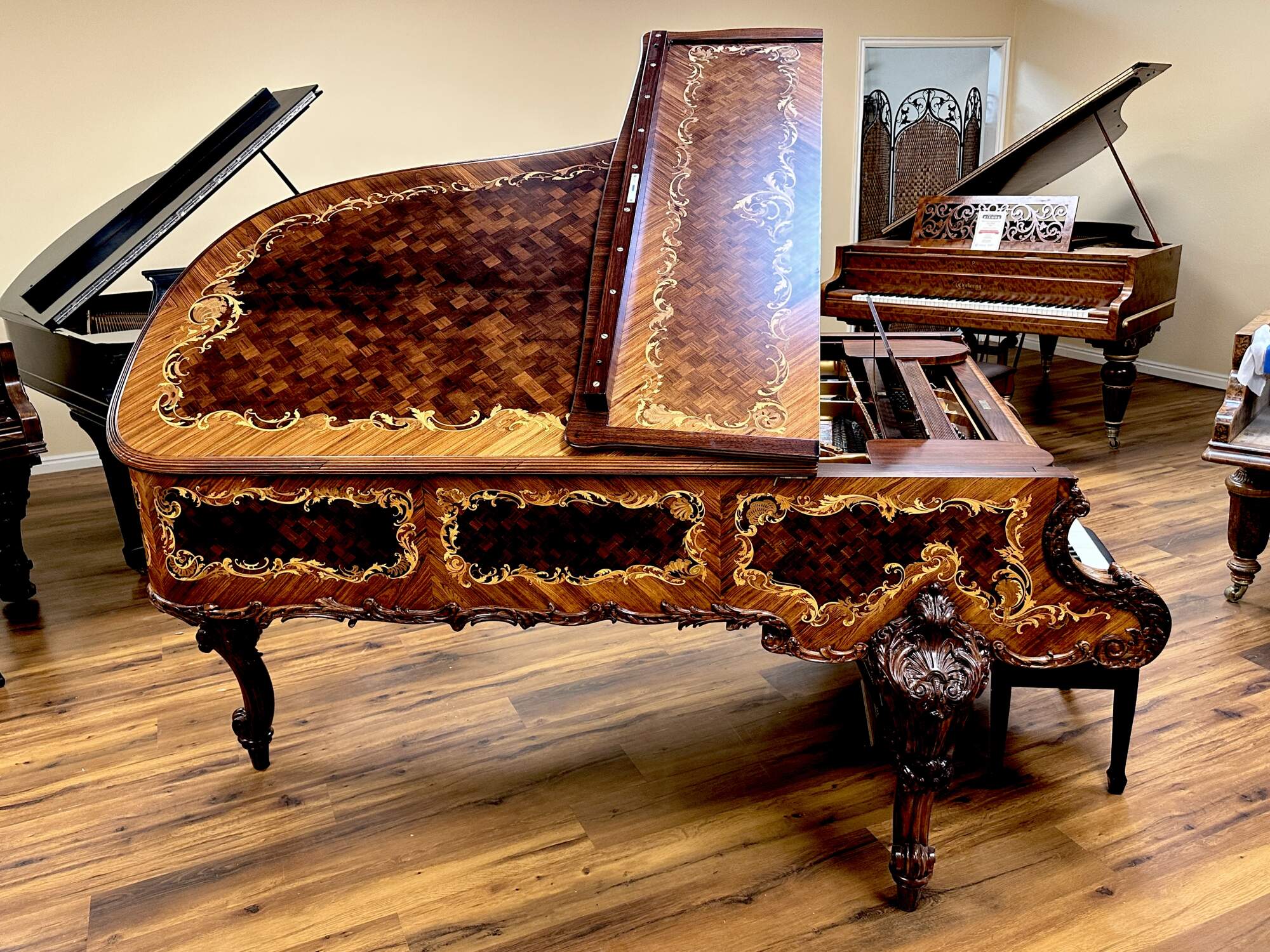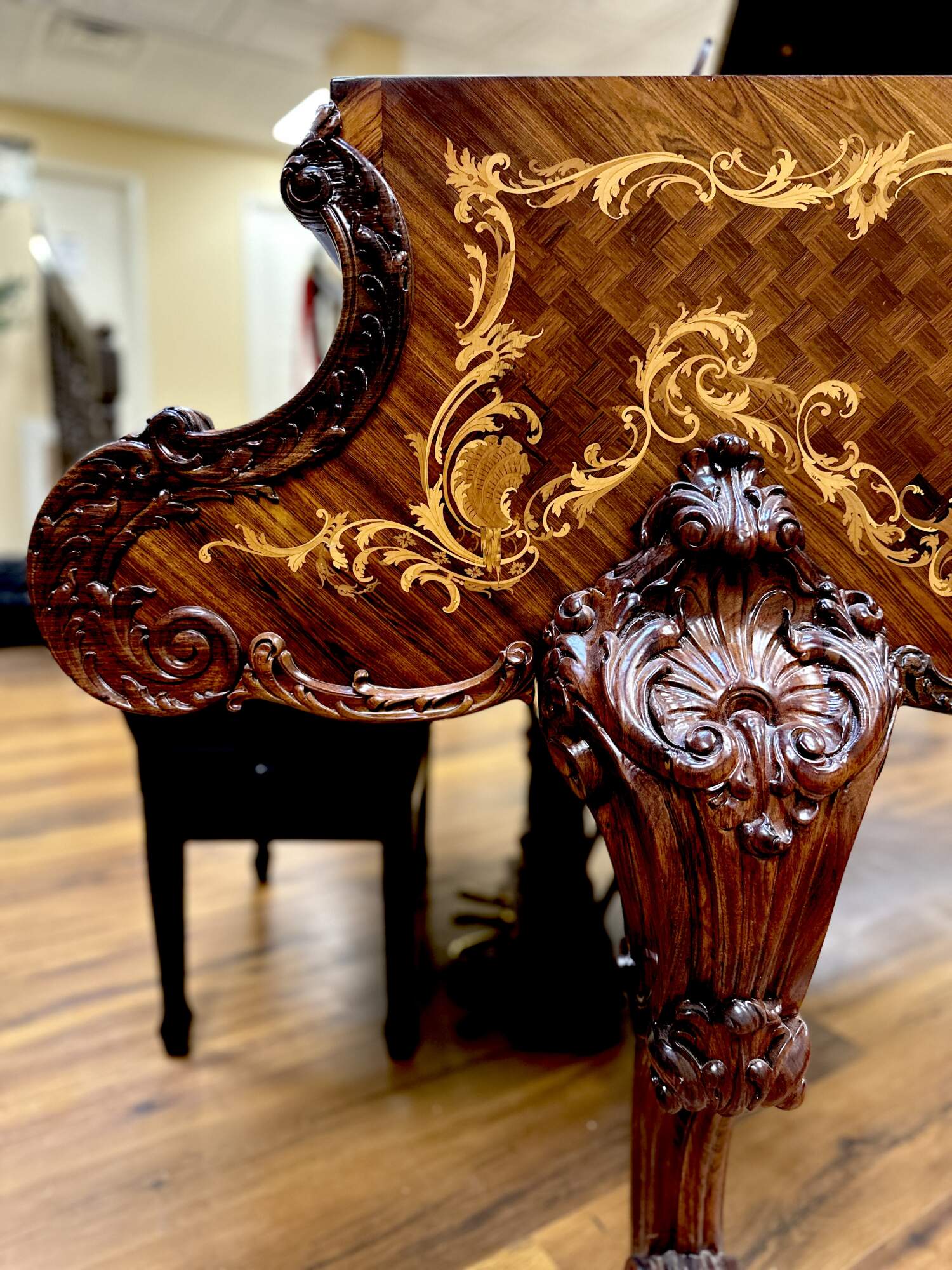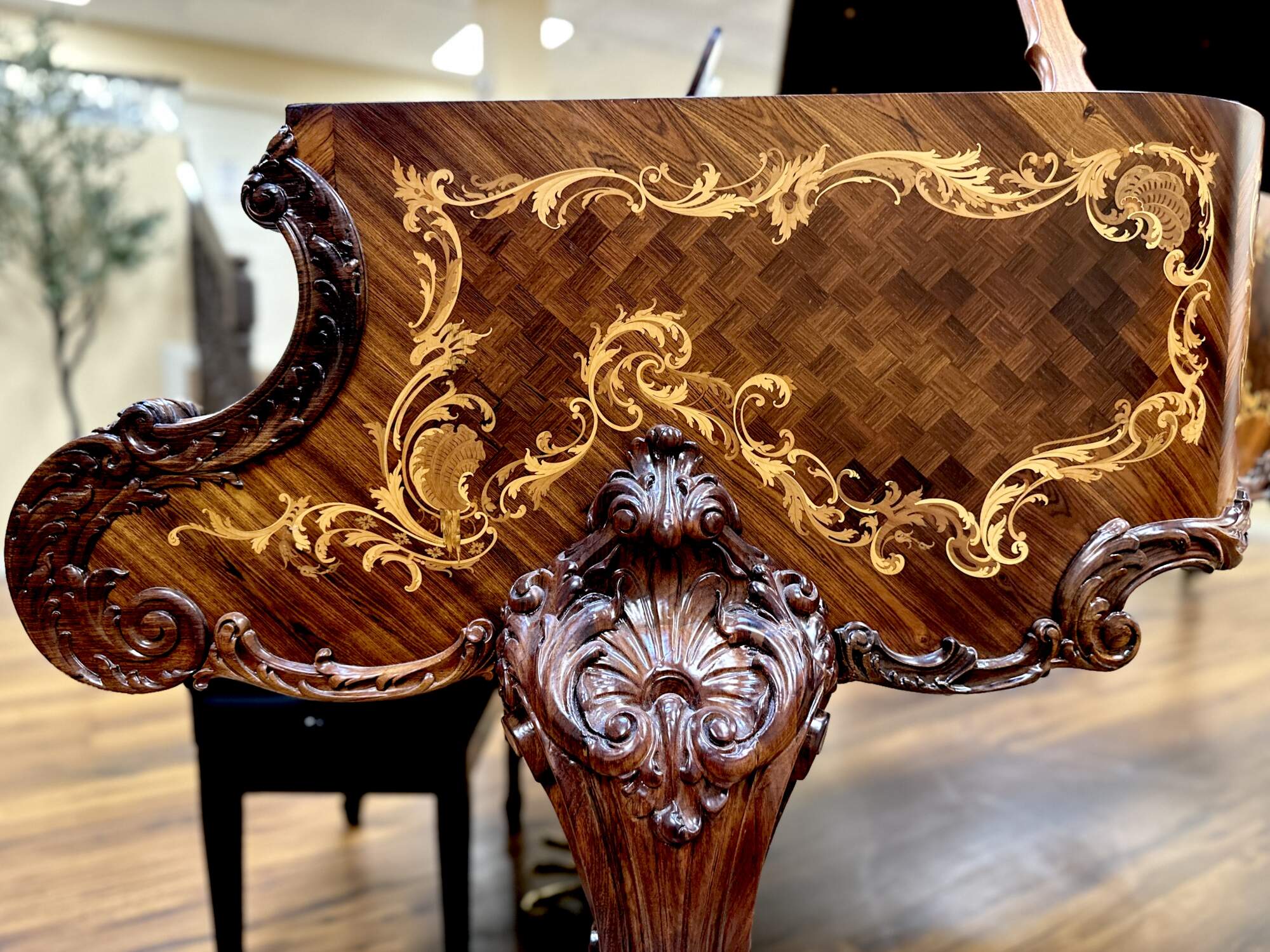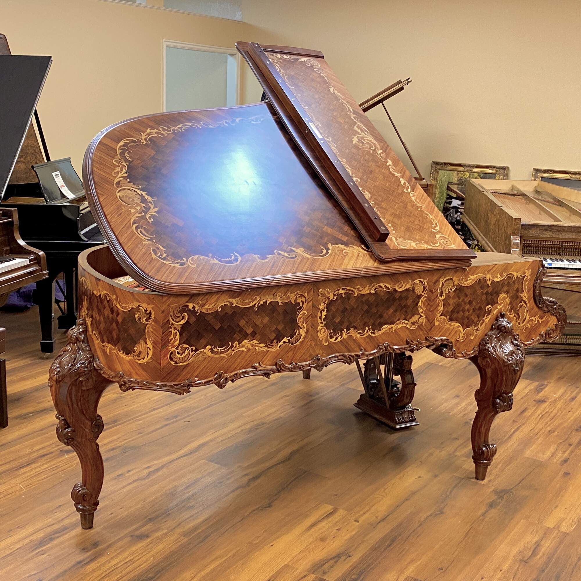 The most exquisitely detailed example of a turn of the century Model B available today, this 122 year old Steinway grand piano has been completely restored to its original splendor. The Rosewood case is clad in panels of book matched veneer, each containing intricate golden scrolled foliate of inlaid fruitwood, surrounding a diamond shaped parquetry checkerboard pattern. This design is repeated on the fall board, as well as the top and face of the folding section of the lid. The fall board also features fully inlaid banding. The fruitwood foliate motif is echoed in the expertly carved trim and sturdy legs, which also feature deeply carved scallop shell knees and scrolled feet. The music desk features an oxbow shaped back support carved with a lyre trimmed in curtain swags on a backdrop of pierced lattice. It folds down and slides back and forth easily and features two swiveling brass sheet music holders at the front edge. The kick board has a lyre carved form with dentil molding and three brass pedals.