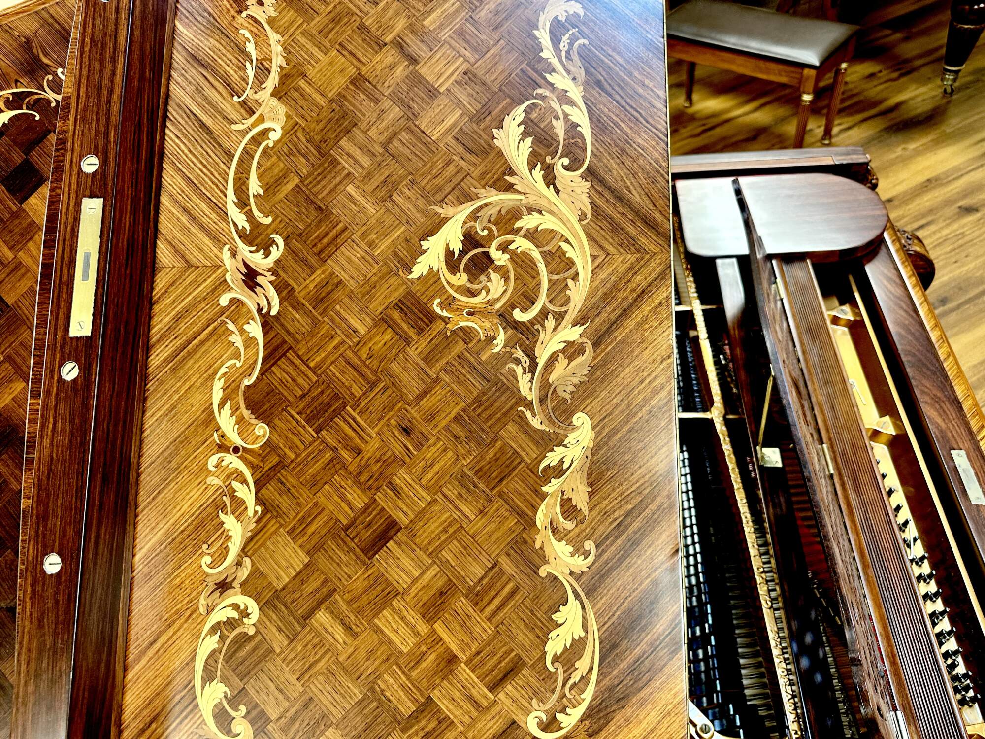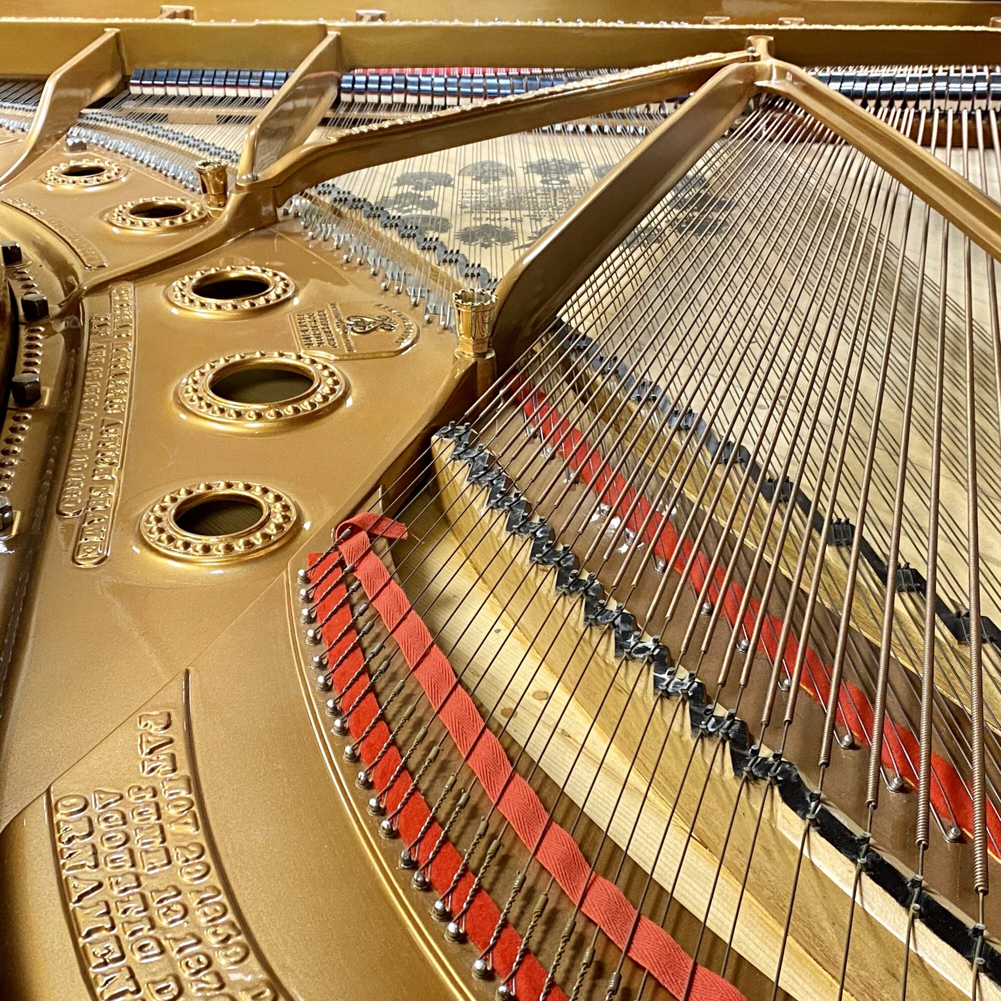 The soundboard was completely rebuilt, with the intention of maintaining the original tone of the instrument. The cast iron plate was re-gilded and the entire action has been replaced with brand new components including new strings, dampers, tuning pins (all tuned to 100-120lbs of torque), hammers shanks, whippens, keys, and bushings. The case and instrument was a multi-year meticulous restoration by the industries finest.