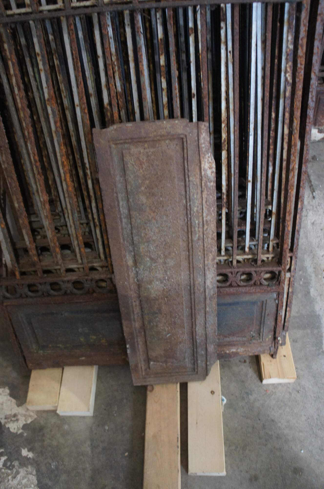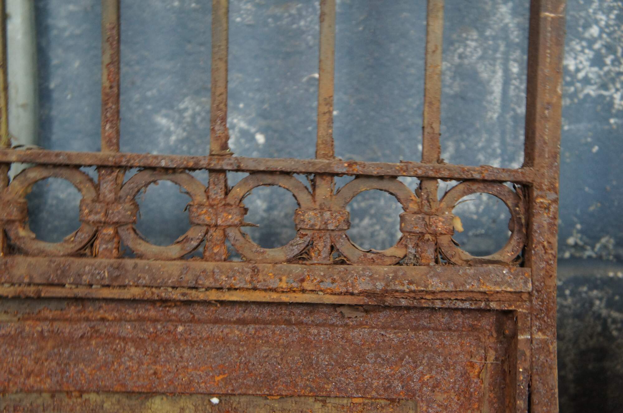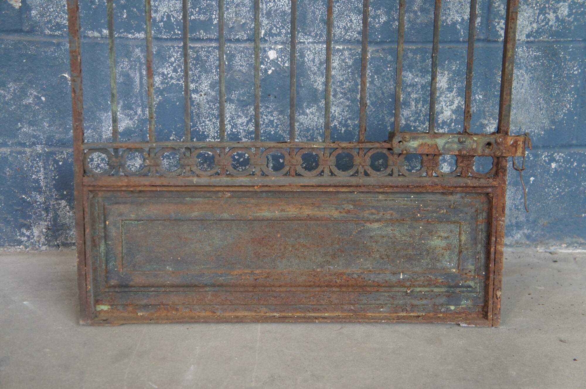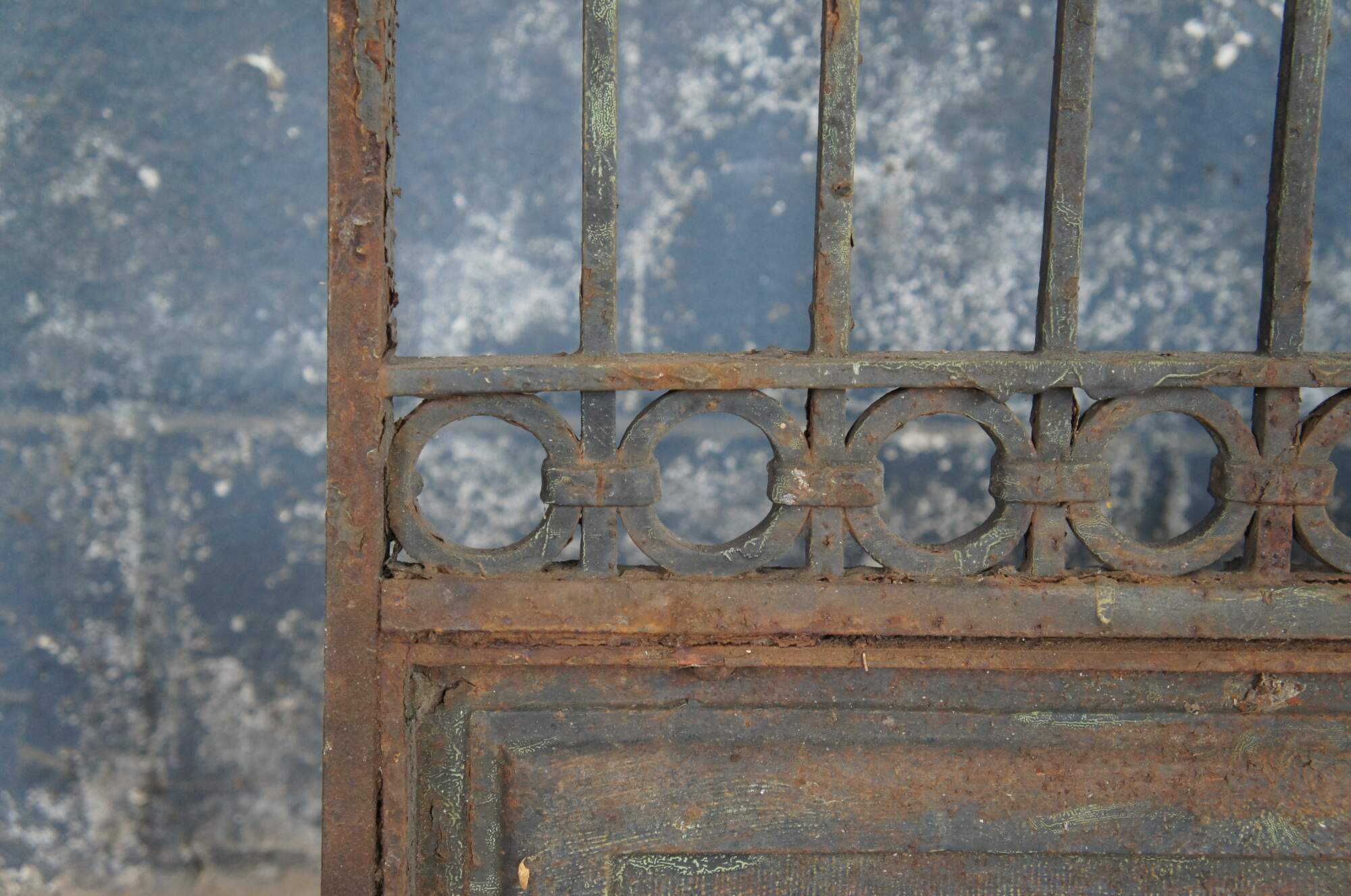 Intriguing set of 37 antique Victorian Era reclaimed architectural garden fence grates. Made from Iron with ornate Neoclassical styling. Each door or panel features squared off vertical posts offset by rungs. The bases have an inset panel below a row of rings. Great for use as fencing or a doorway.