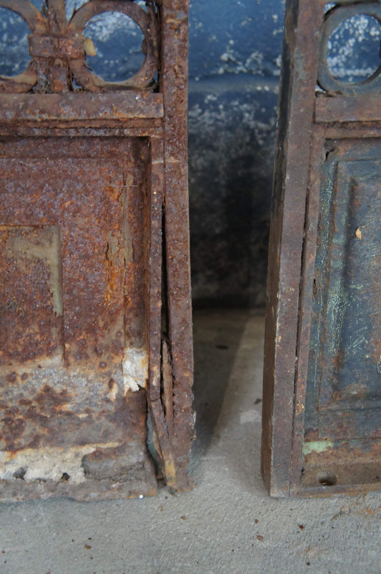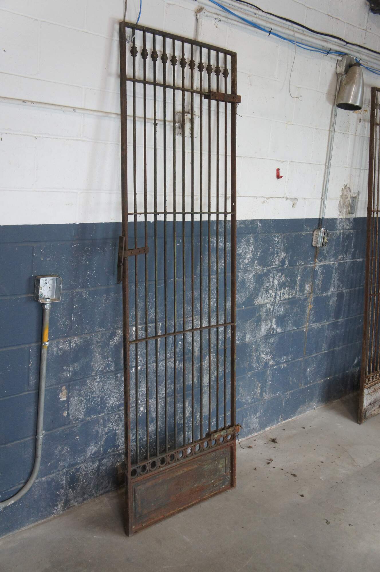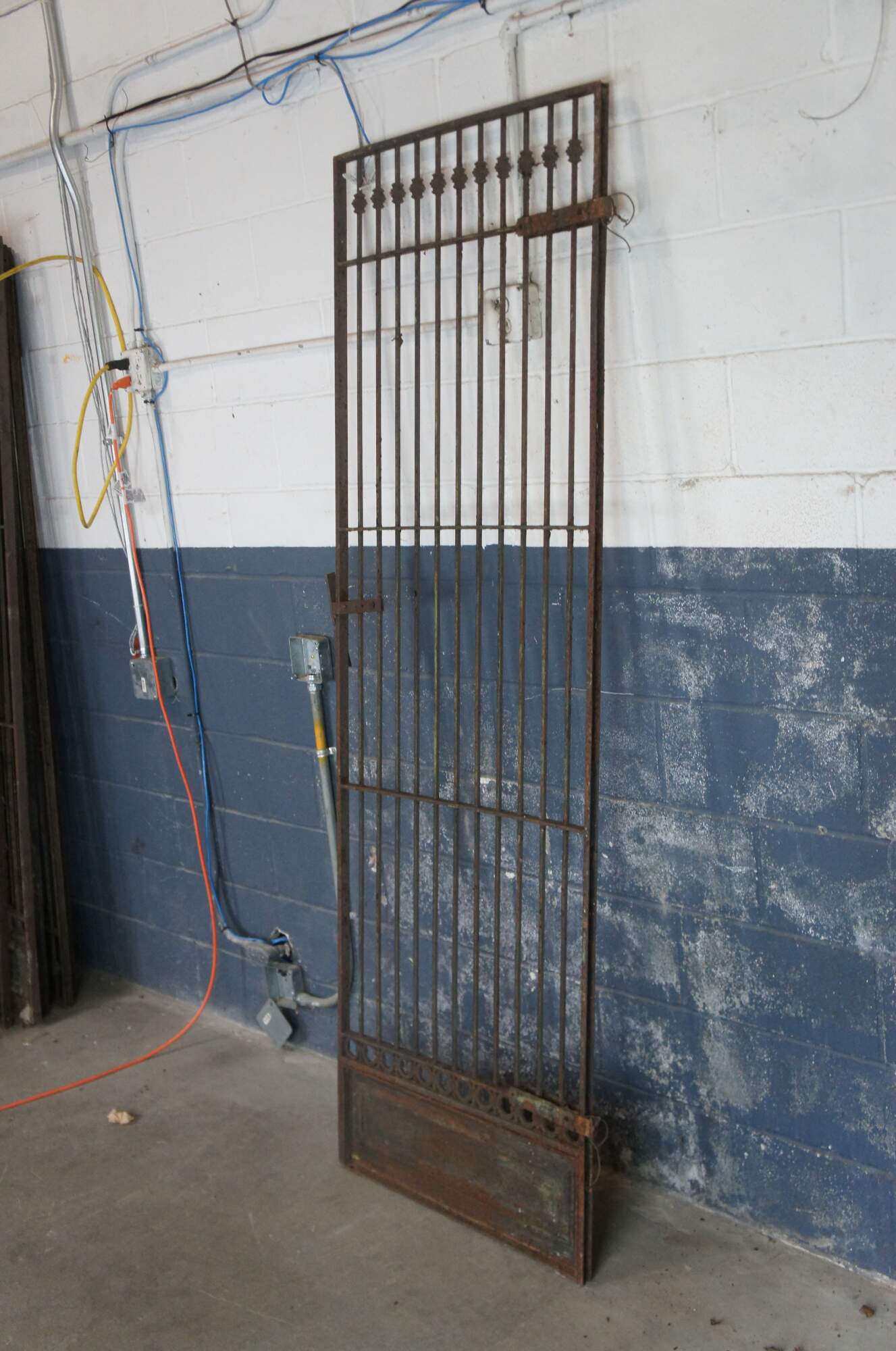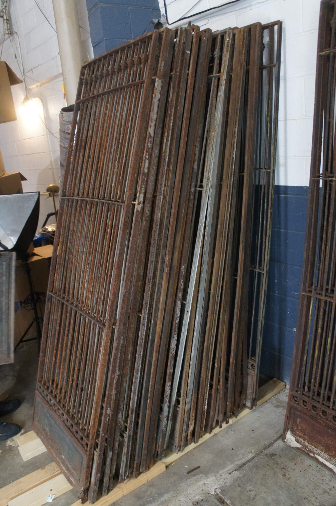 Intriguing set of 37 antique Victorian Era reclaimed architectural garden fence grates. Made from Iron with ornate Neoclassical styling. Each door or panel features squared off vertical posts offset by rungs. The bases have an inset panel below a row of rings. Great for use as fencing or a doorway.