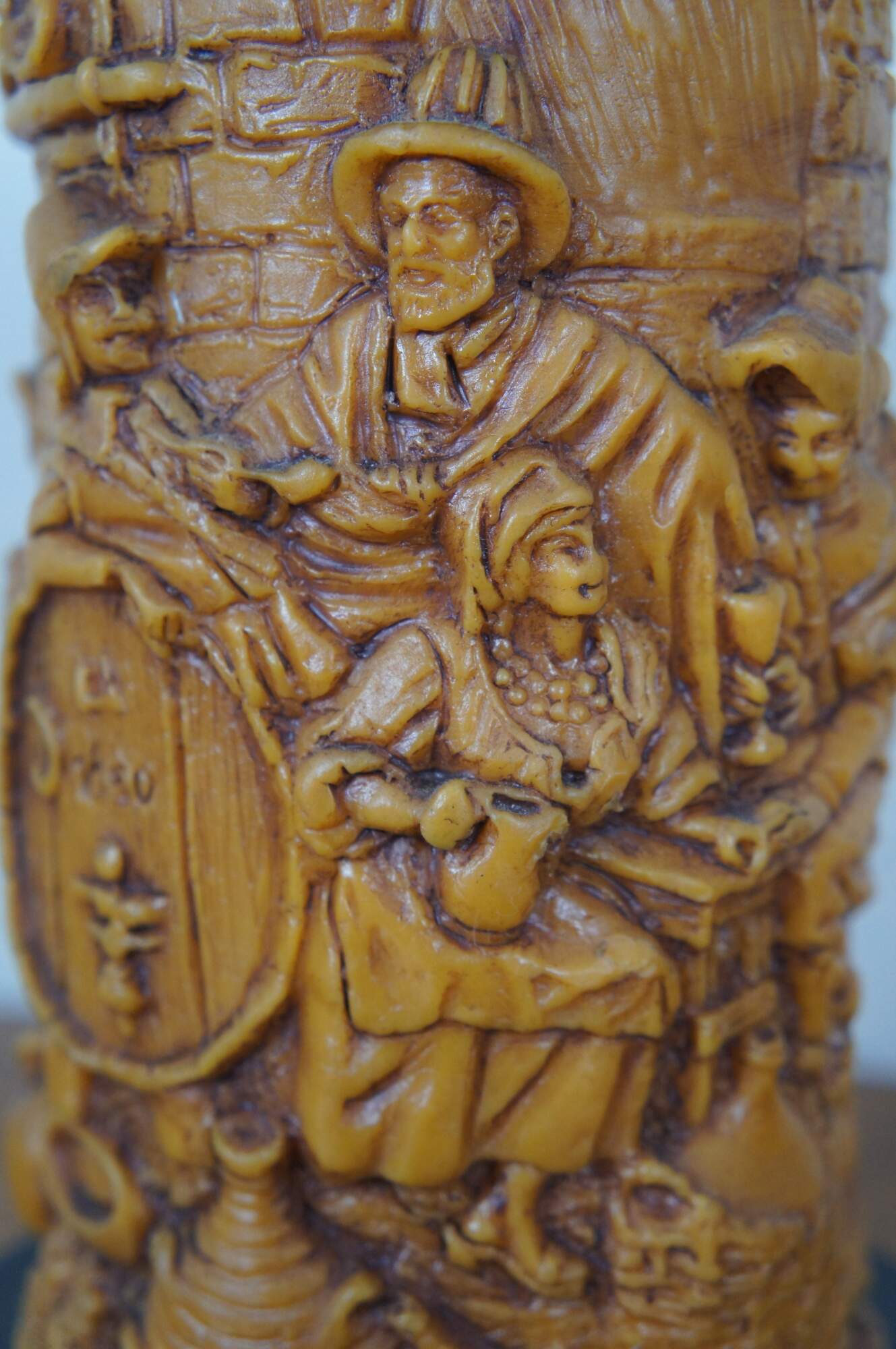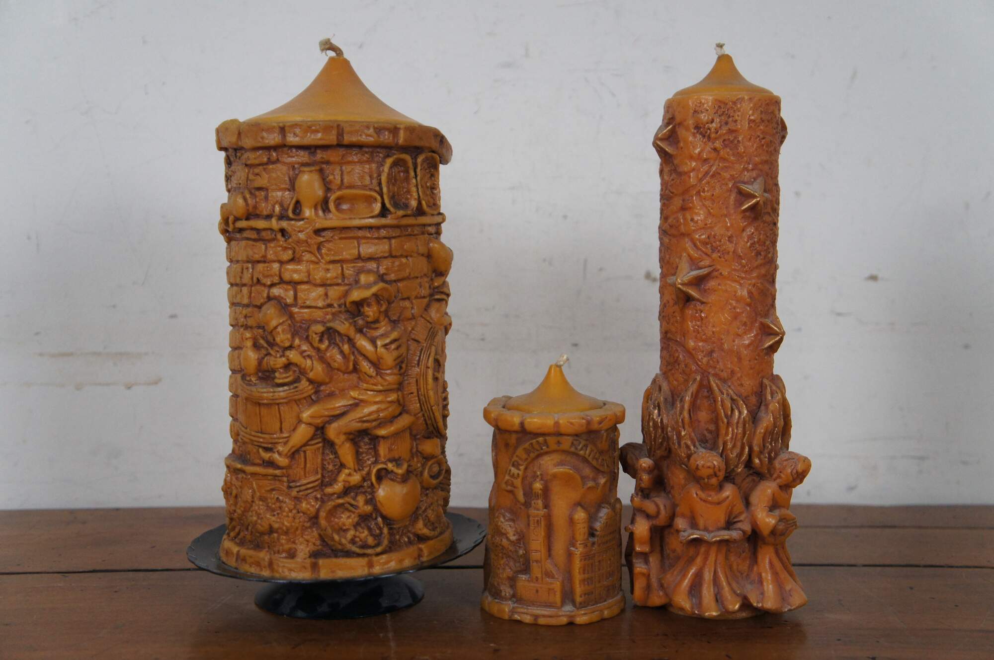 3 Vintage German candles by Miller-Kerzen. Features a Renaissance tavern scene, Augsberg-Steinmann cityscape, and one featuring a choir of angels under a starry sky.