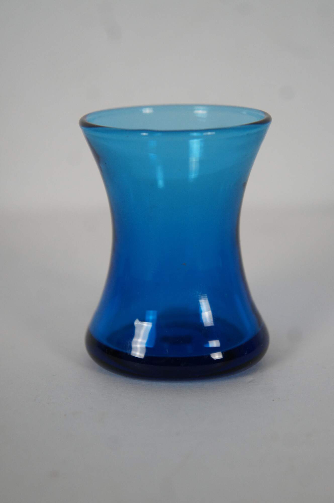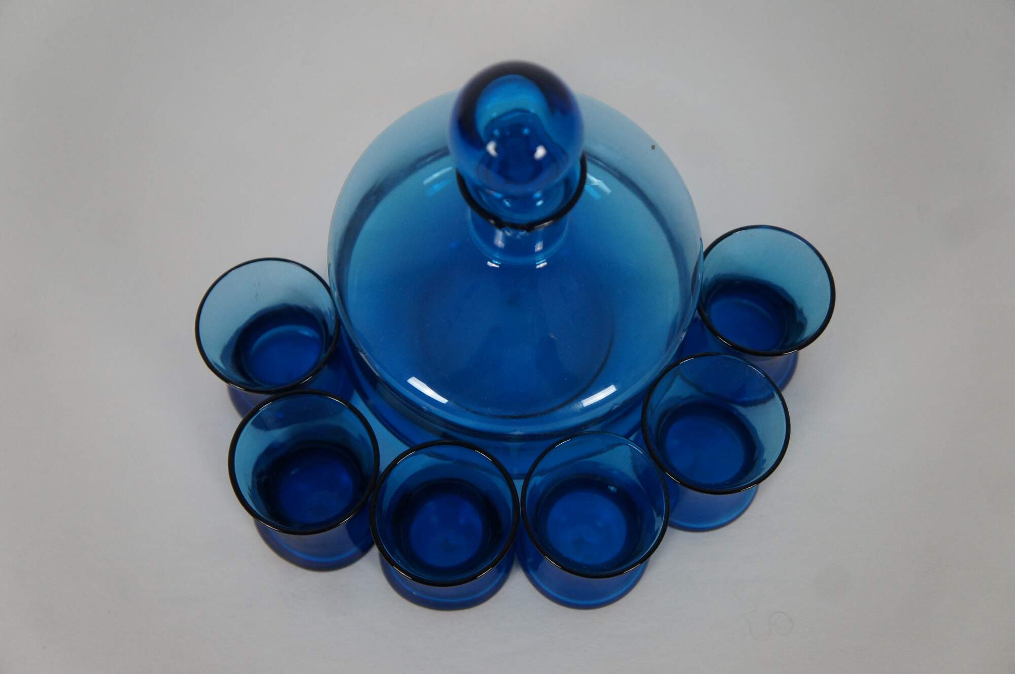 Mid century hand blown Czechoslovakian / Bohemian blue glass decanter and six cordial shot glasses featuring a stopper and spout.