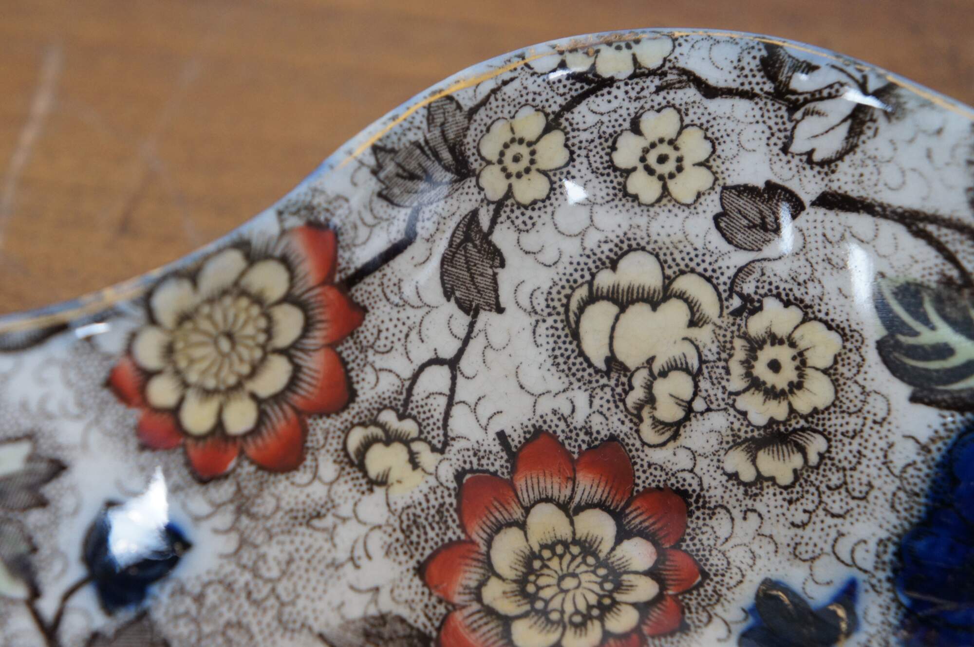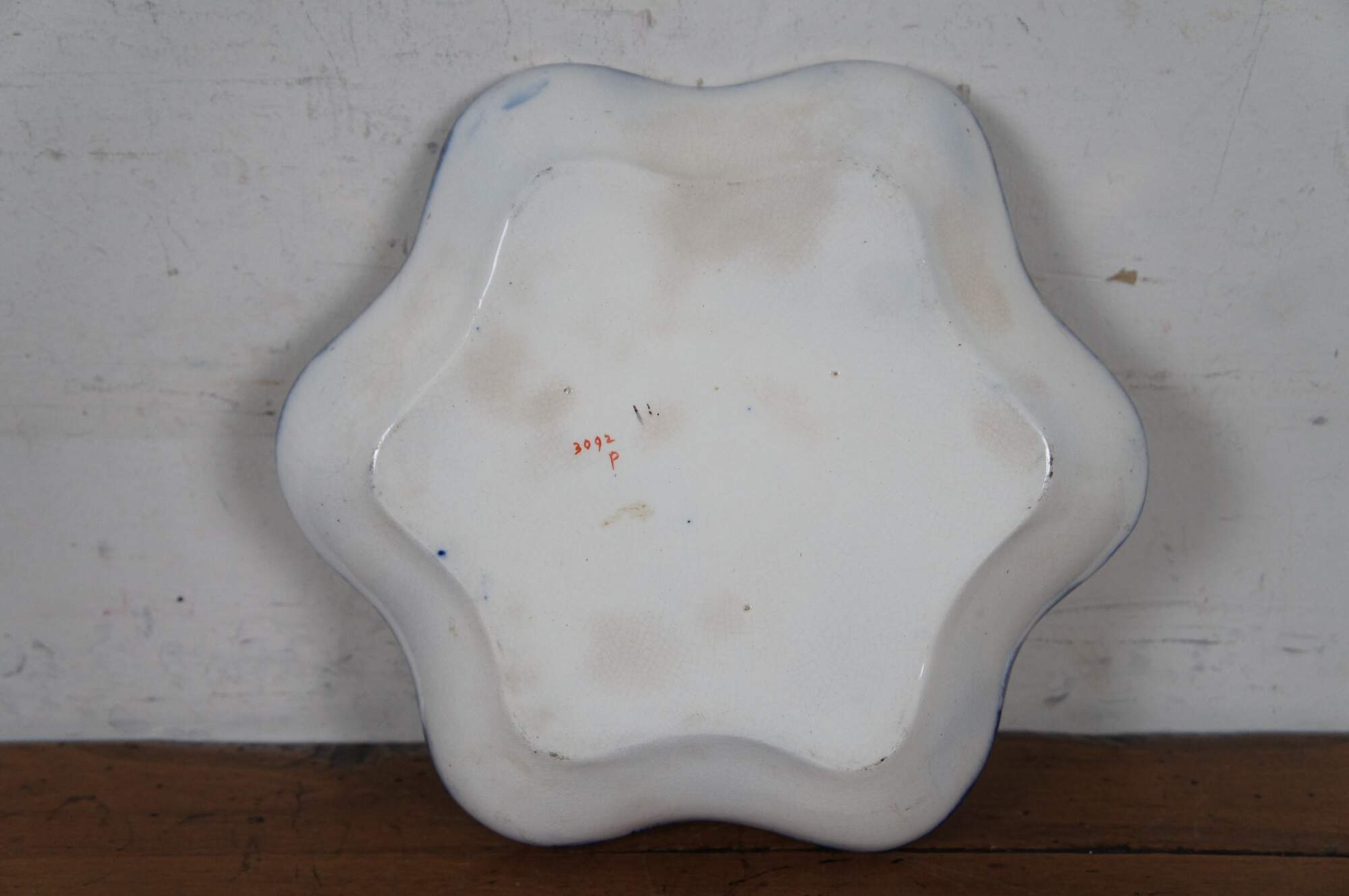Antique Japanese Imari serving dish or bowl featuring a hexagonal freeform ruffled serpentine edge with floral motif. Attributed to Hollinshead & Kirkham. Marked 3092 P on base.