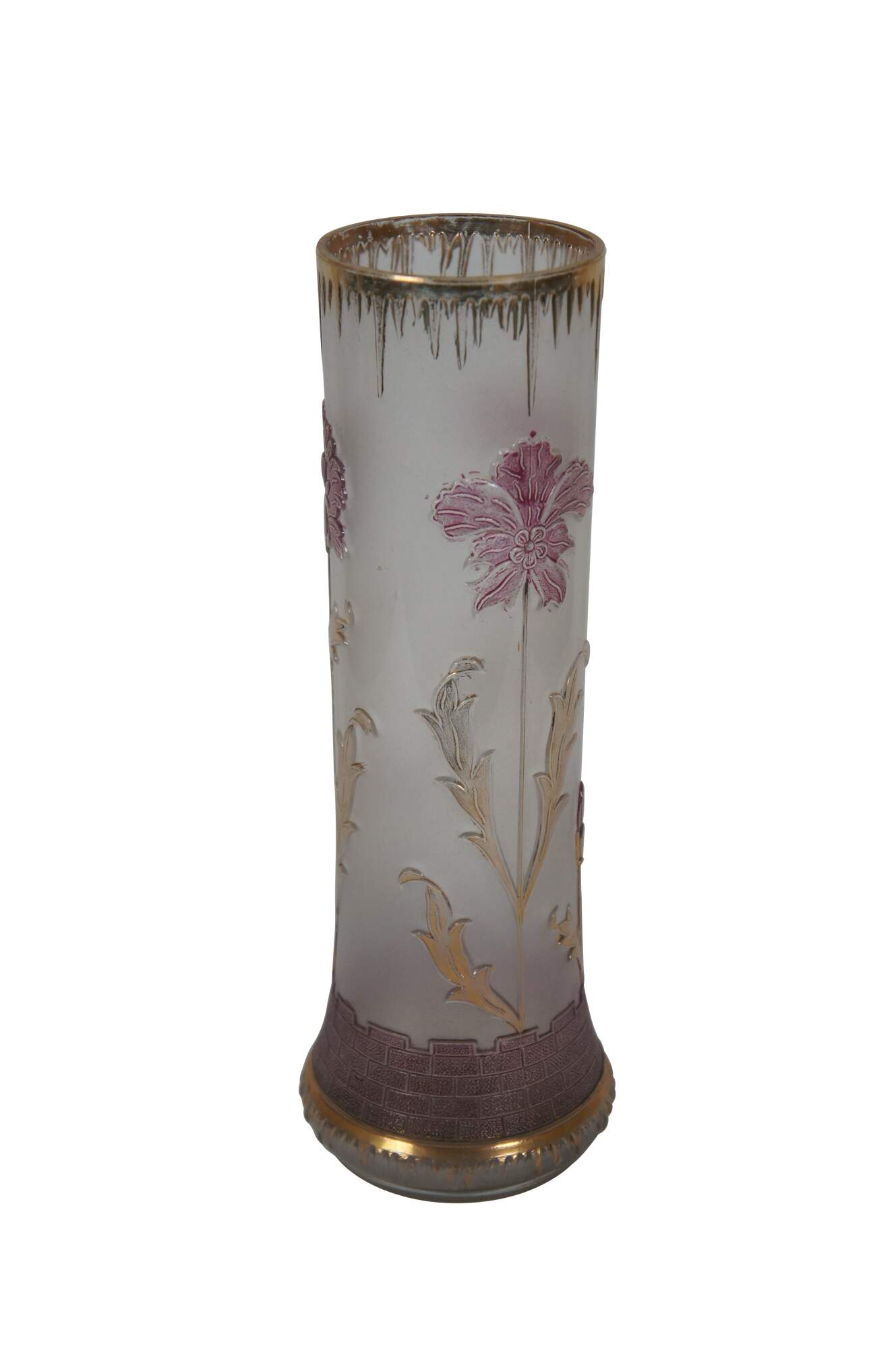 Antique pressed glass vase featuring tall cylidrical form with floral motif, castle walls, and gilded rim.