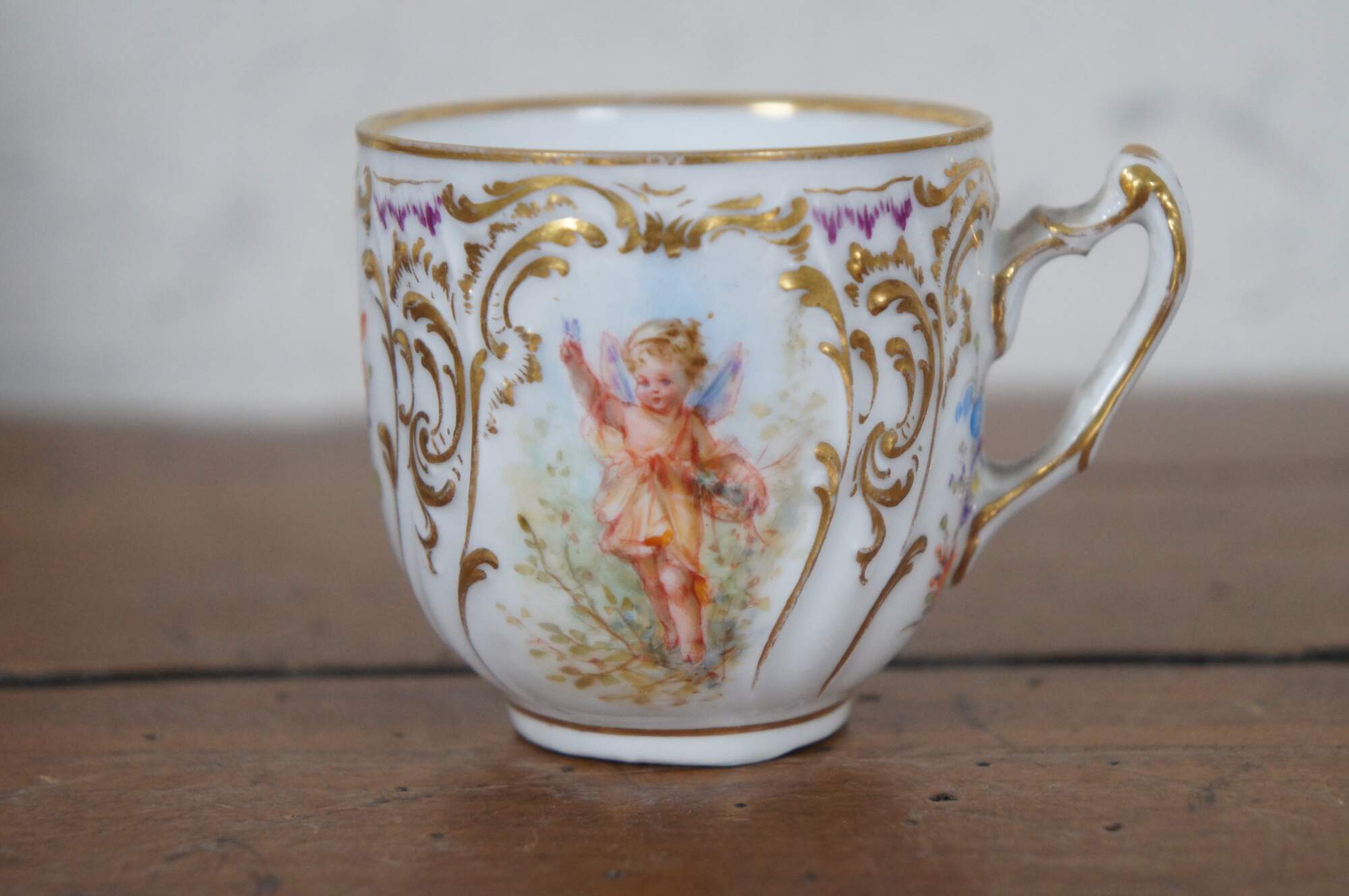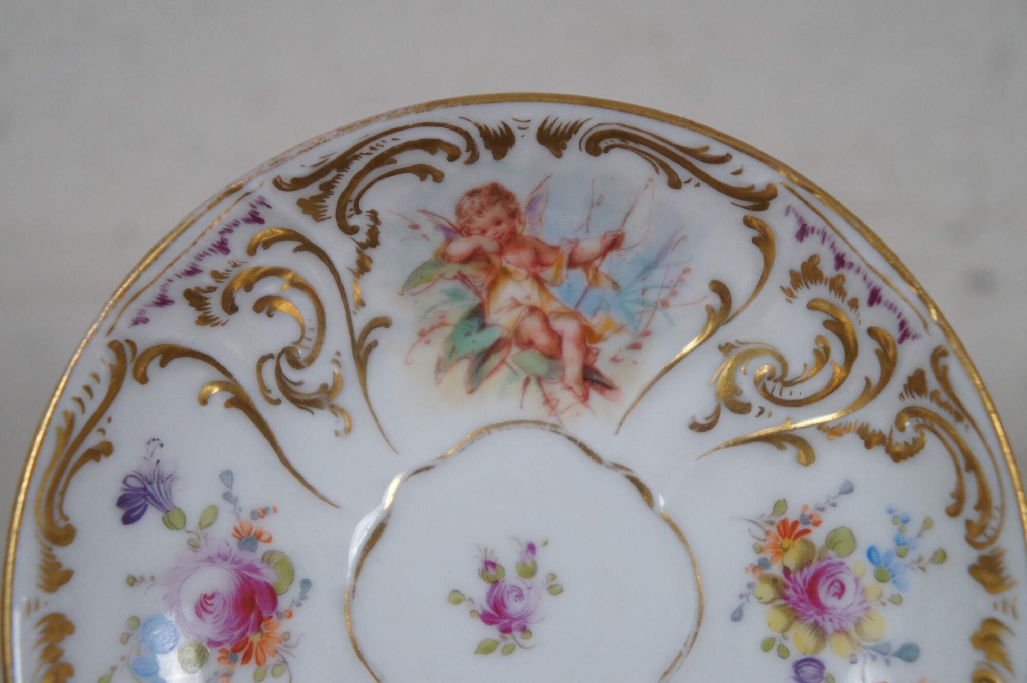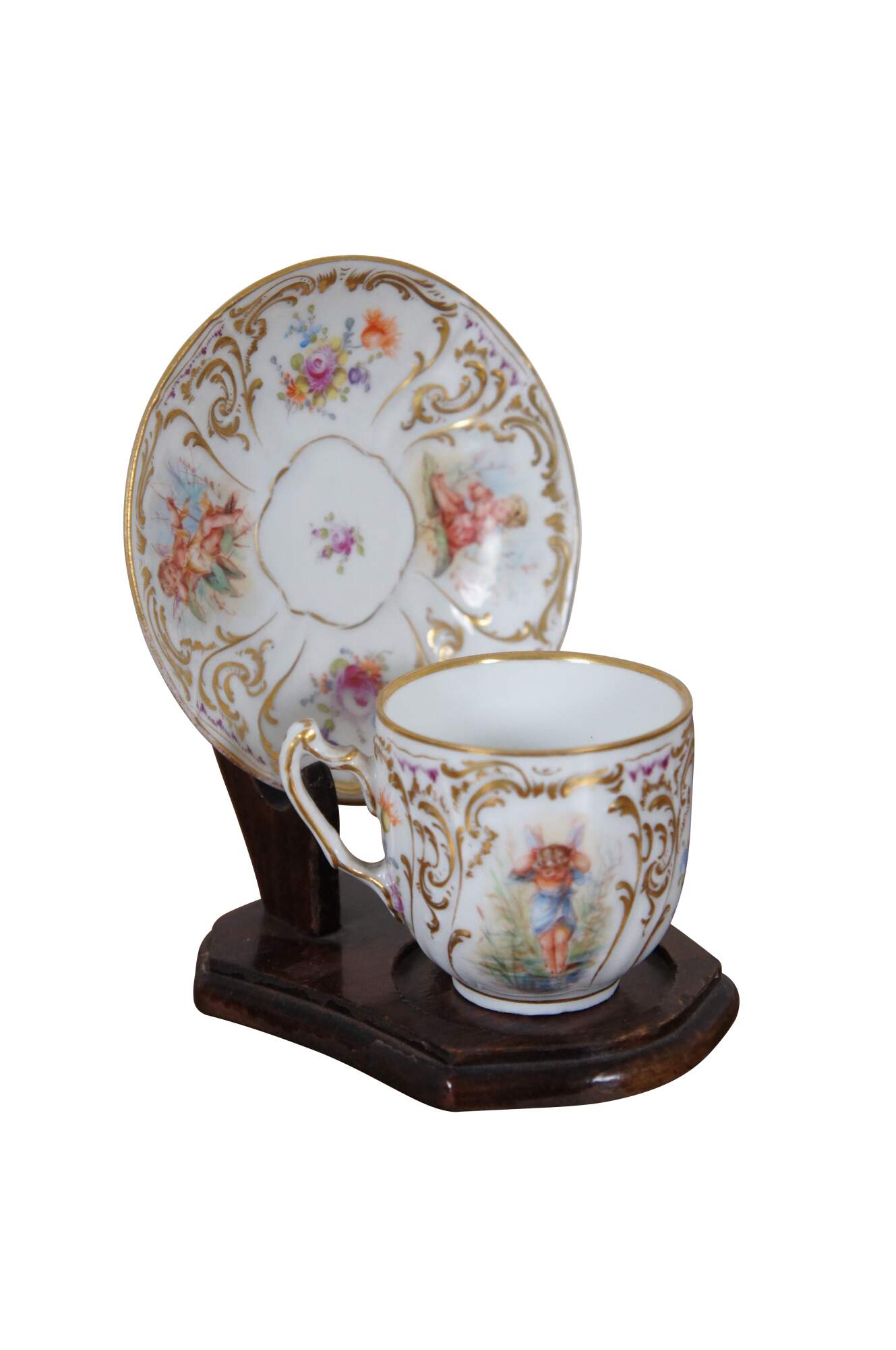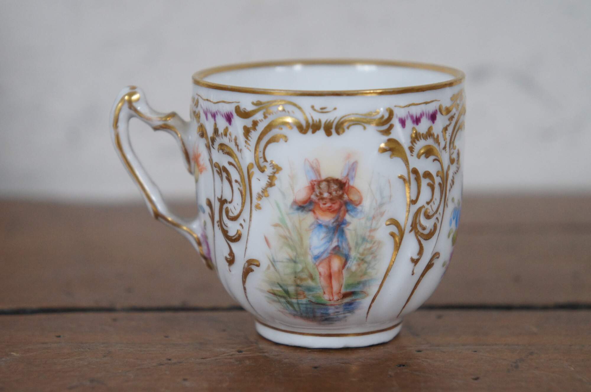 A beautiful Dresden teacup and saucer with blue crown mark. Features a polychrome finish with fairies, flowers and gilding.