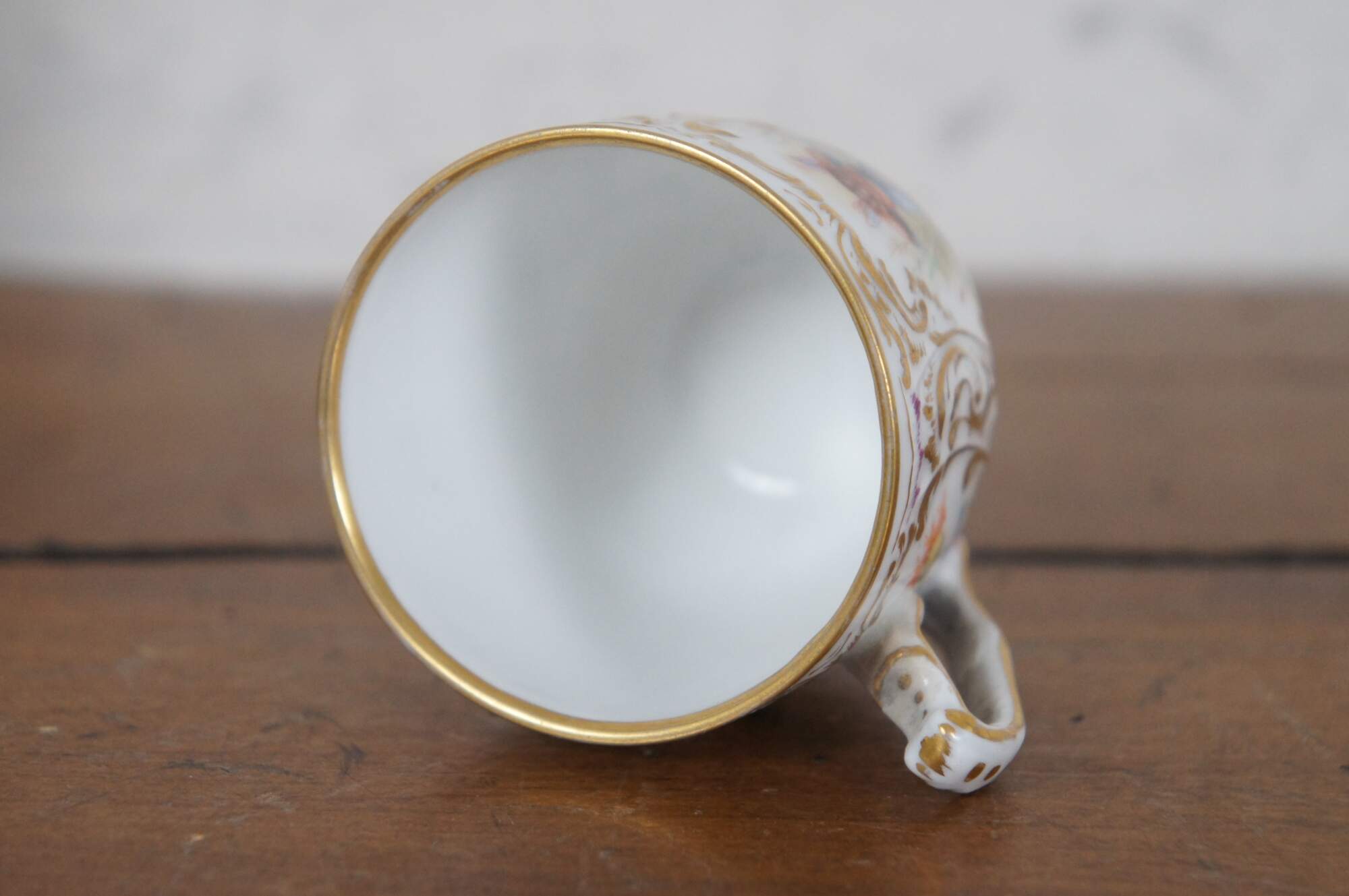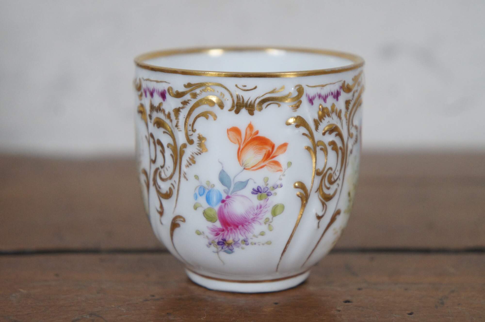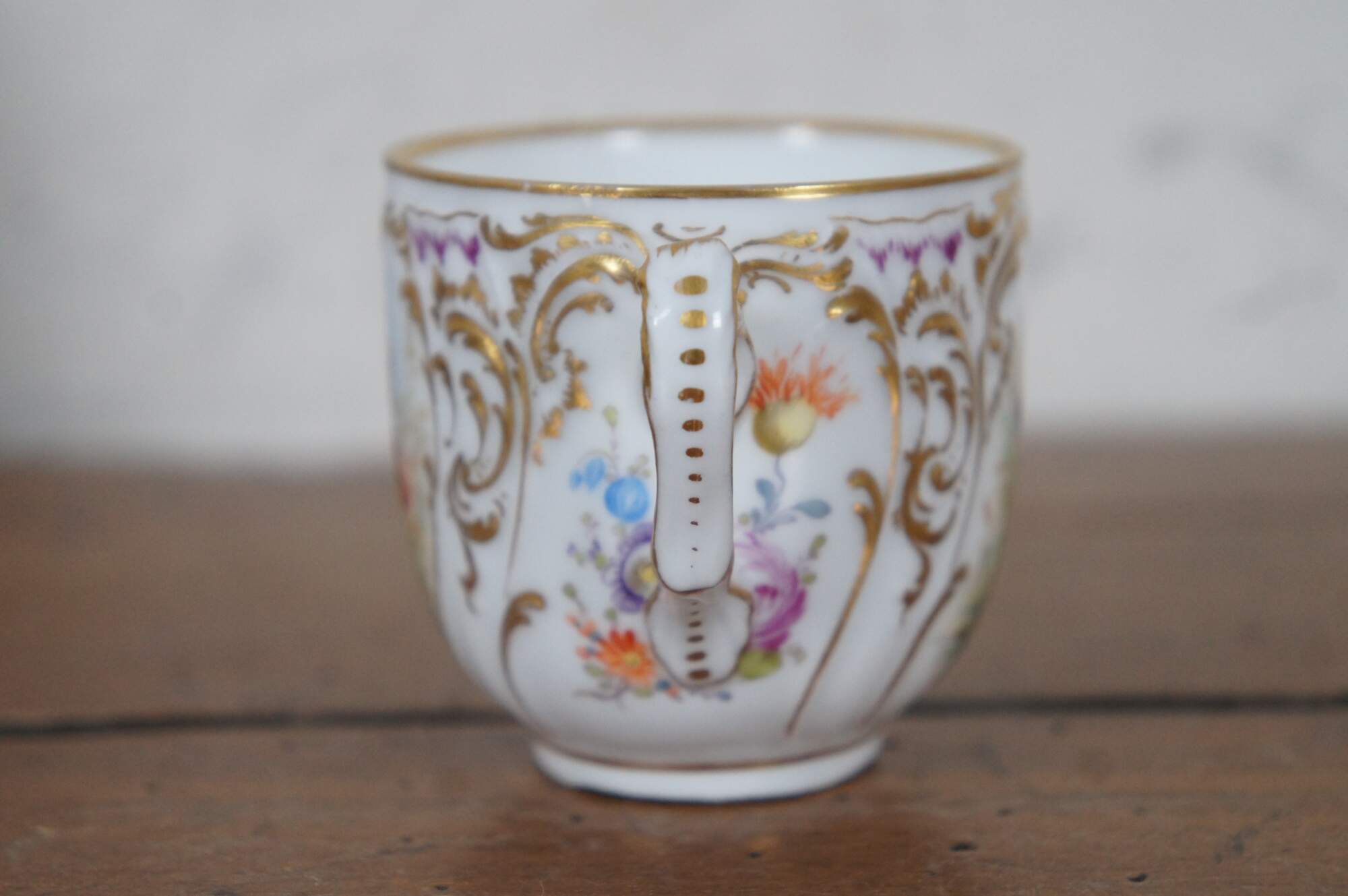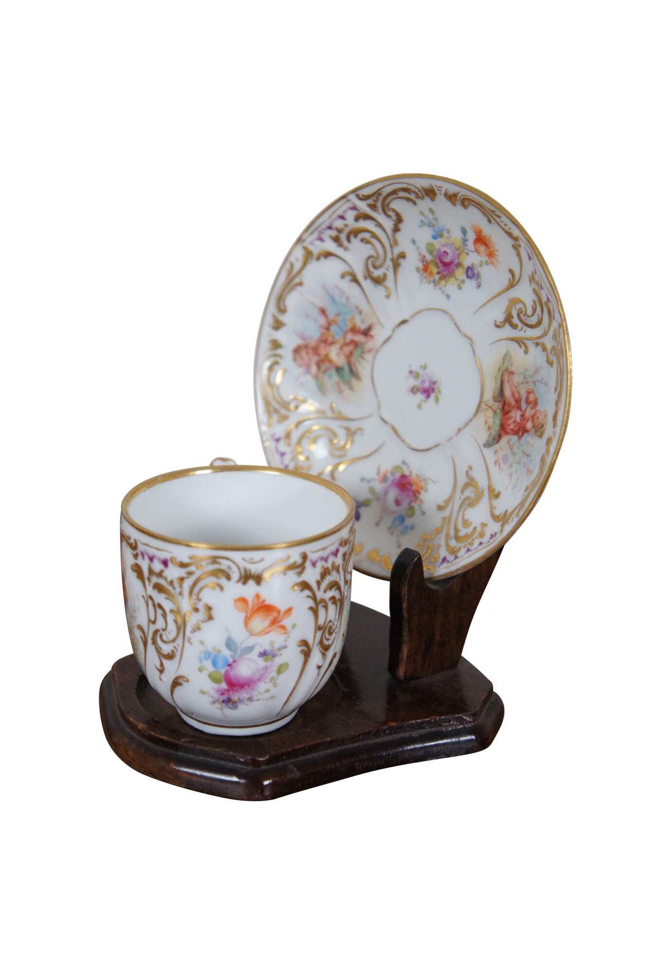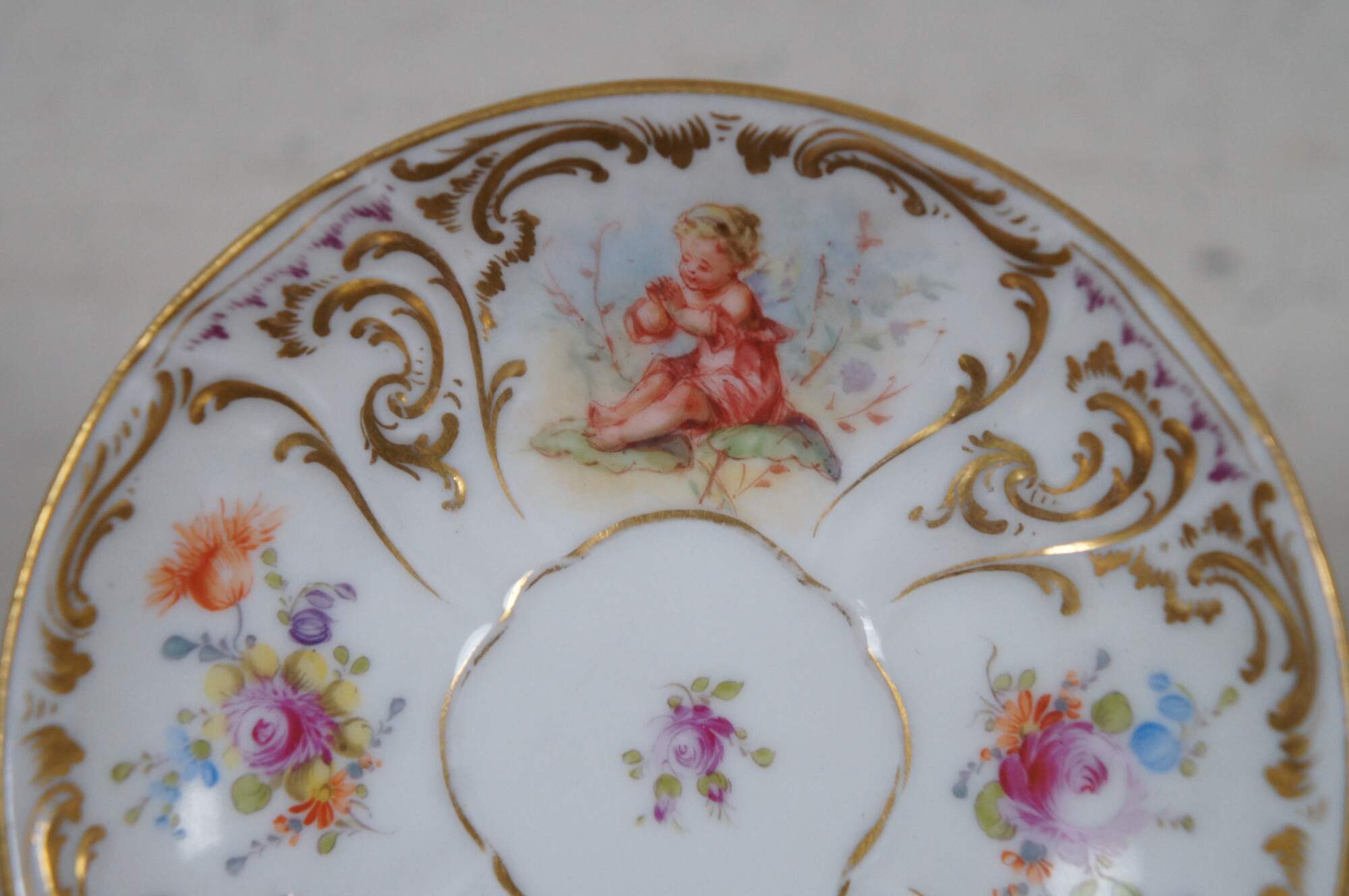 A beautiful Dresden teacup and saucer with blue crown mark. Features a polychrome finish with fairies, flowers and gilding.