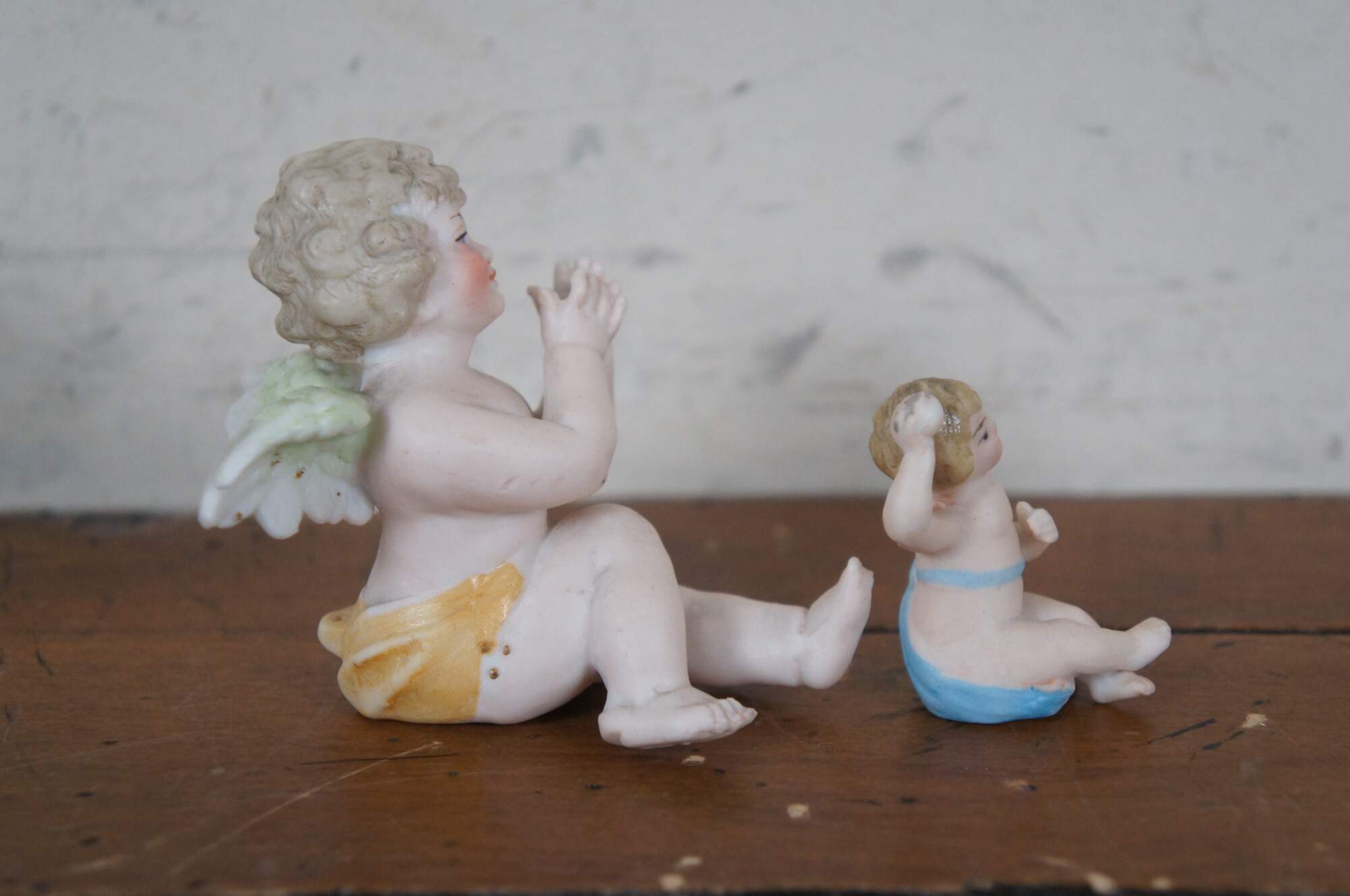 Pair of circa early 20th century un-glazed bisque porcelain cherub / angel figurines with hand painted loin cloths and features. The larger one has green wings accented with gold. The smaller one (missing his wings) is marked 00651 on base.
