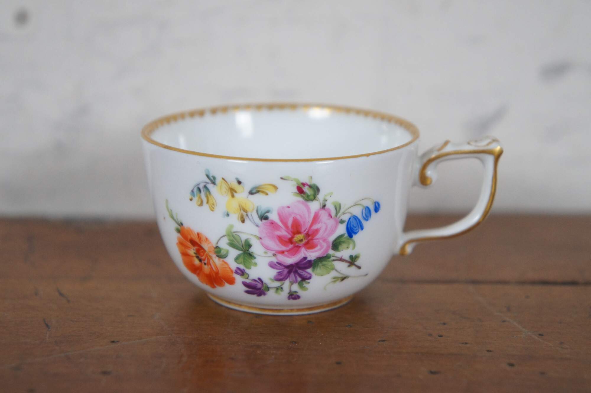 Antique lot includes creamer, demitasse cup, and two bone dishes by Dresden, one demitasse cup by Meissen, and one candlestick by Klemm.