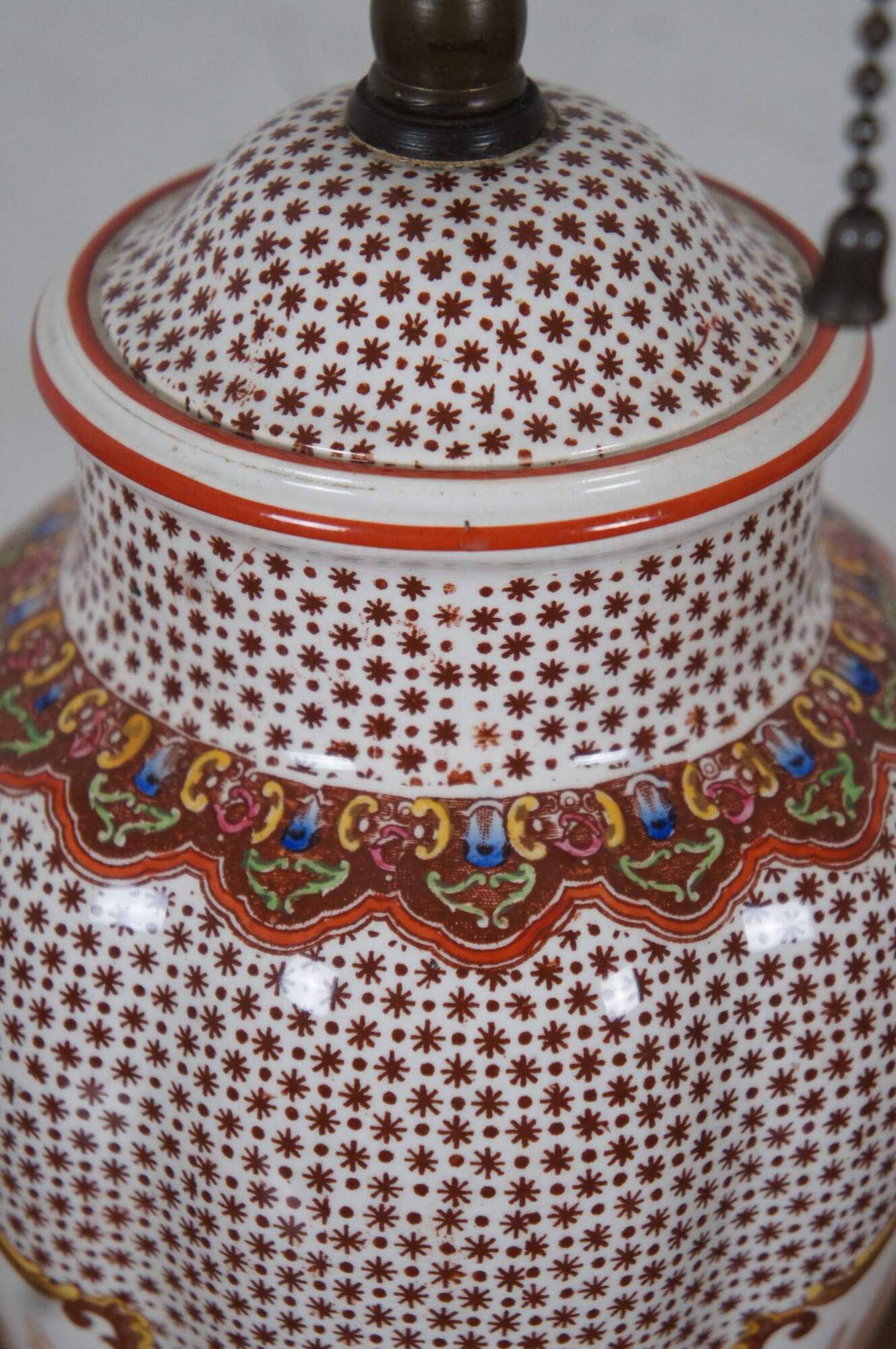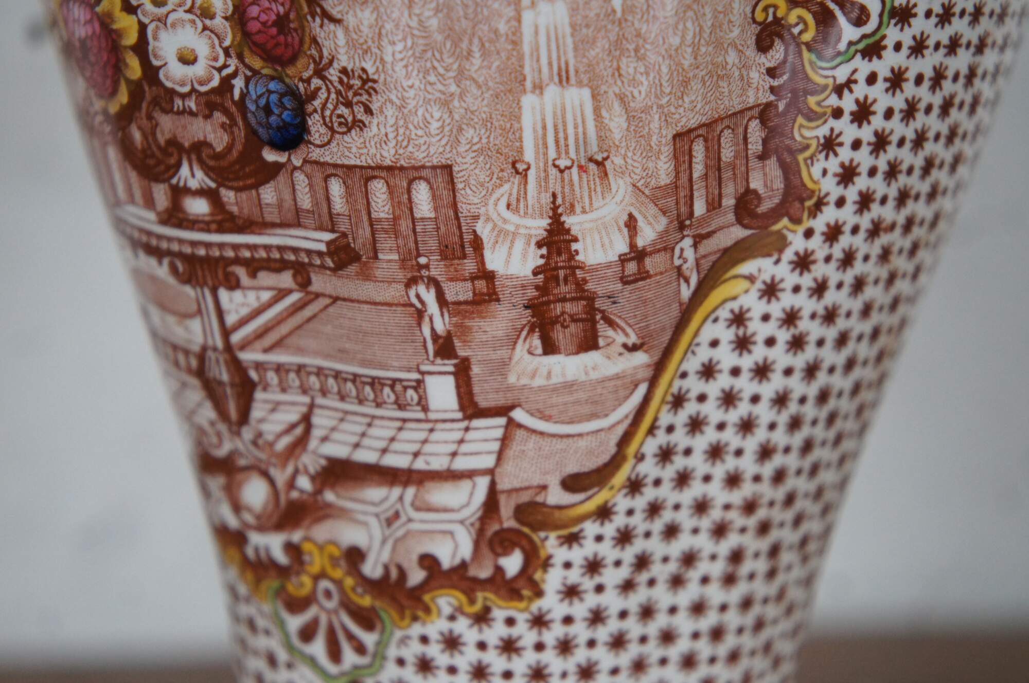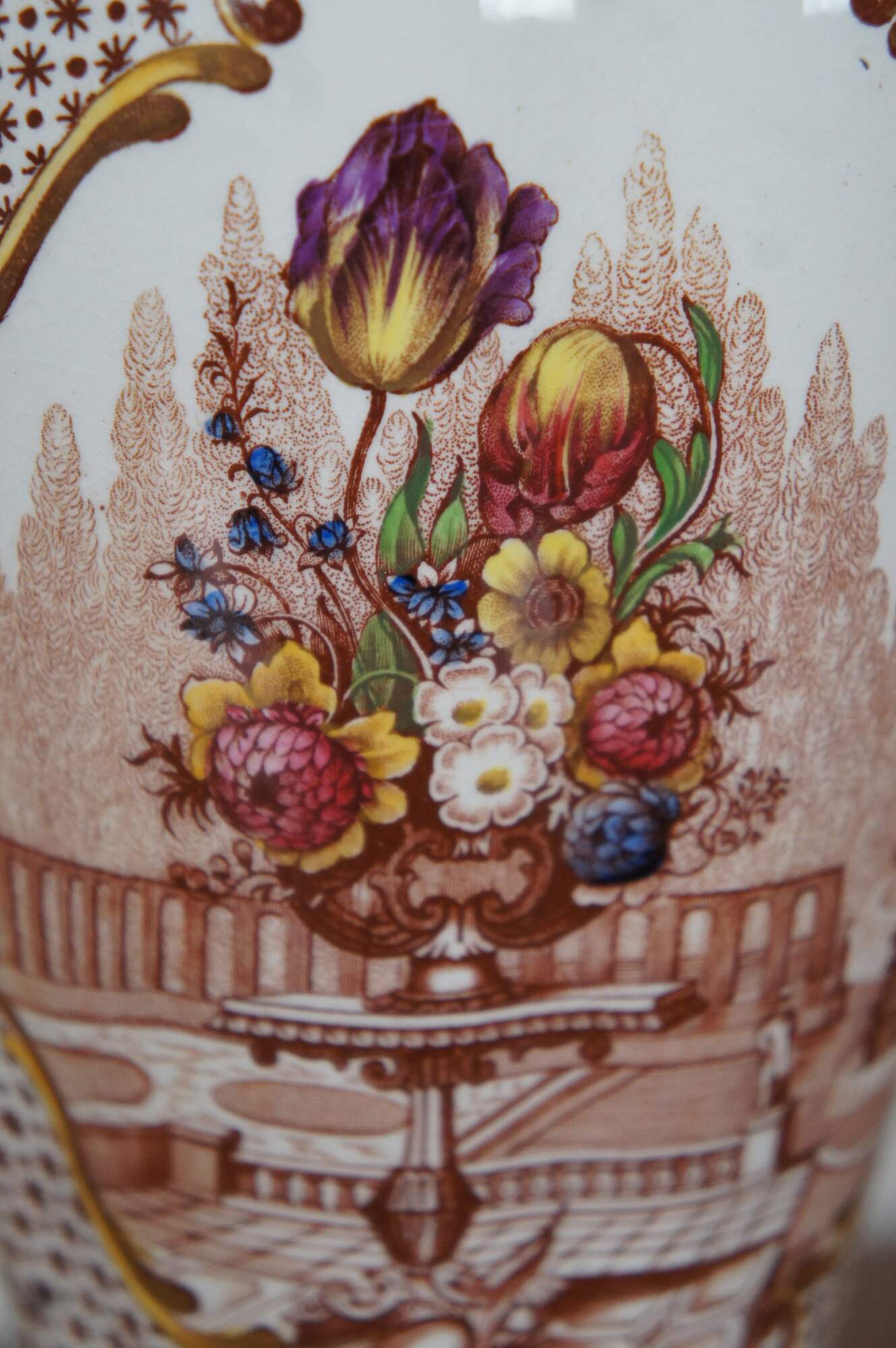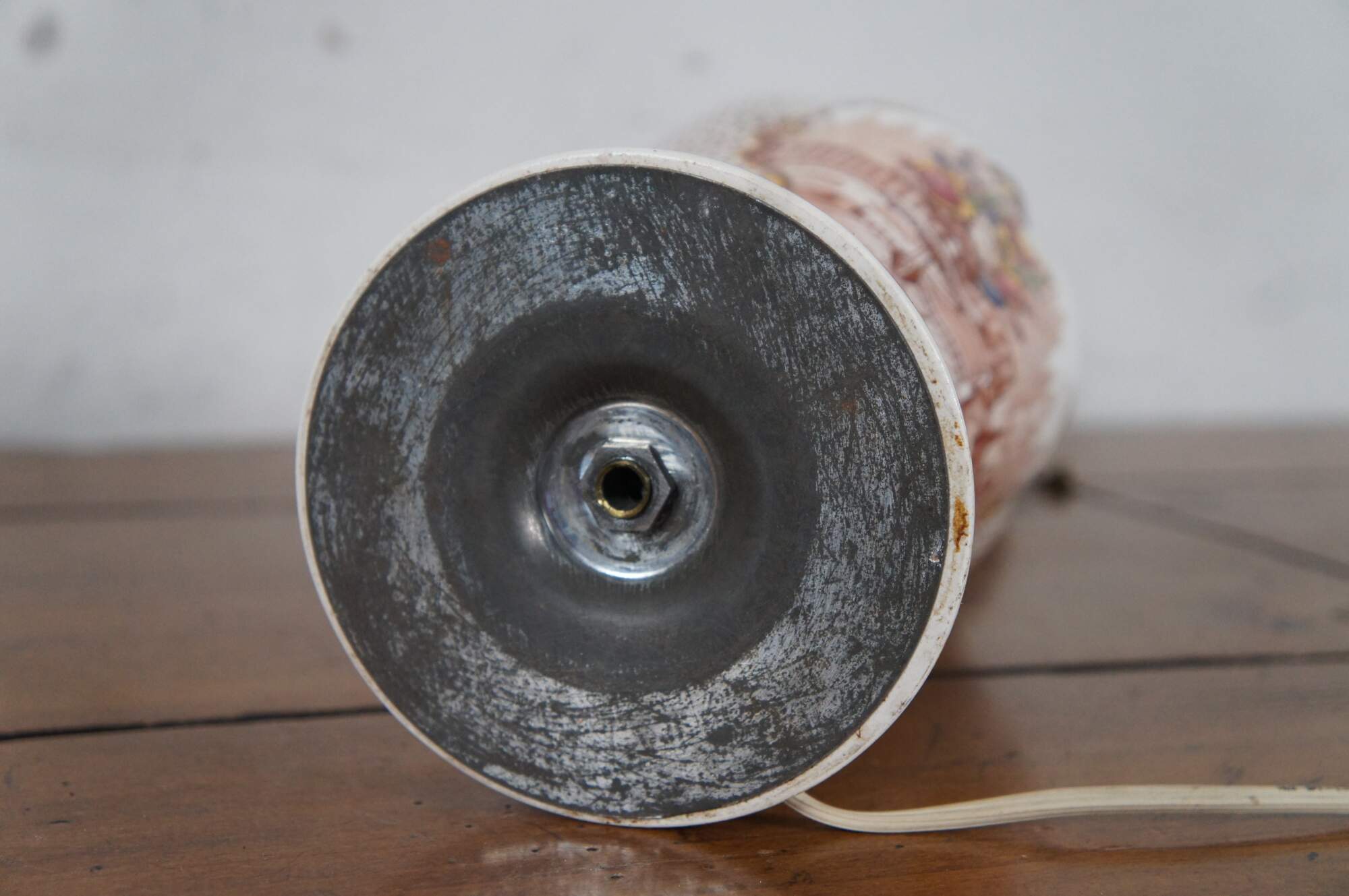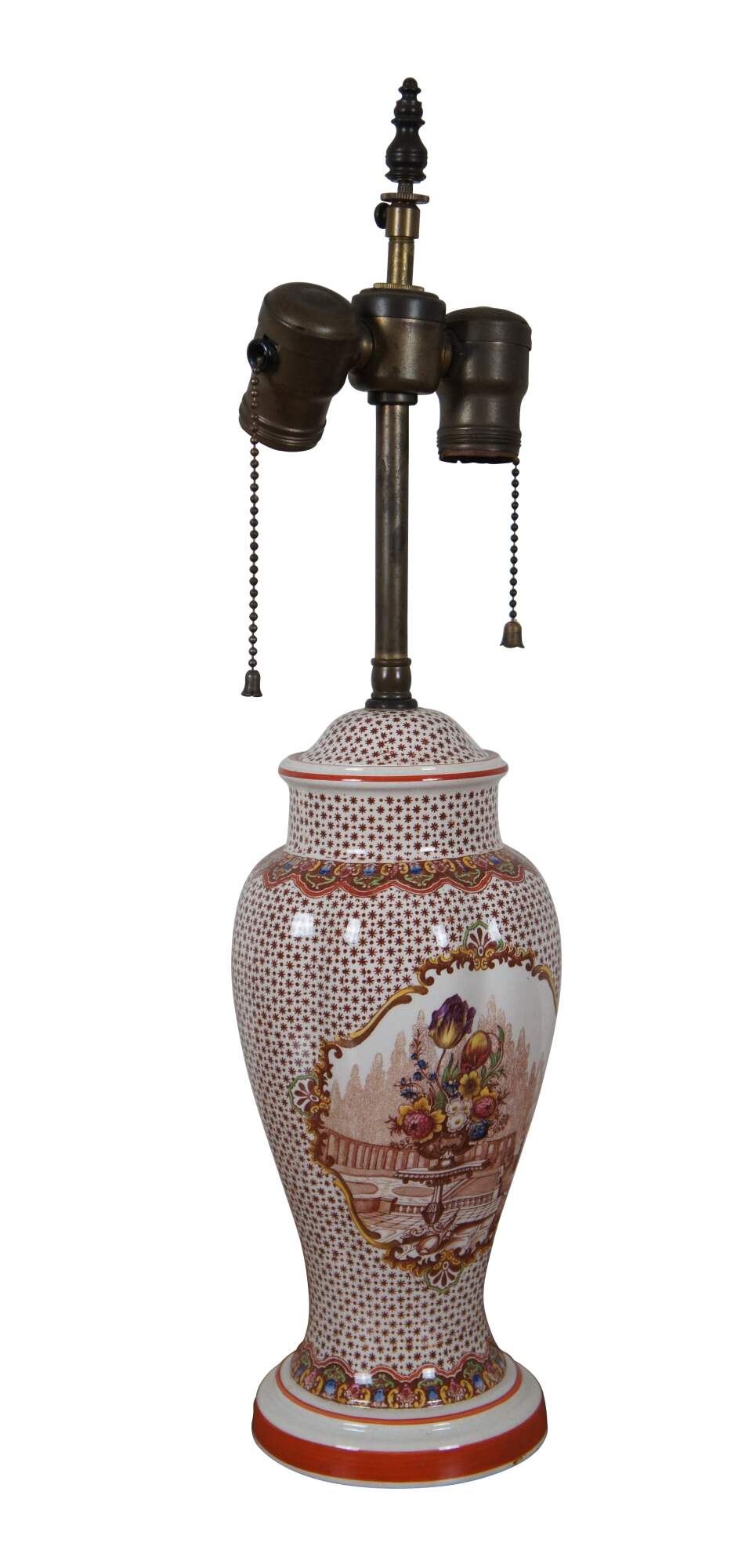 Vintage porcelain transferware two light table lamp featuring a ginger jar or mantel urn with still life landscape scene of a table with a colorful bouquet of flowers at the center of a magnificent garden.