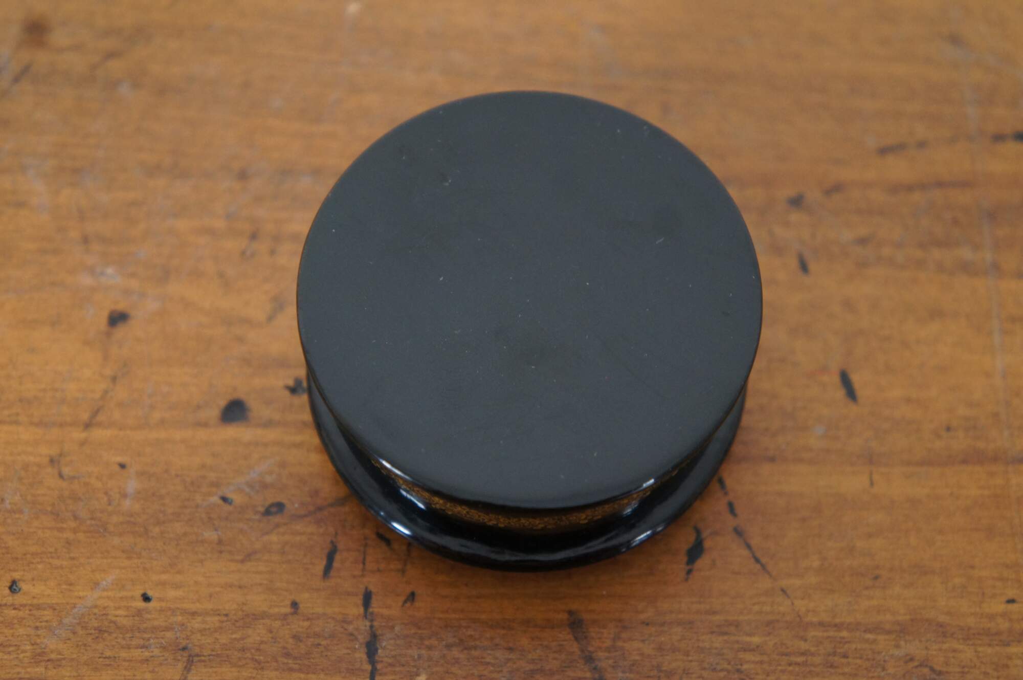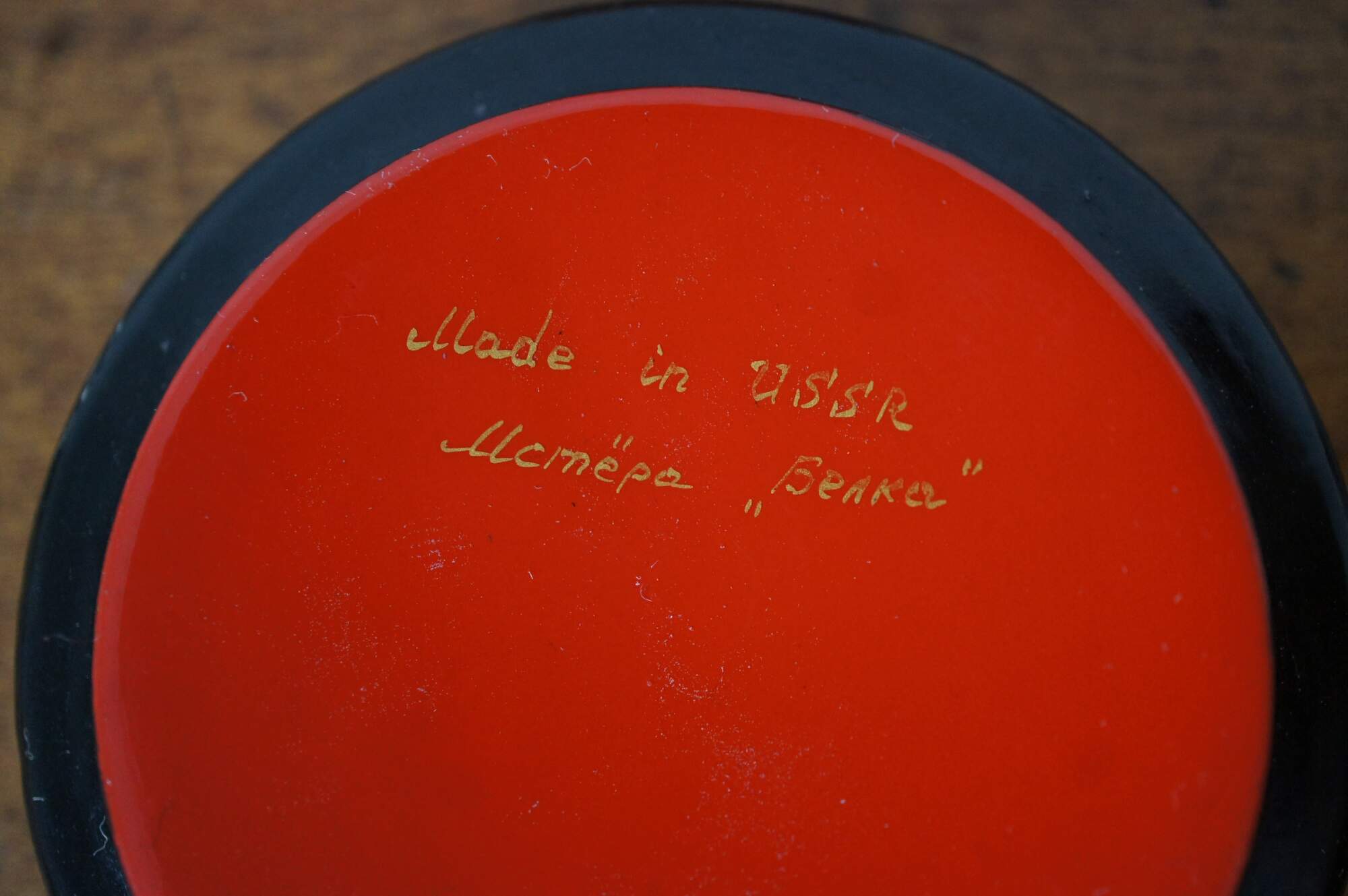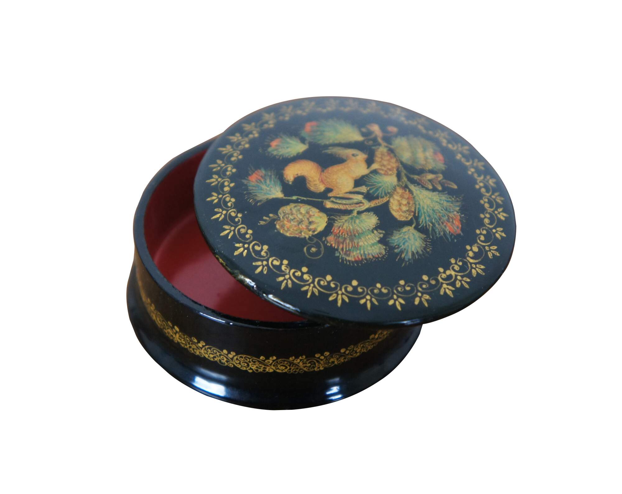 Vintage USSR Russian folklore / fairy tale keepake trinket box featuring round form with a Christmas theme magic squirrel motif.