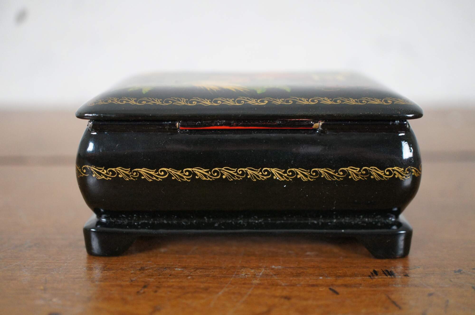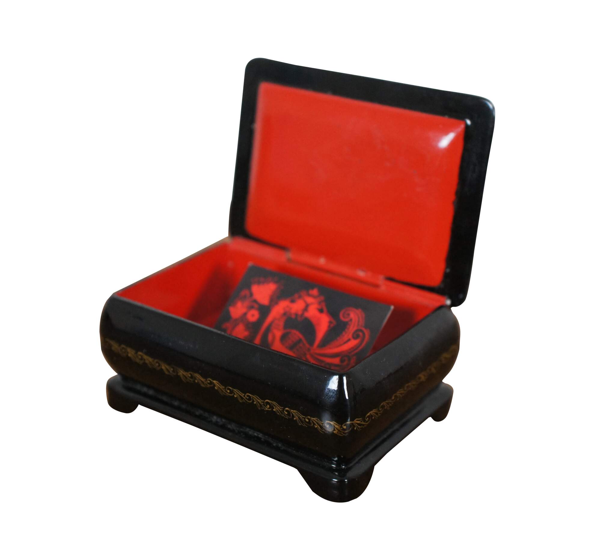 Vintage USSR Russian Firebird folklore / fairy tale keepake trinket box featuring red interior with hinged lid and landscape scene of a man with firebird and castle.