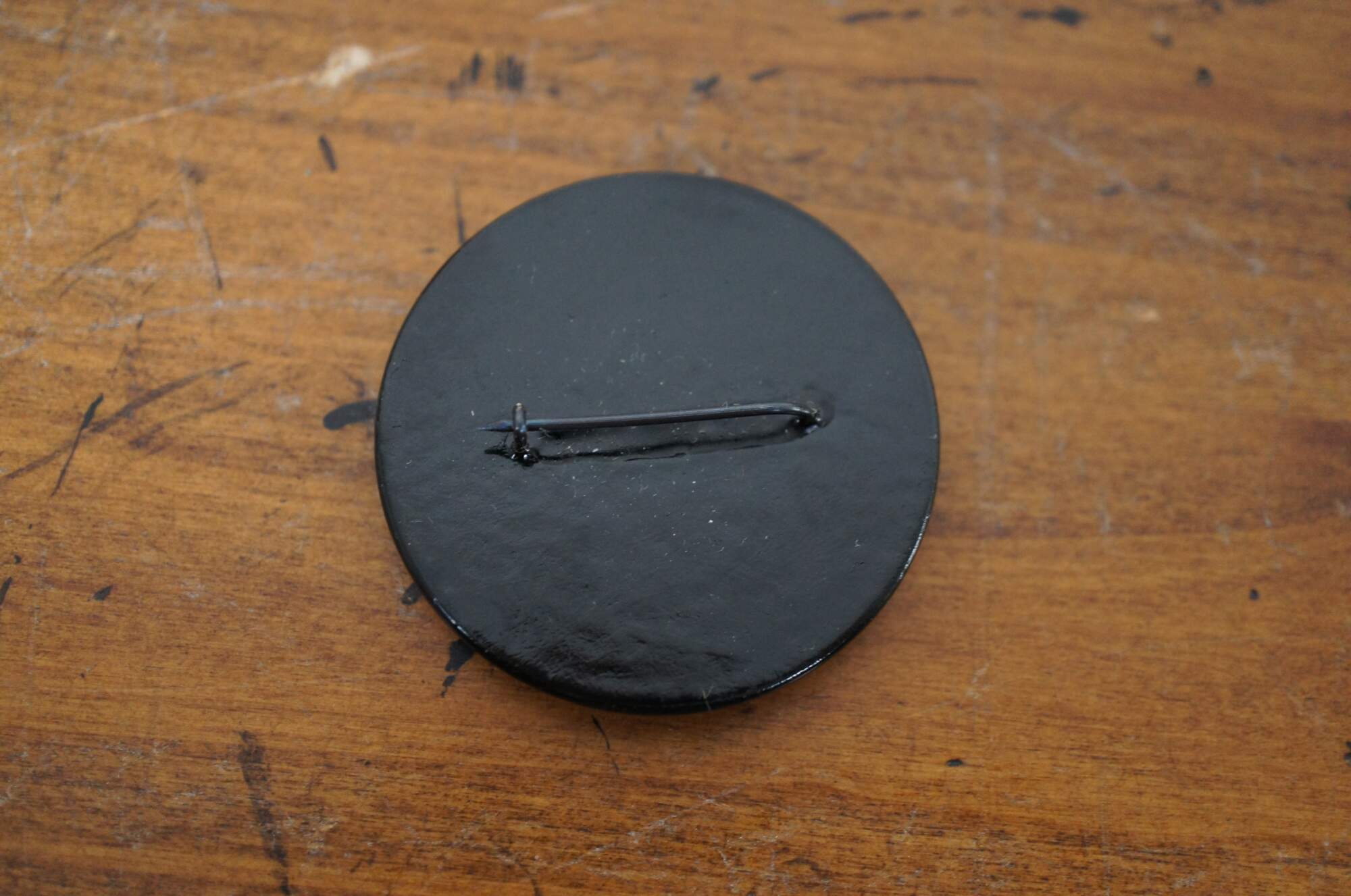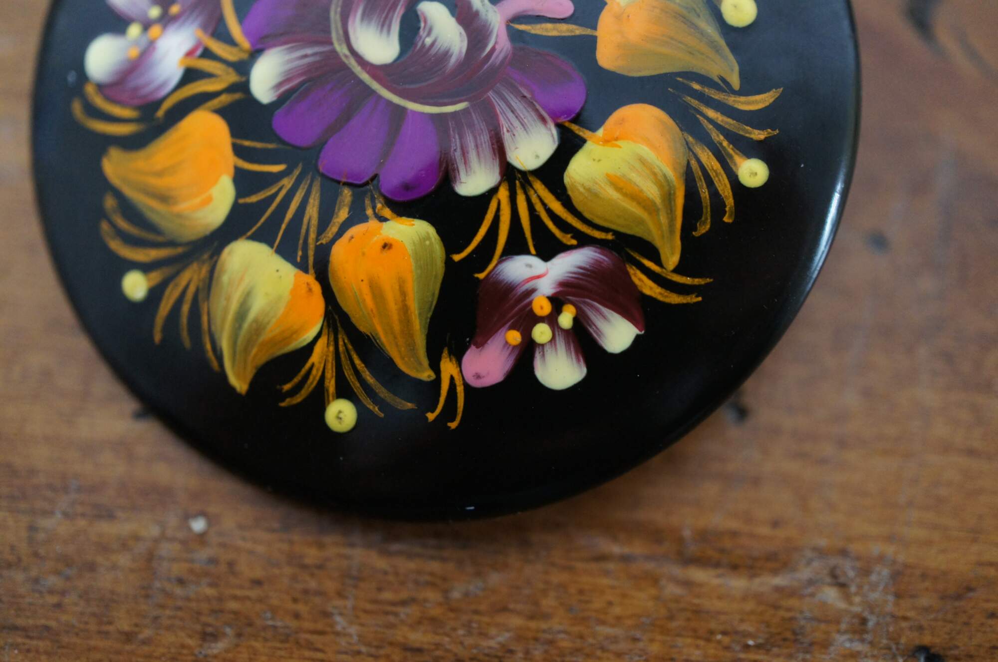 Mid to late 20th century Russian black lacquer pin / brooch, featuring a hand painted folk art motif of purple flowers and orange leaves. Round shape, no signature. Includes orignal tag.