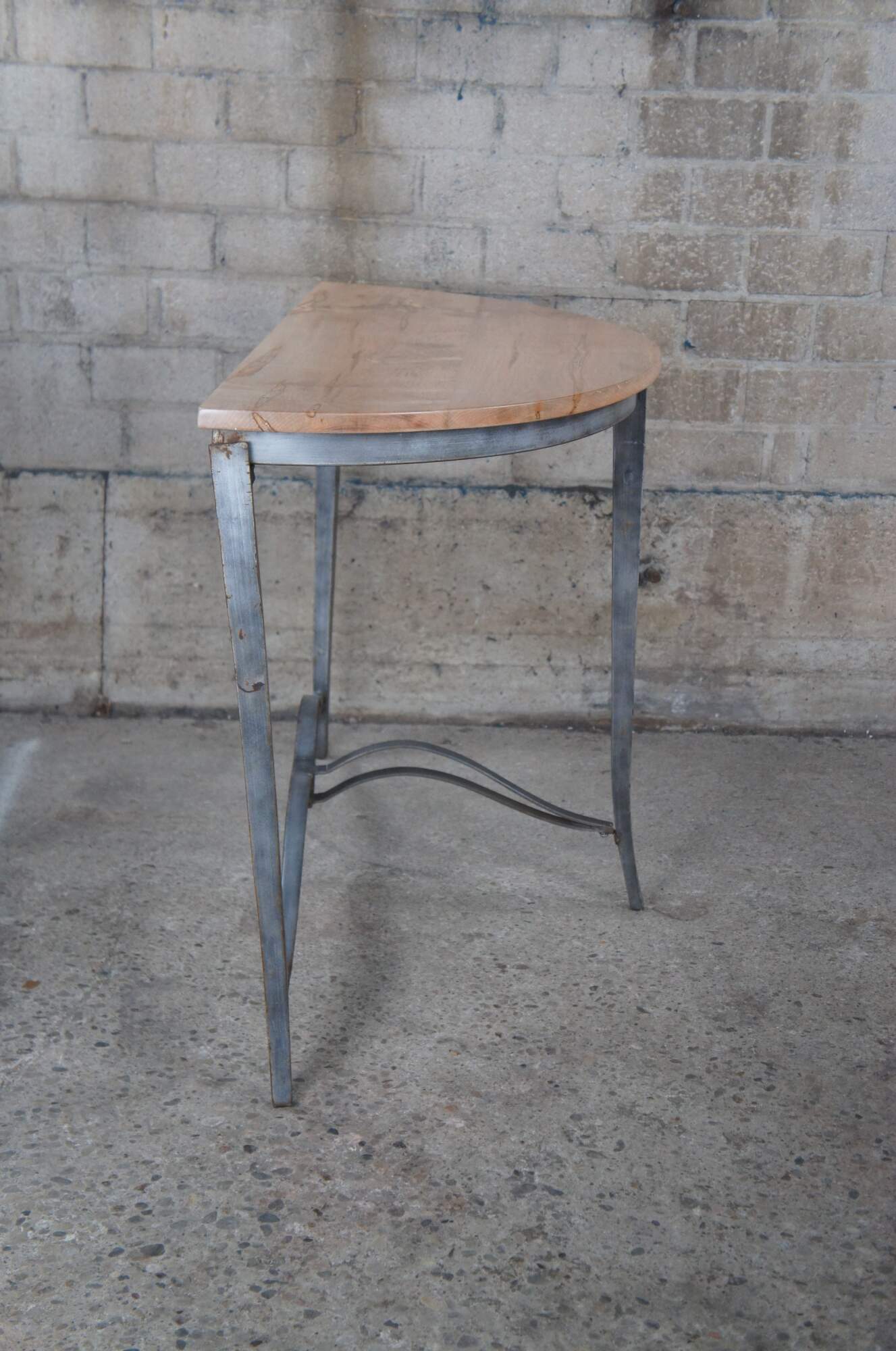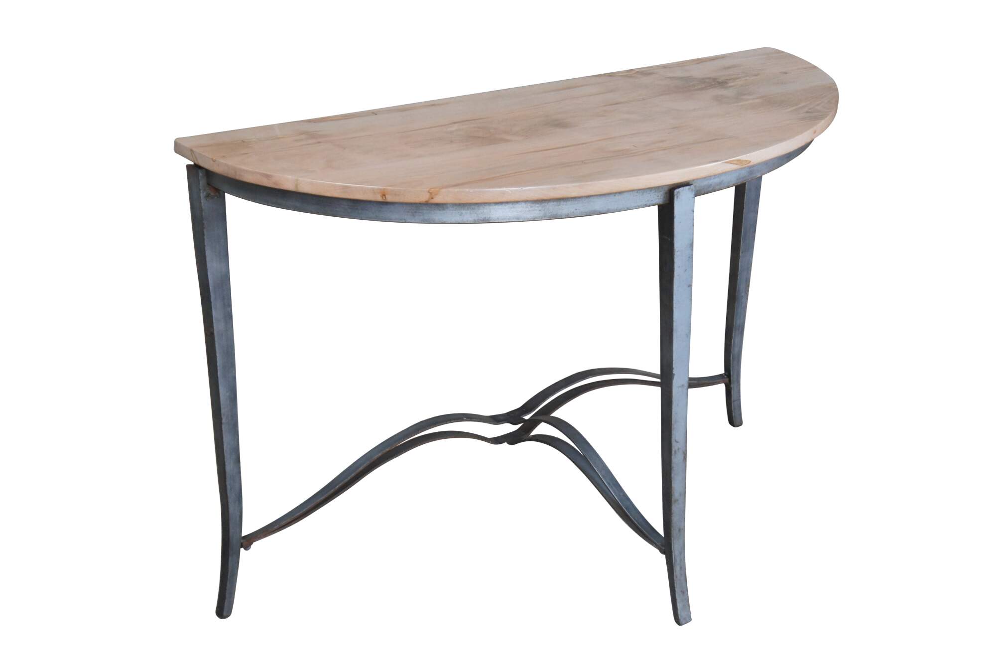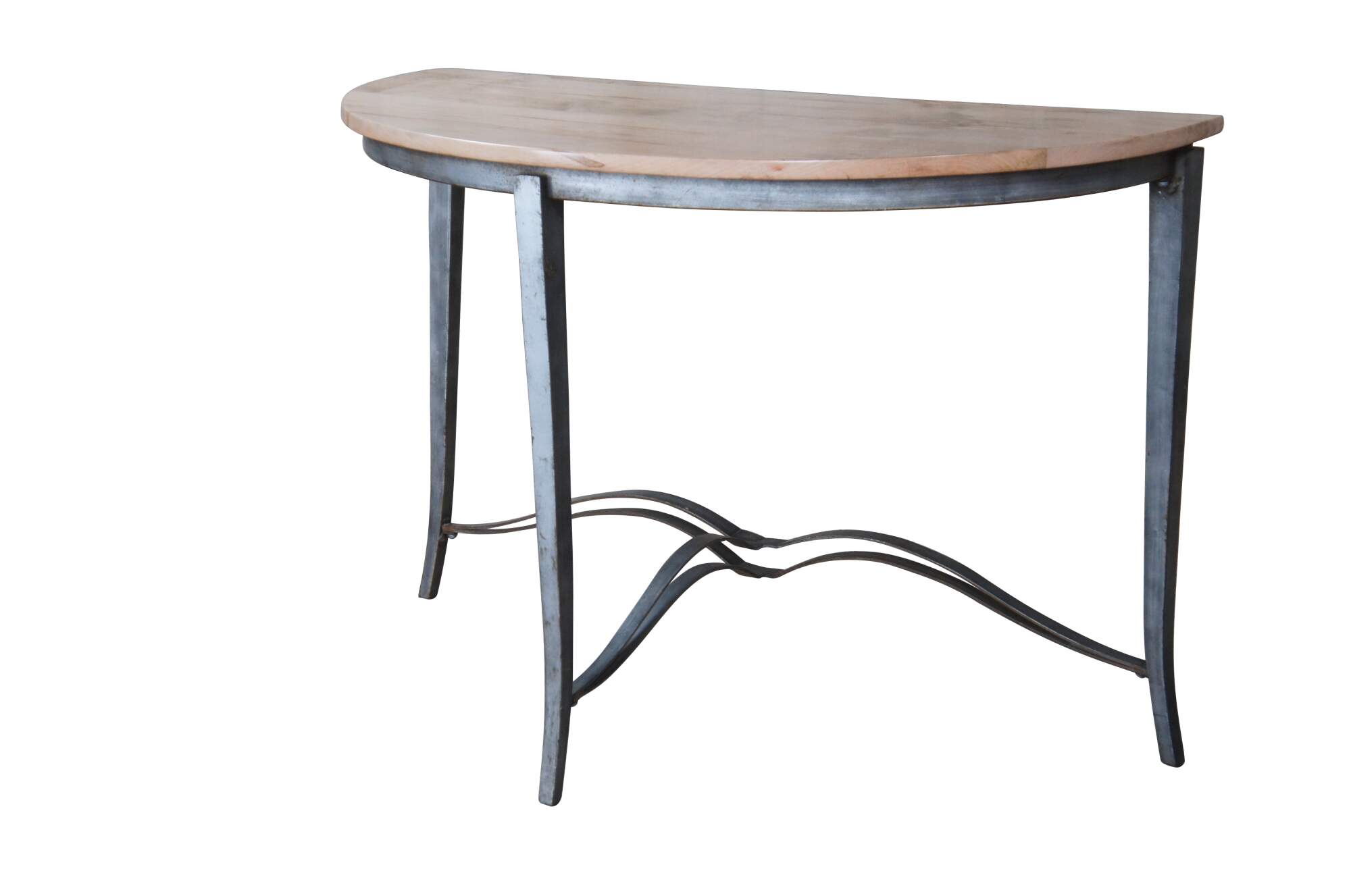 Half Moon maple console table with industrial reclaimed iron base, circa second half 20th century. Features tapered legs connected by a serpentine support. Greeat for in an entry hall or living space.
