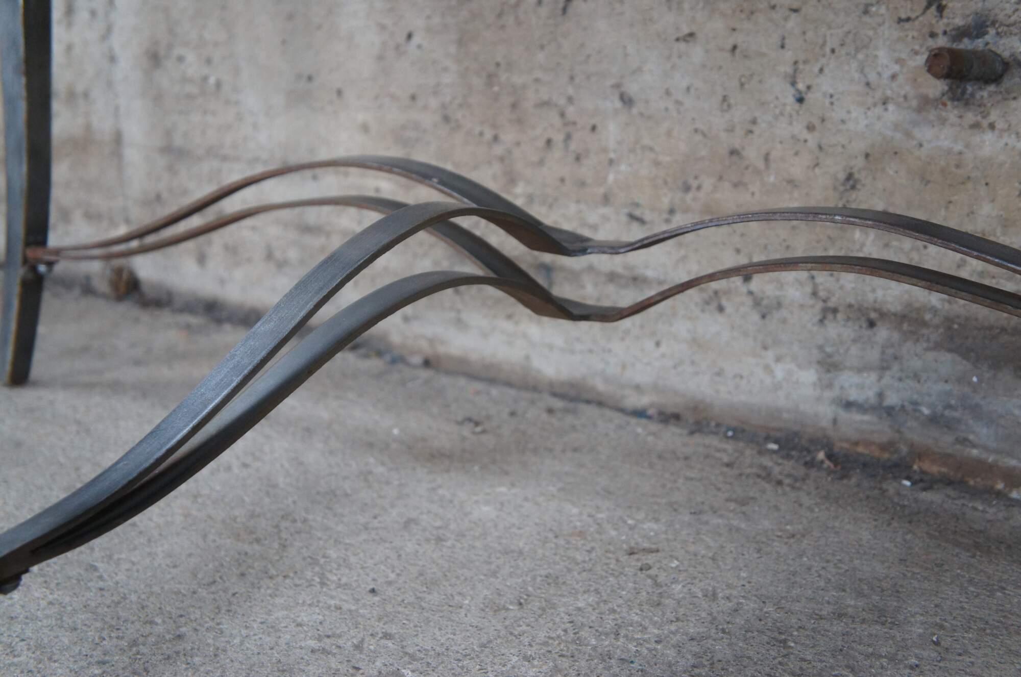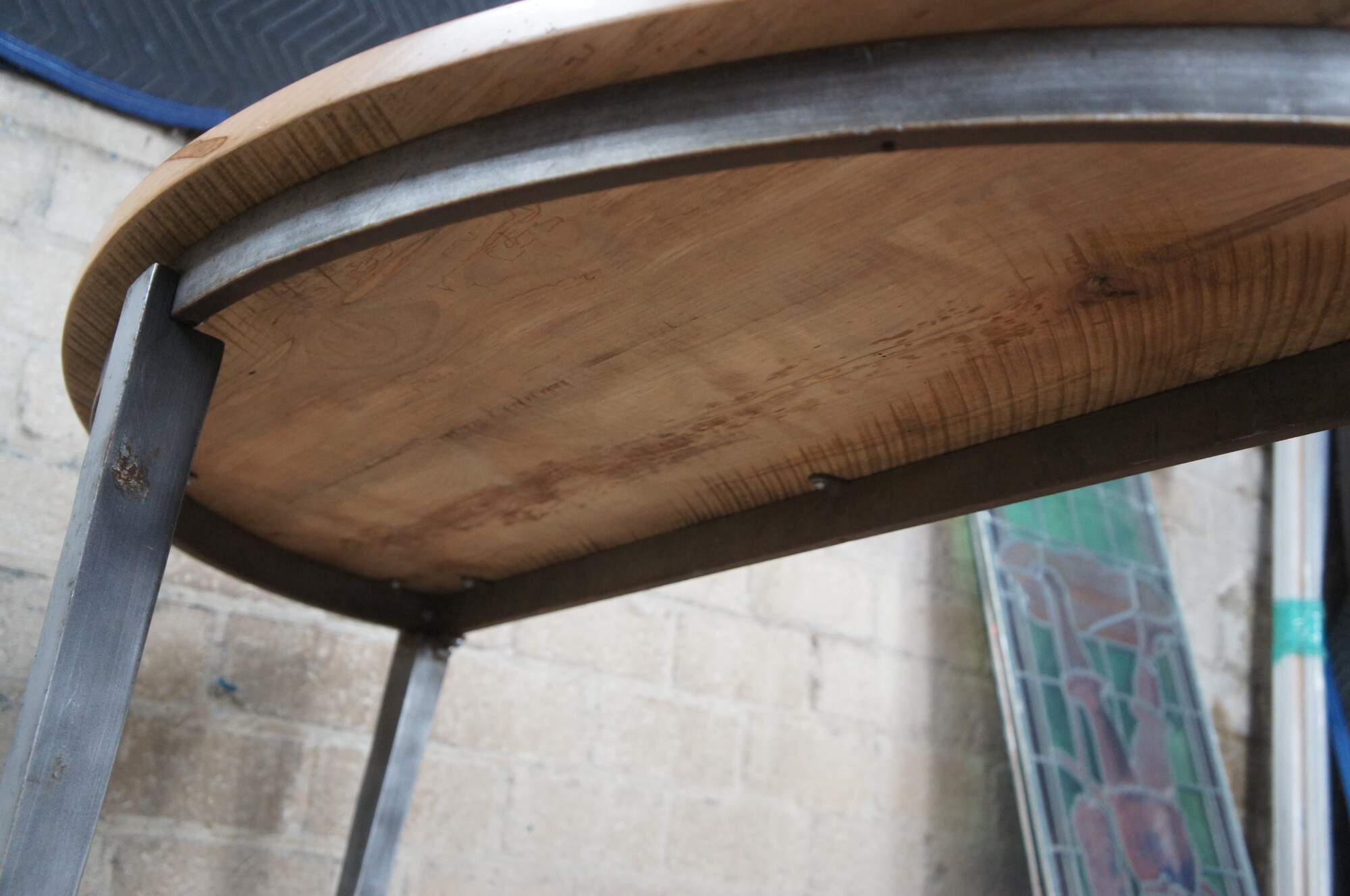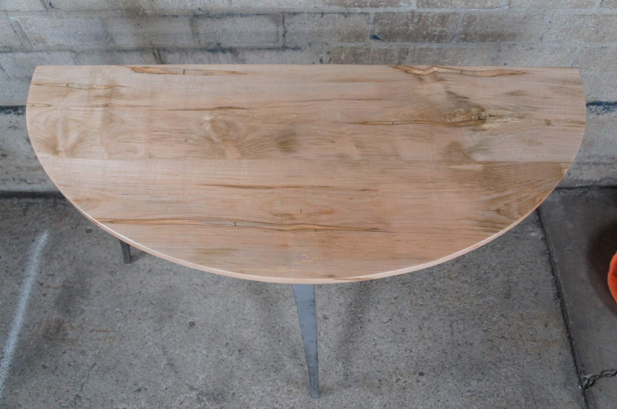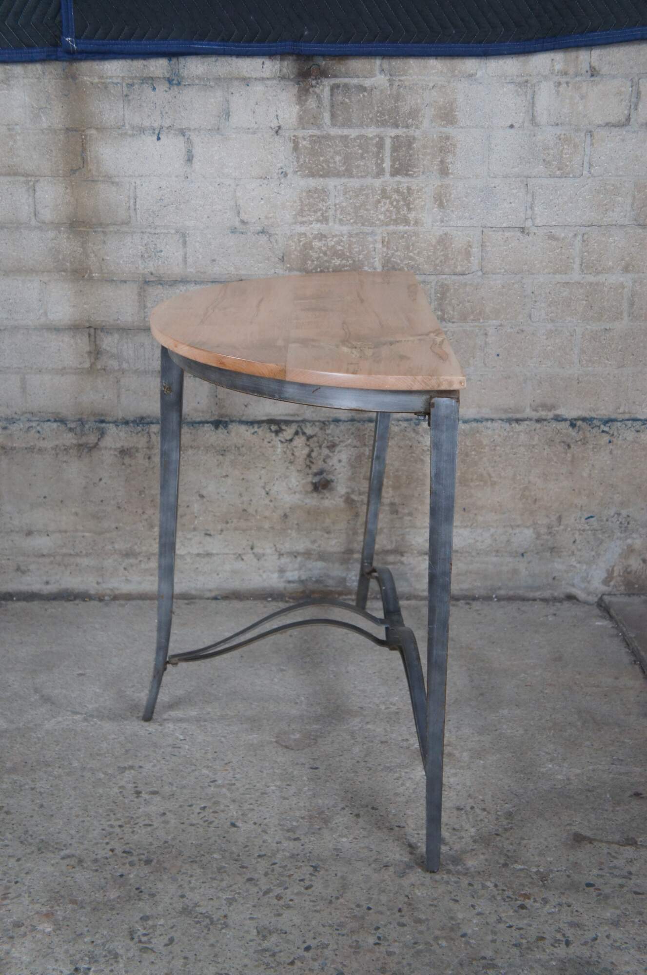 Half Moon maple console table with industrial reclaimed iron base, circa second half 20th century. Features tapered legs connected by a serpentine support. Greeat for in an entry hall or living space.