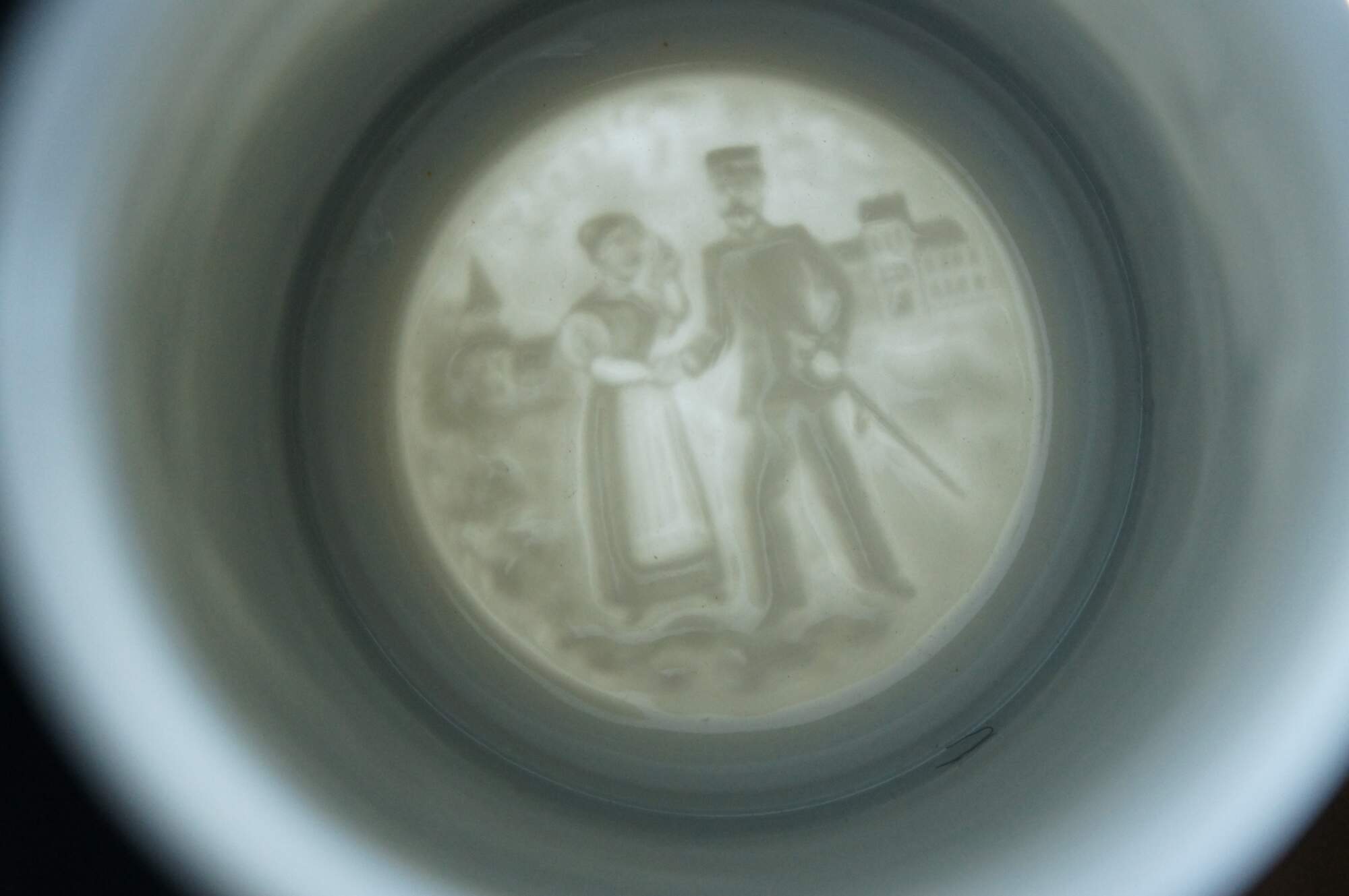 Both feature a lithopane in the base showing a soldier and a young woman hand in hand with buildings in the background. One signed 6/83 Europe/Luzern, Dr. Wm. A. Miller. One simply marked Made in Germany.
