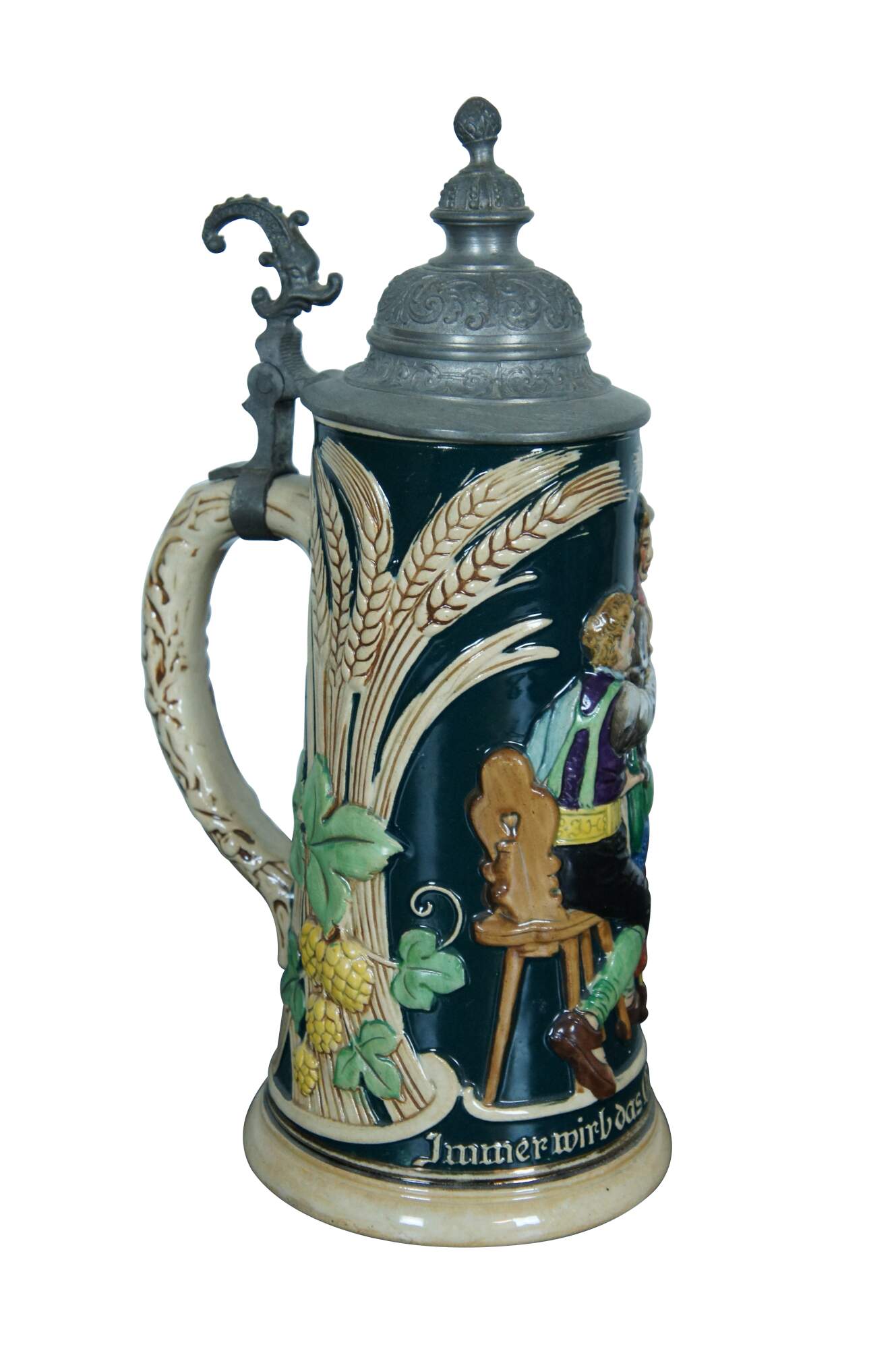 Vintage Gesetzlich Geschutzt beer stein made from ceramic with a lowe relief scene of a couple at the center surrounded by barley. The bottom reads something about being Luck. Marked 1824 26 on base.