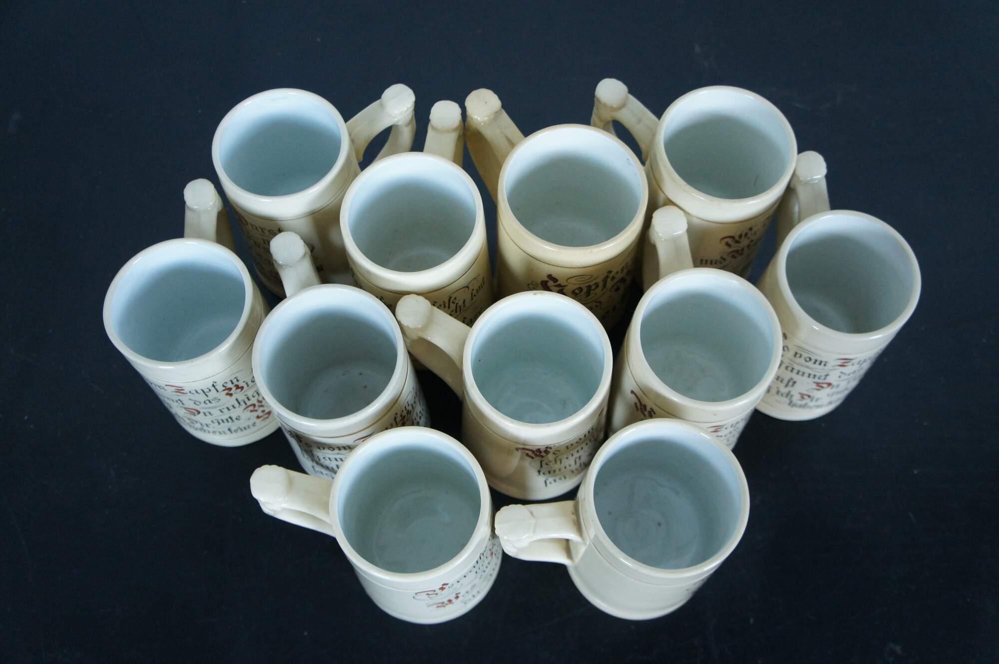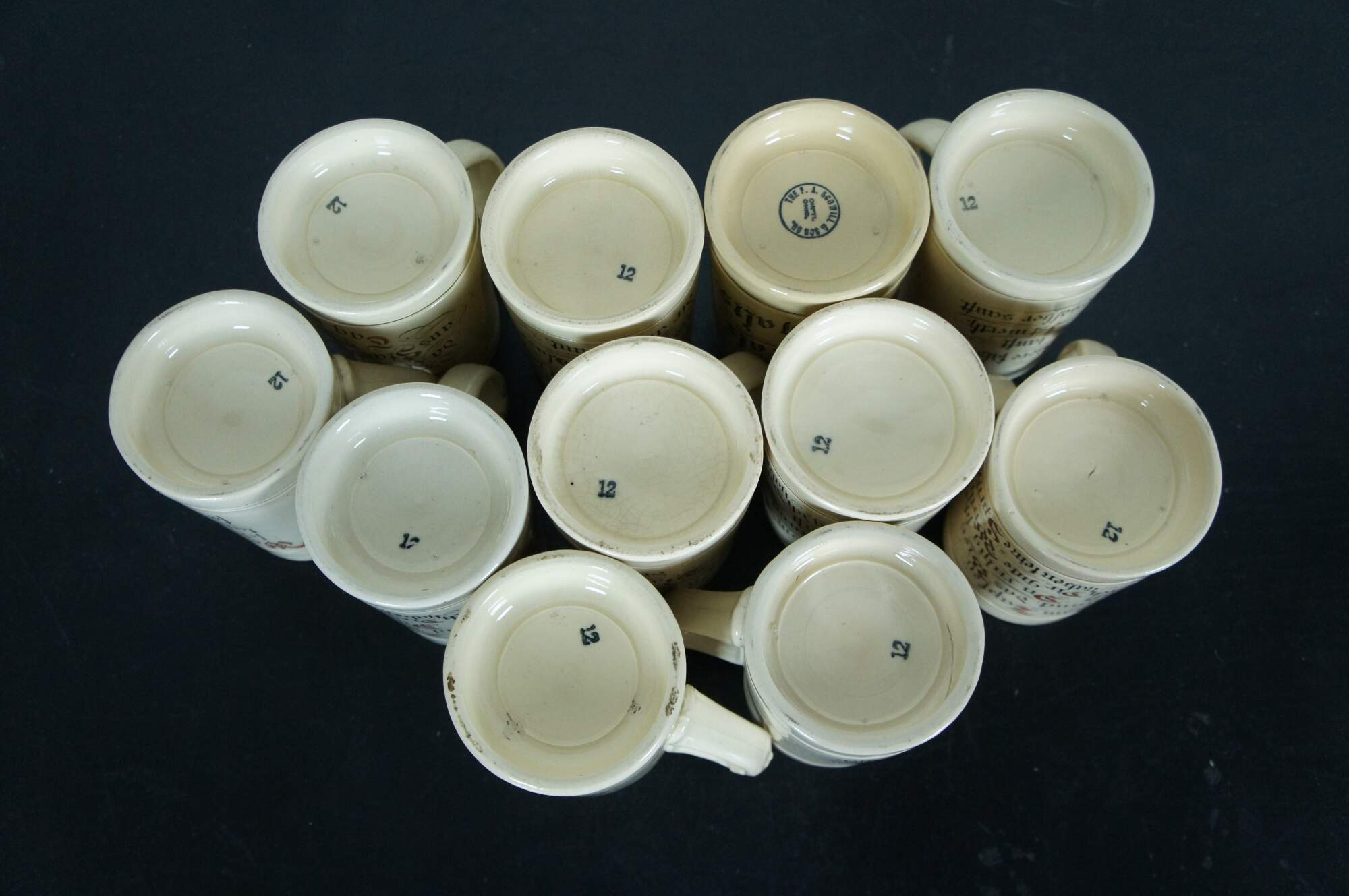 Antique set of eleven 19th century German earthenware steins / beer mugs / tankards with applied mask handle, distributed as a promotional advertising / sales incentive by F.A. Schwill & Company of Cincinnati, Ohio. Likely produced by the Hugo Thuemler Maufacturing Co - Representation of Gambrinus on the top of the handle on these steins has been seen on others produced by Thuemler. Gambrinus is a legendary European culture hero celebrated as an icon of beer, brewing, joviality, and joie de vivre. Typical representations in the visual arts depict him as a rotund, bearded duke or king, holding a tankard or mug, and sometimes with a keg nearby.