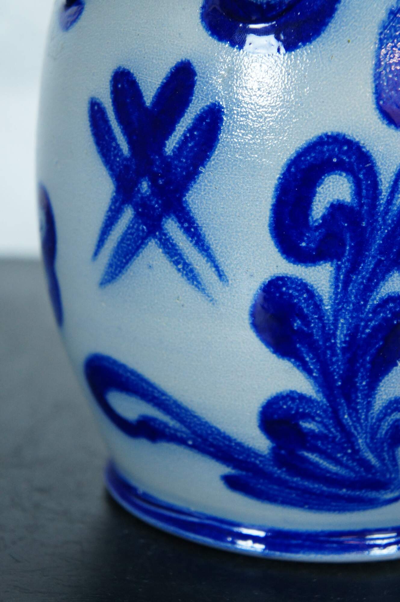 Antique German Westerwald cobalt blue salt glaze stoneware pottery rumtopf jar / crock / tureen with lid. Features a cobalt blue floral theme.