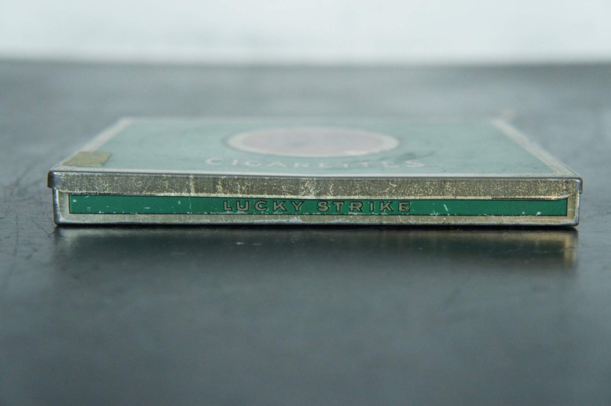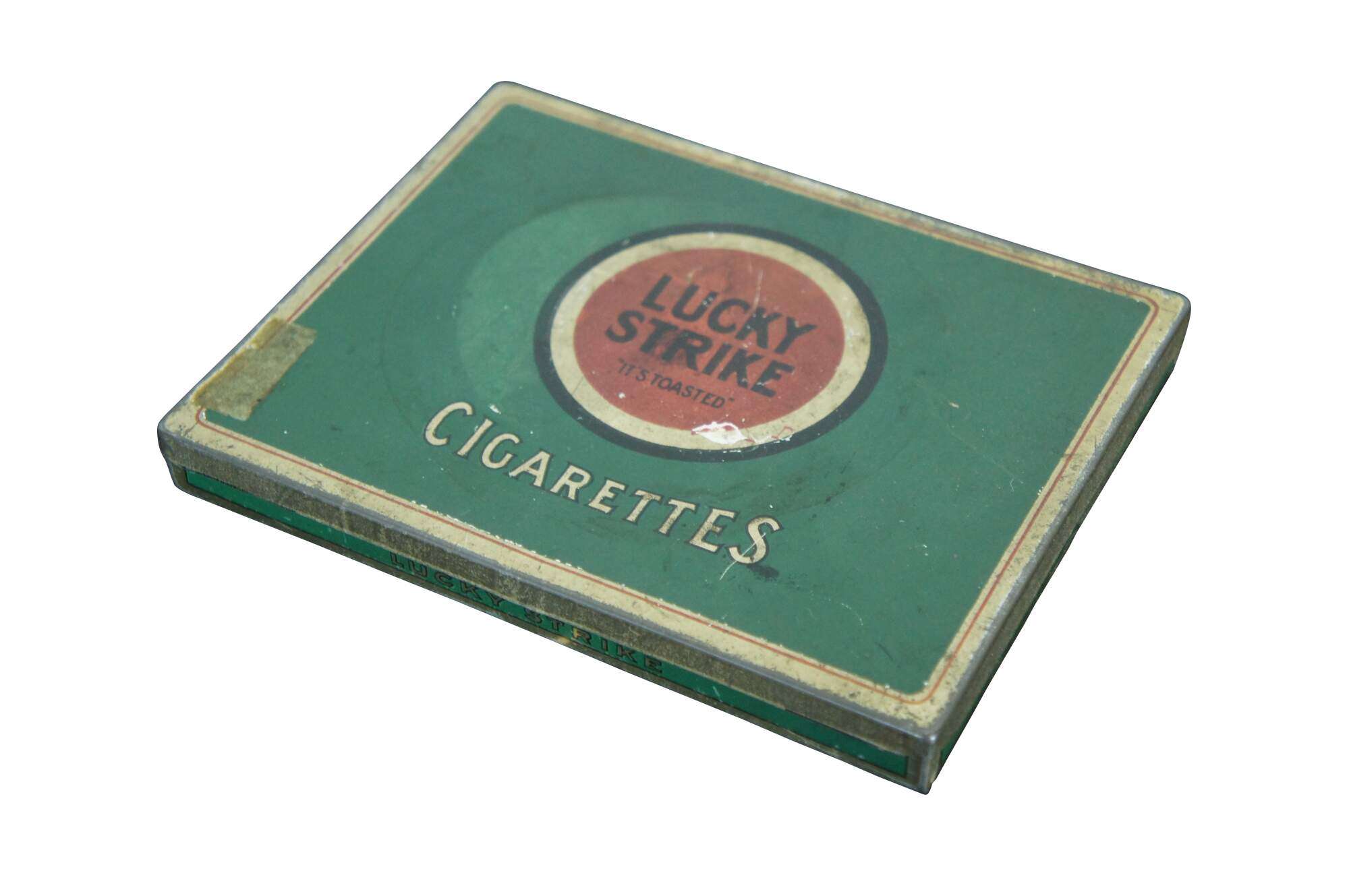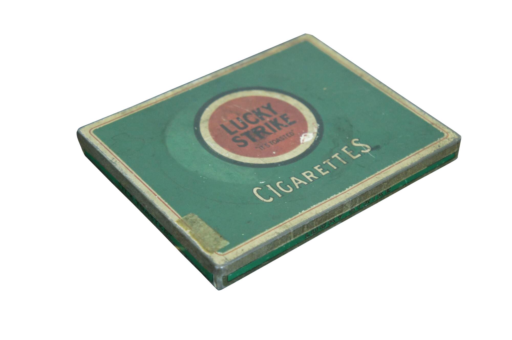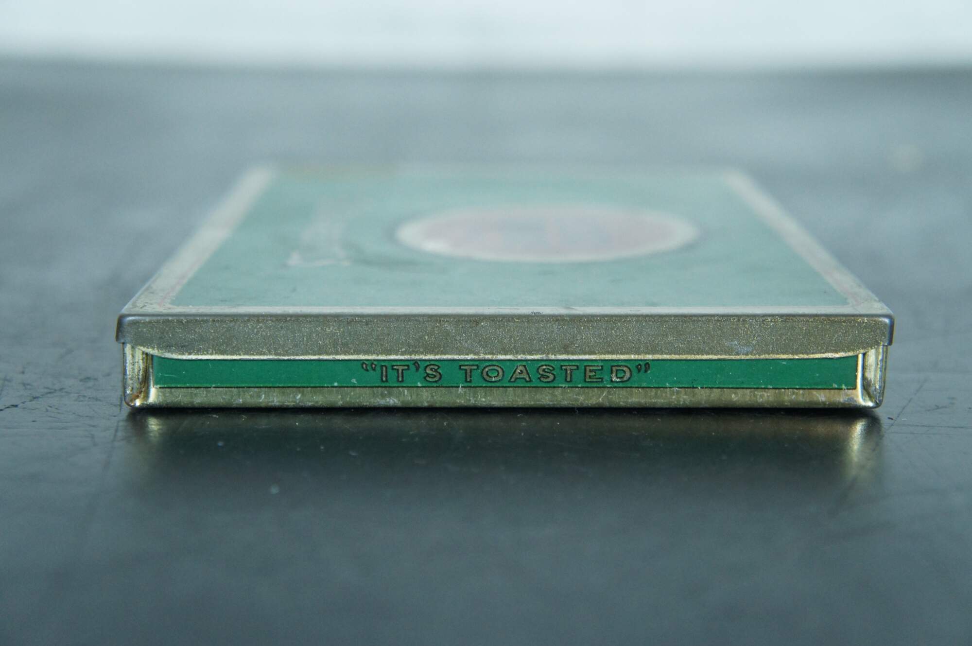 Mid century Lucky Strike, American Tobacco Co ad tin cigarette pack featuring the classic logo with phrase. Made in North Carolina.