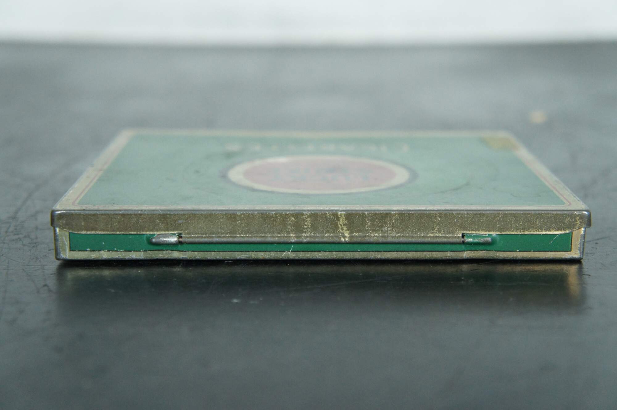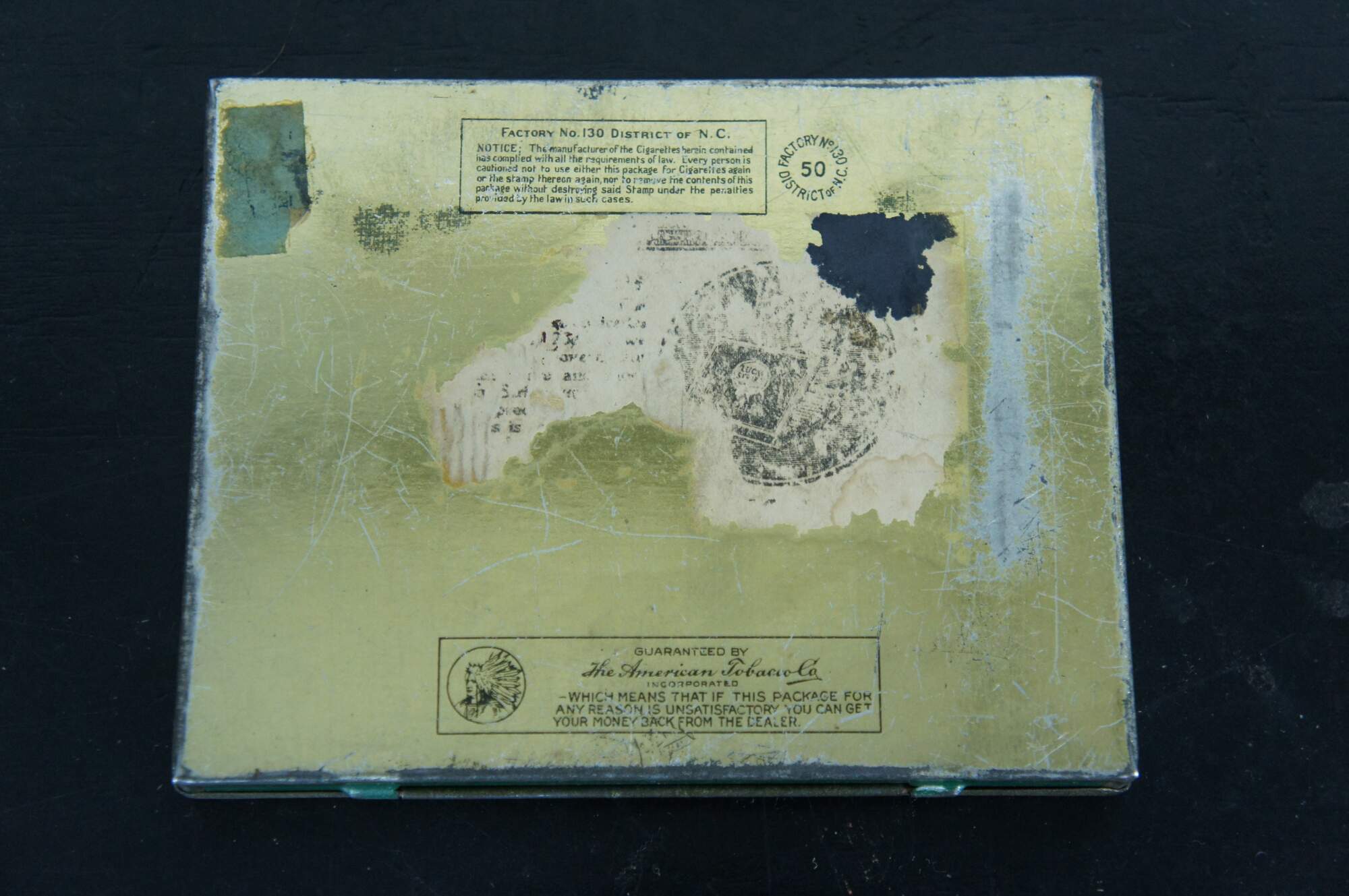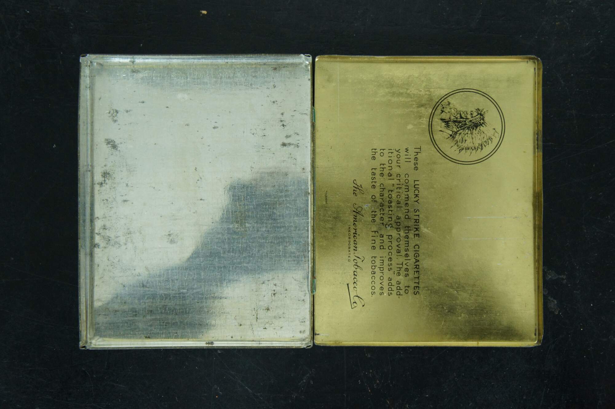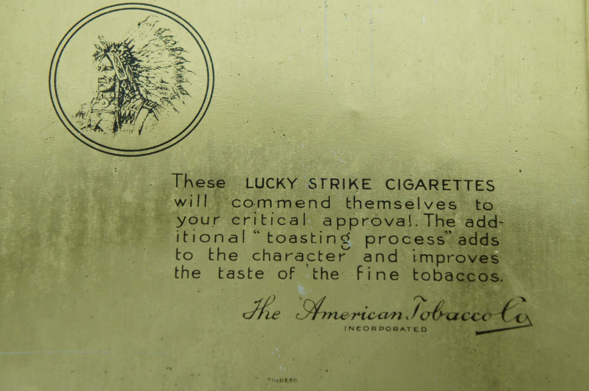 Mid century Lucky Strike, American Tobacco Co ad tin cigarette pack featuring the classic logo with phrase. Made in North Carolina.