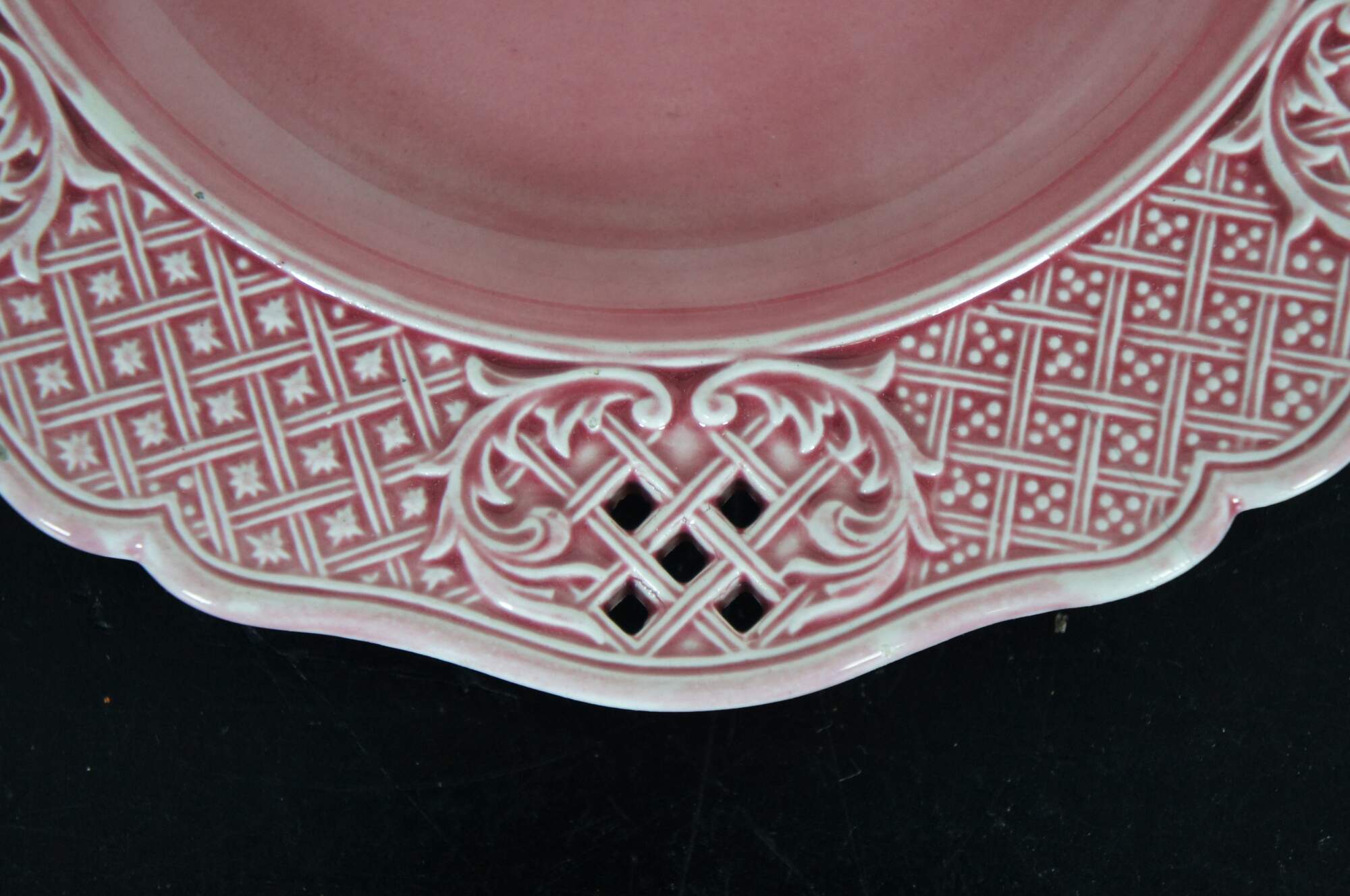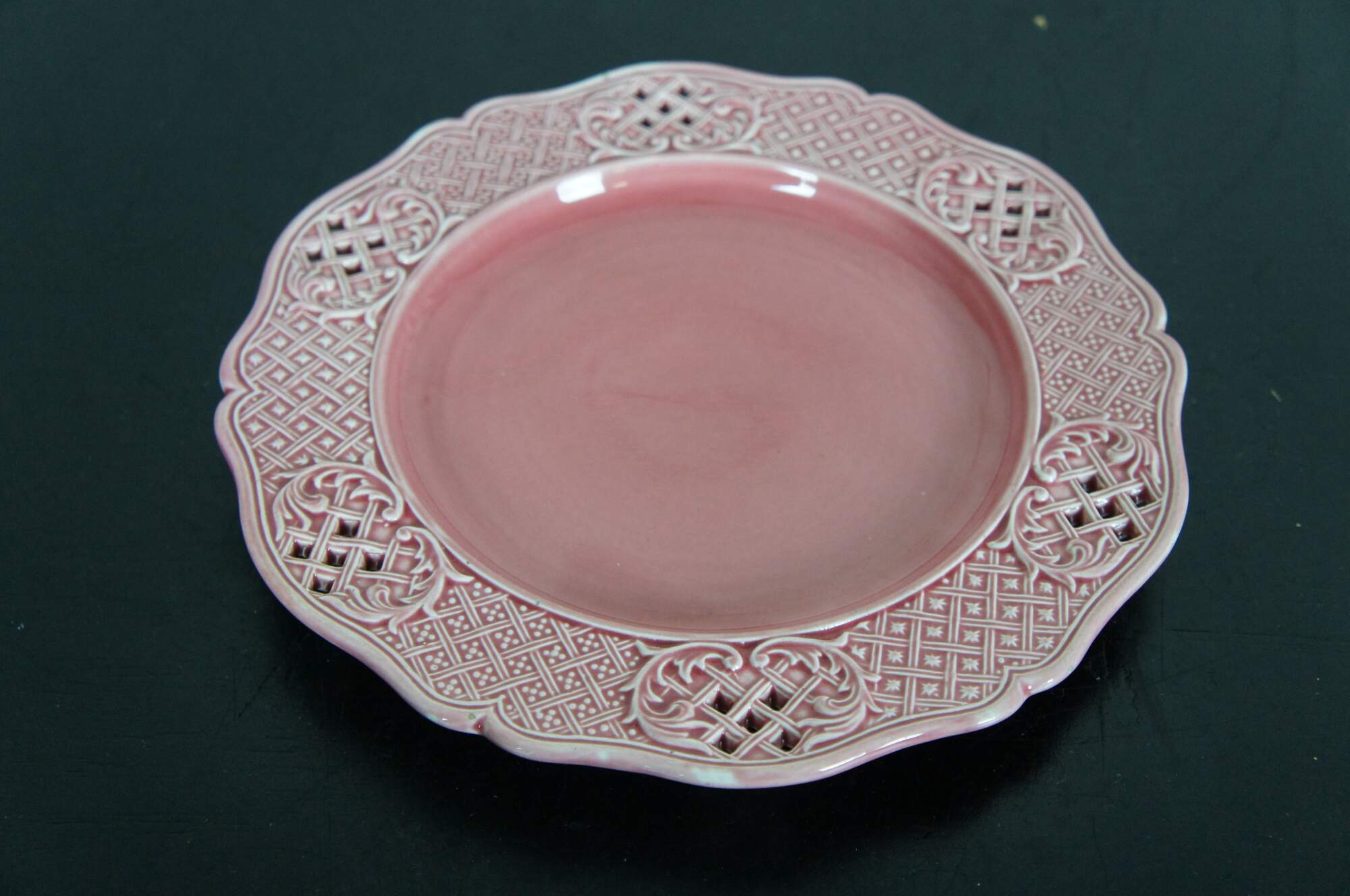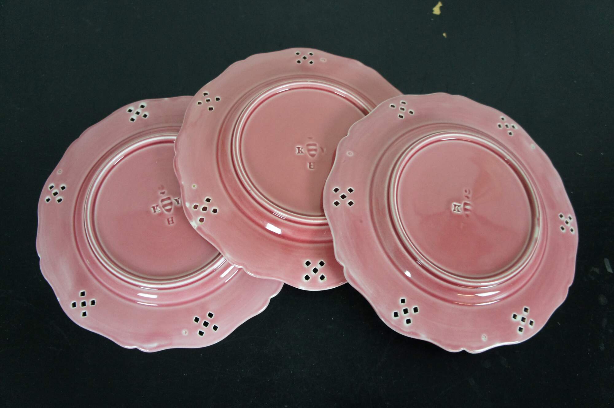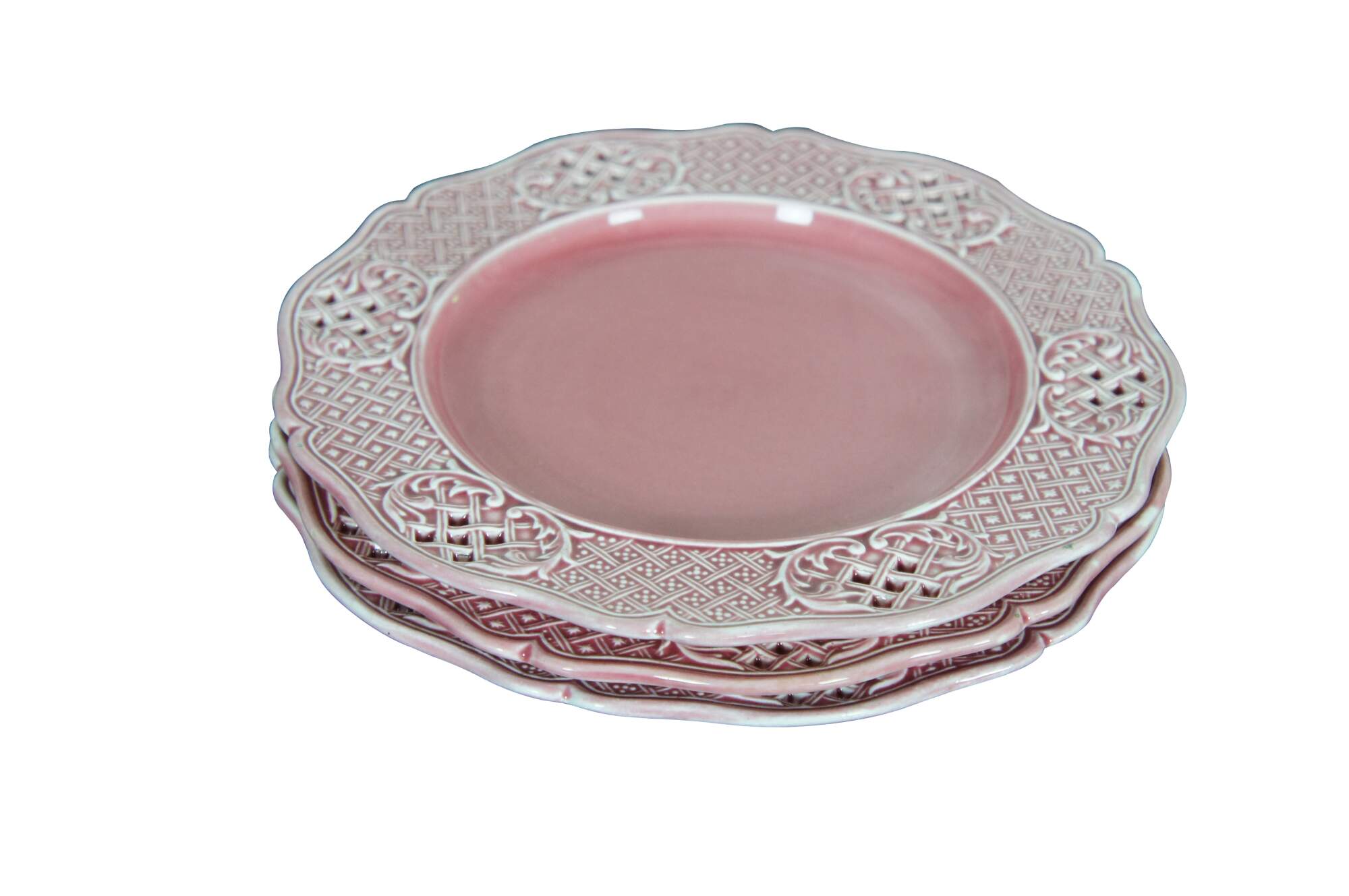Three antique Austrian / Hungarian pink stoneware plates featruing a scalloped pierced basketweave lattice design. Marked with Vienna beehive and K Y H.