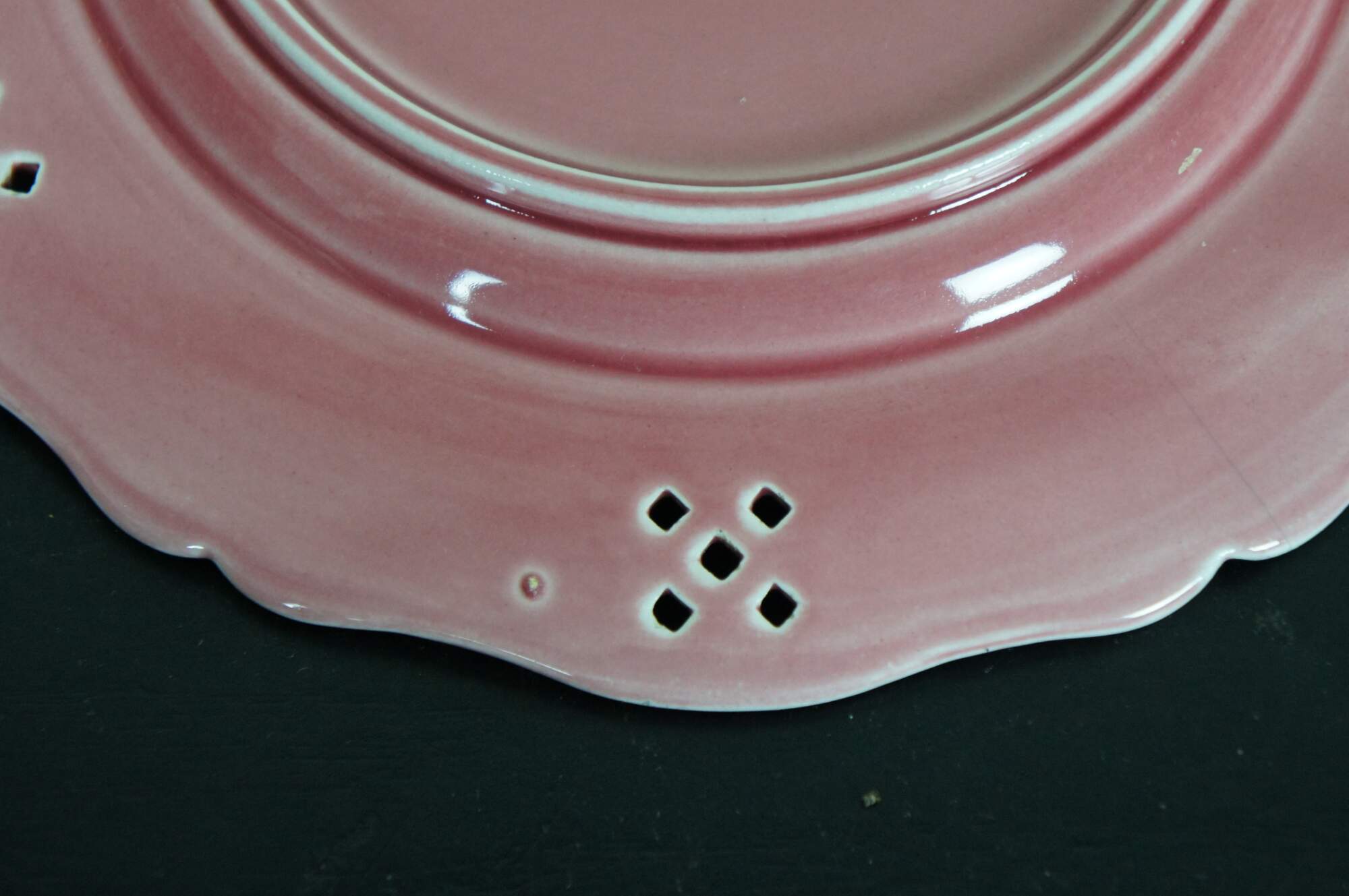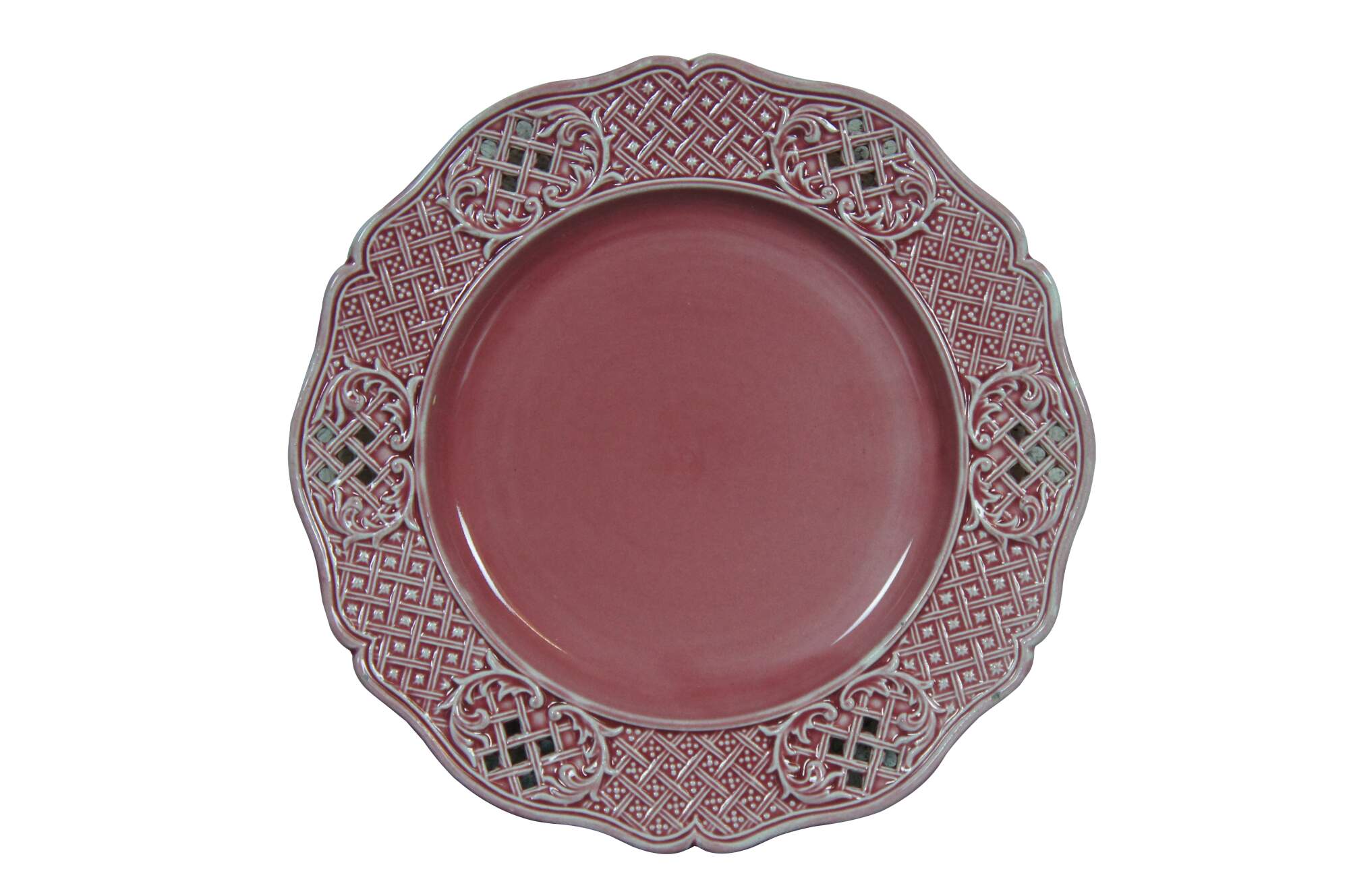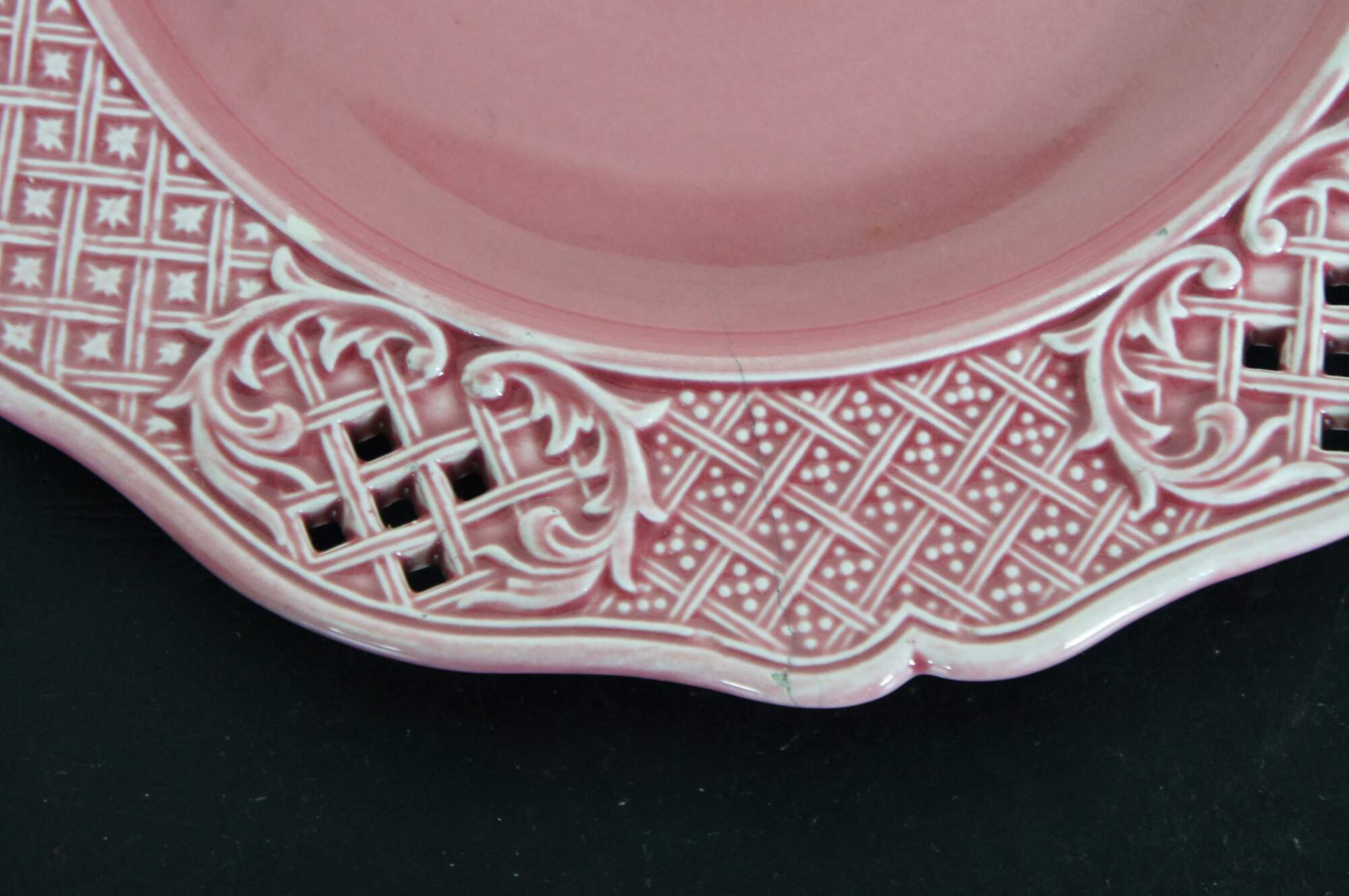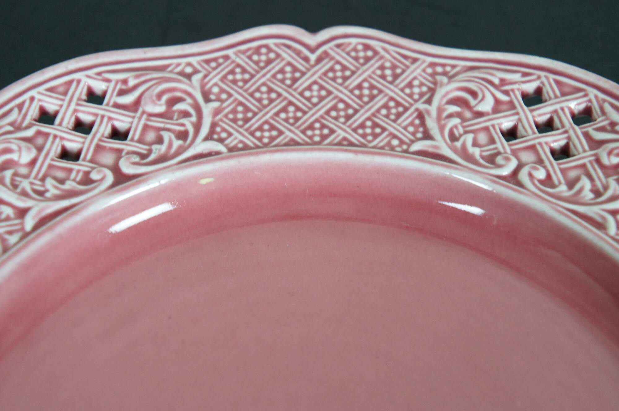 Three antique Austrian / Hungarian pink stoneware plates featruing a scalloped pierced basketweave lattice design. Marked with Vienna beehive and K Y H.